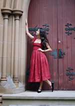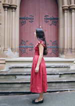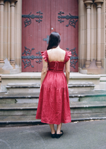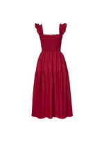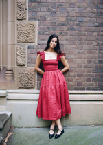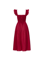 The Hilton dress features frilly sleeves paried with a midi tiered skirt. The fully smocked bodice includes corset-like back detailing and is adorned with self-tied ribbons.