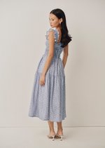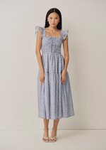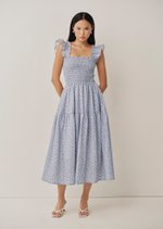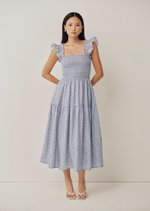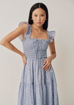 The Hilton dress features frilly sleeves paried with a midi tiered skirt. The fully smocked bodice includes corset-like back detailing and is adorned with self-tied ribbons.
