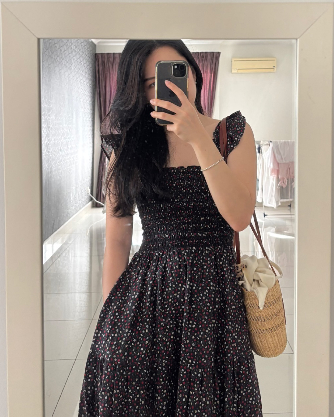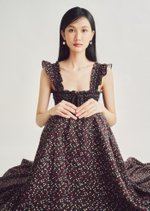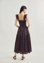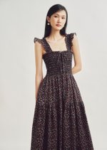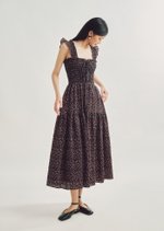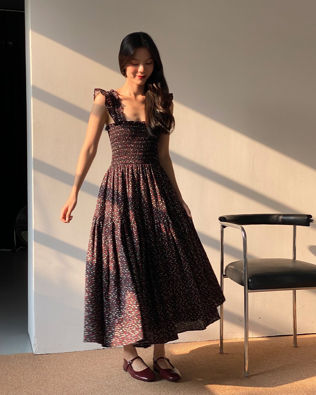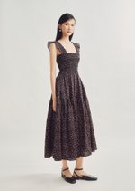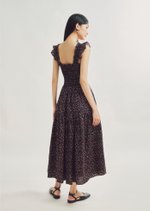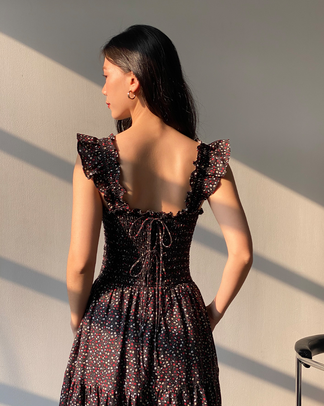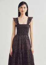 The Hilton dress features frilly sleeves paired with a midi tiered skirt. The fully smocked bodice includes corset-like back detailing and is adorned with self-tied ribbons.