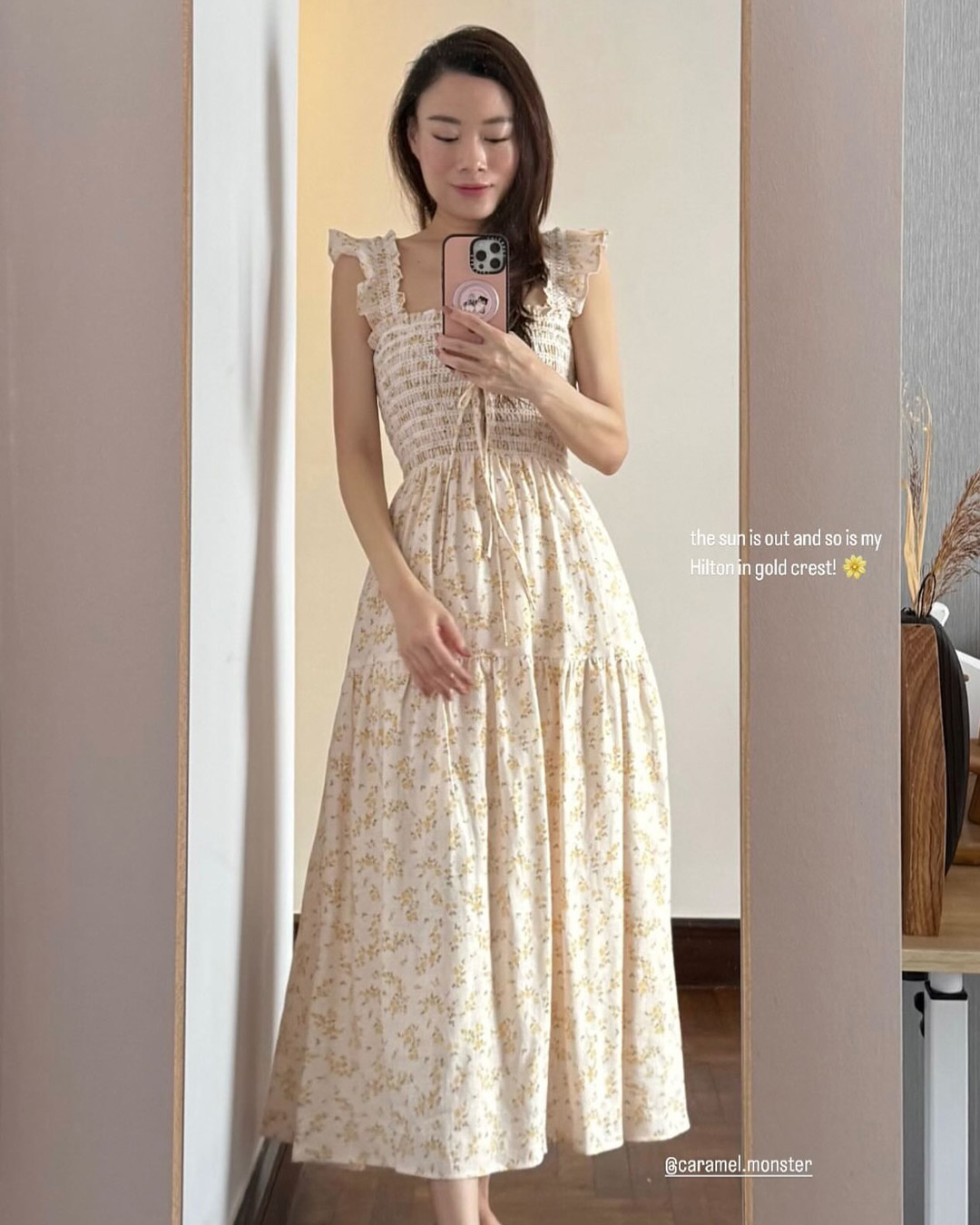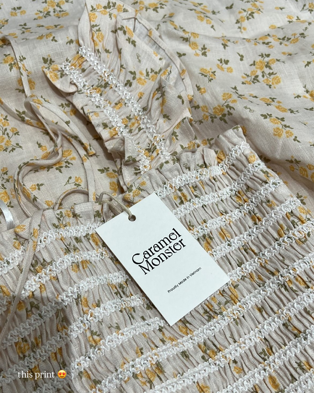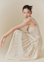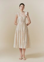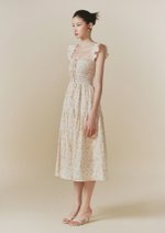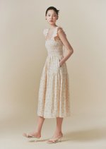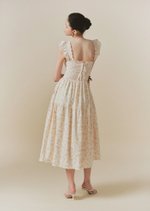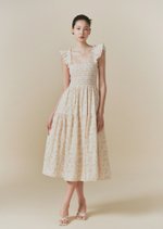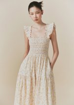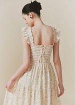 The Hilton dress features frilly sleeves paried with a midi tiered skirt. The fully smocked bodice includes corset-like back detailing and is adorned with self-tied ribbons.
