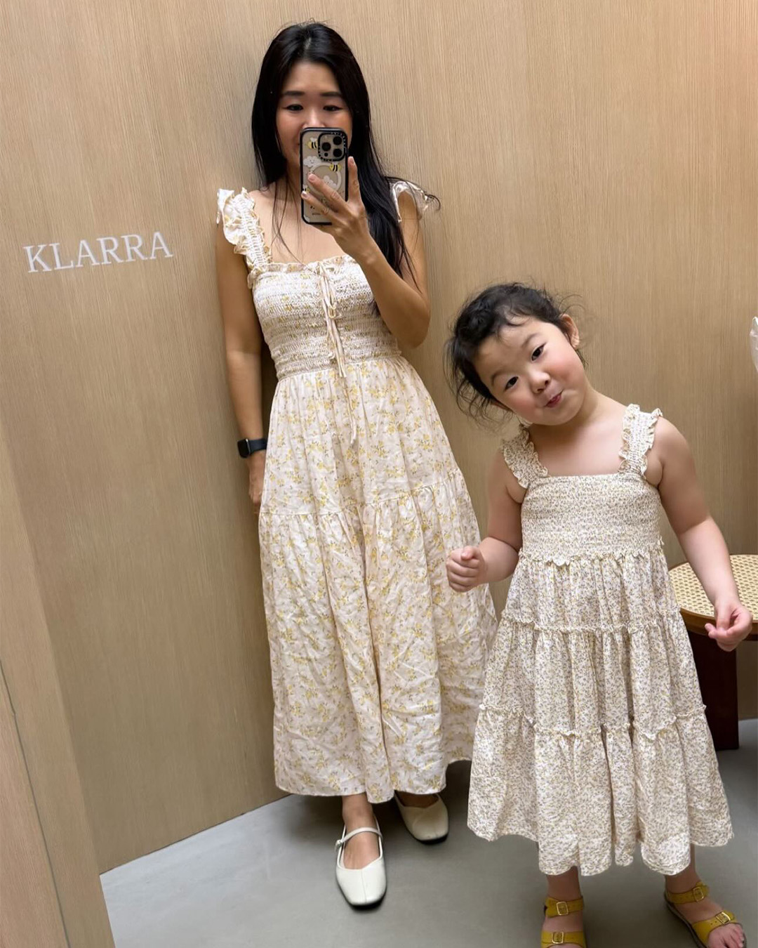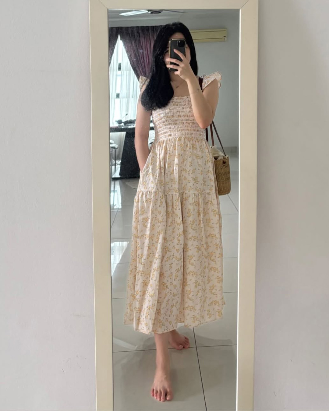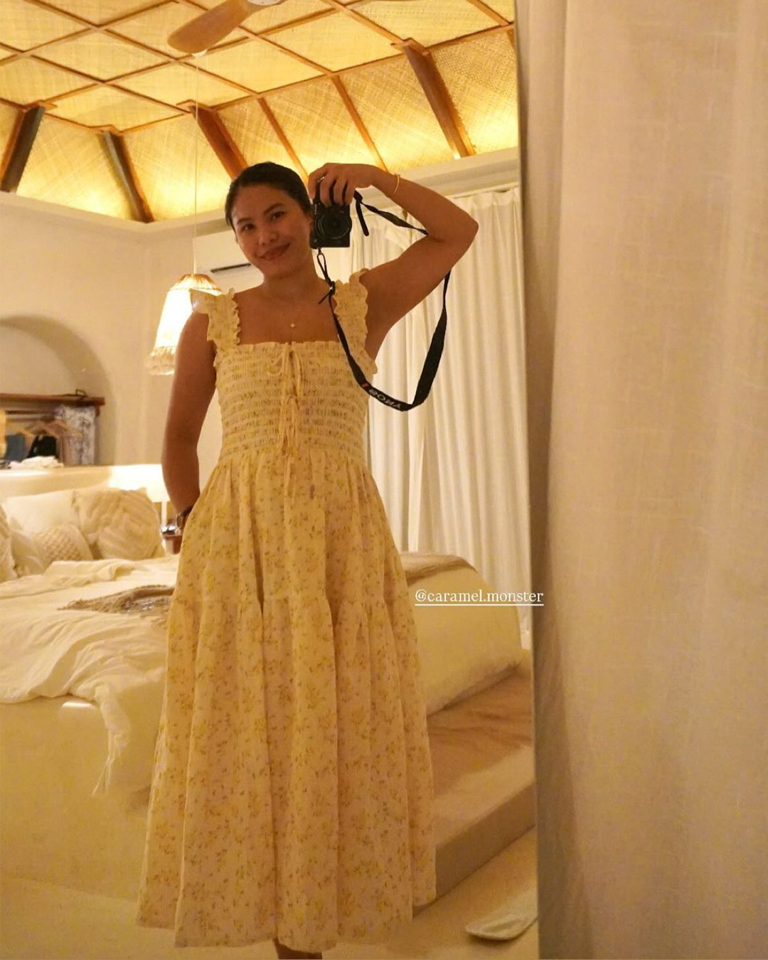 The Hilton dress features frilly sleeves paried with a midi tiered skirt. The fully smocked bodice includes corset-like back detailing and is adorned with self-tied ribbons.