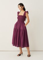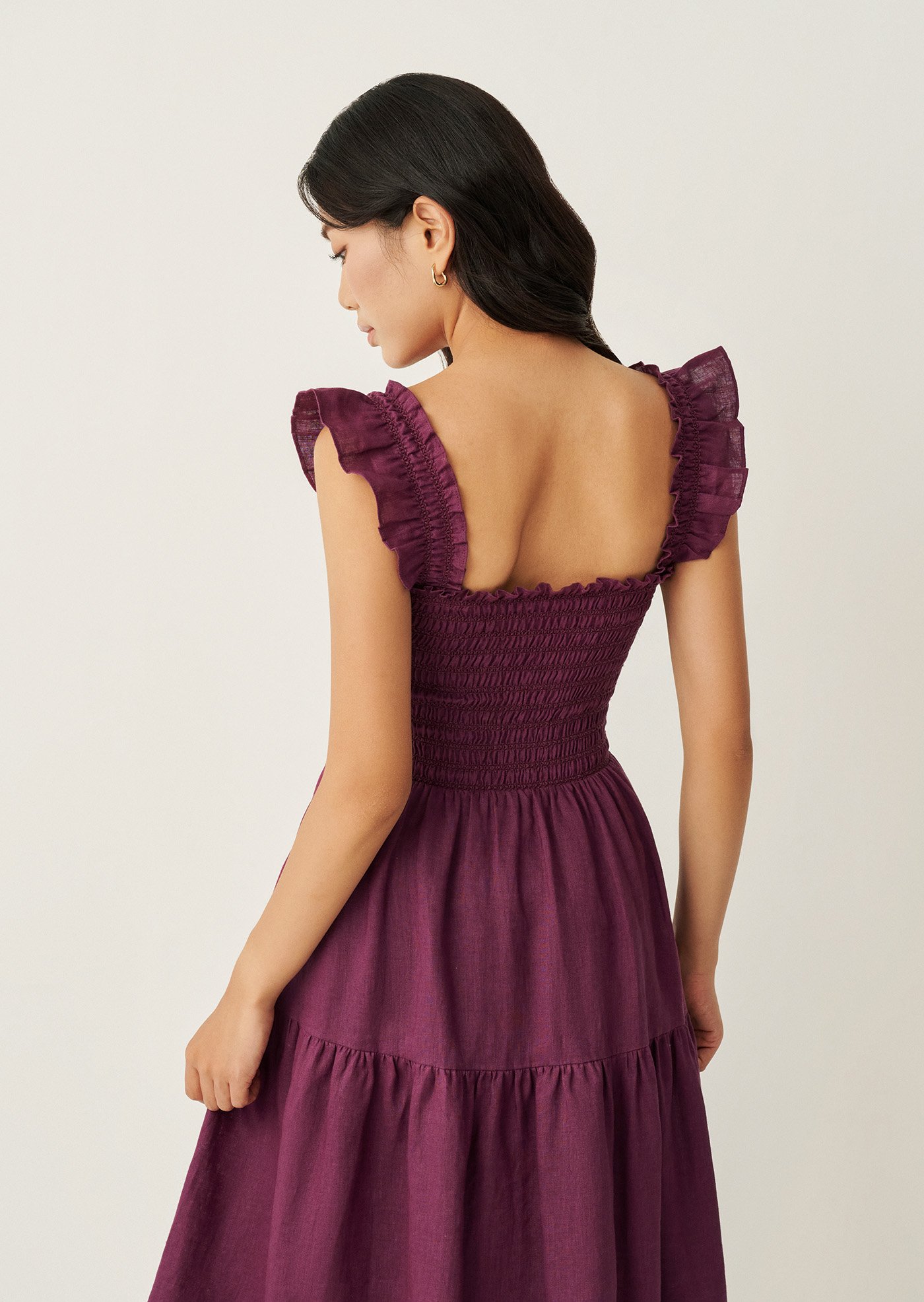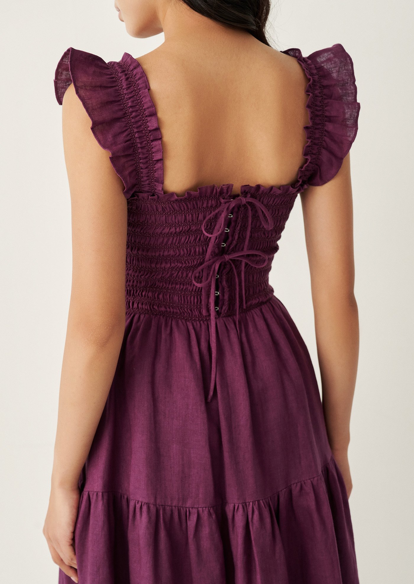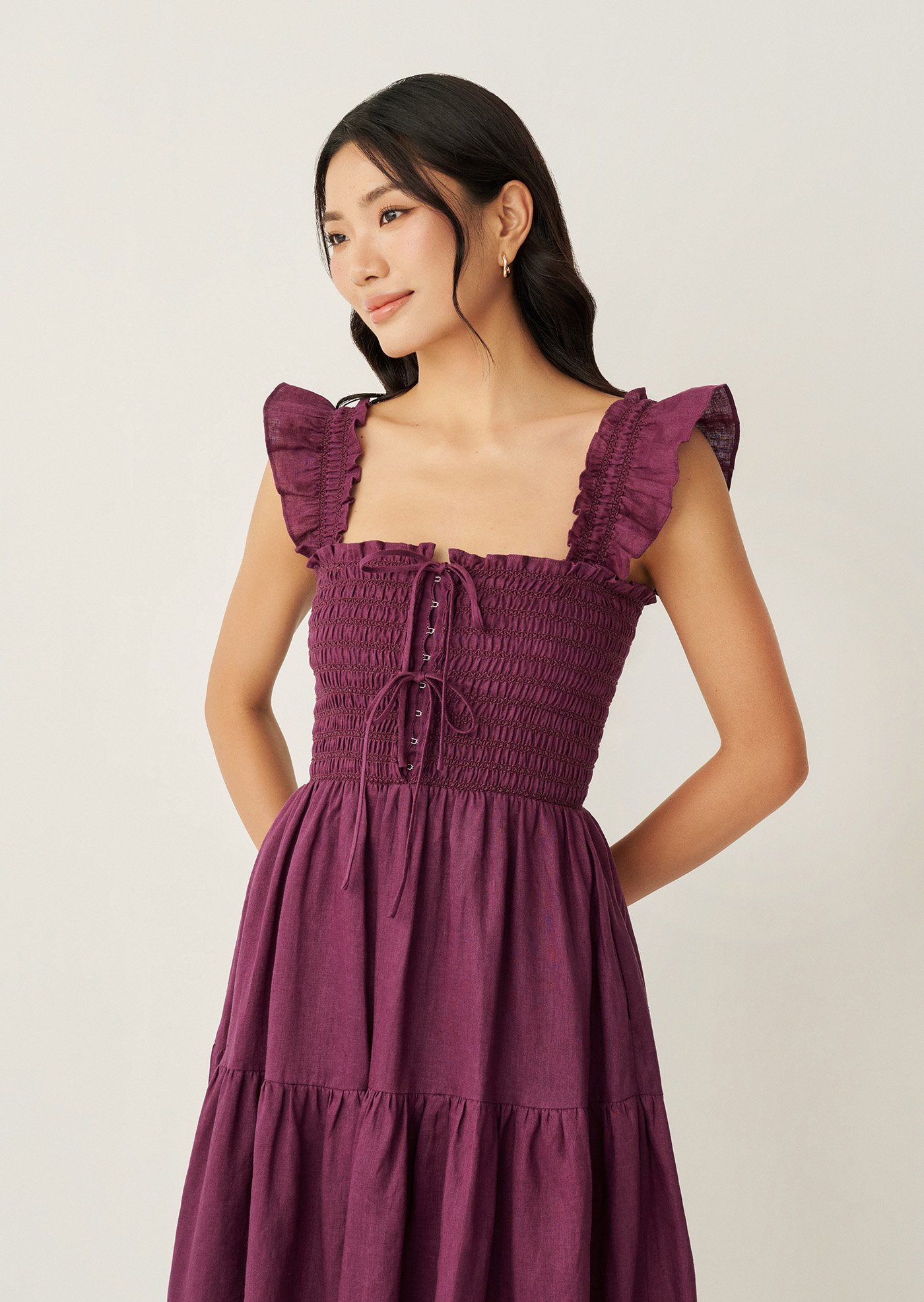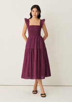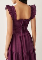 The Hilton dress features frilly sleeves paried with a midi tiered skirt. The fully smocked bodice includes corset-like back detailing and is adorned with self-tied ribbons.