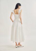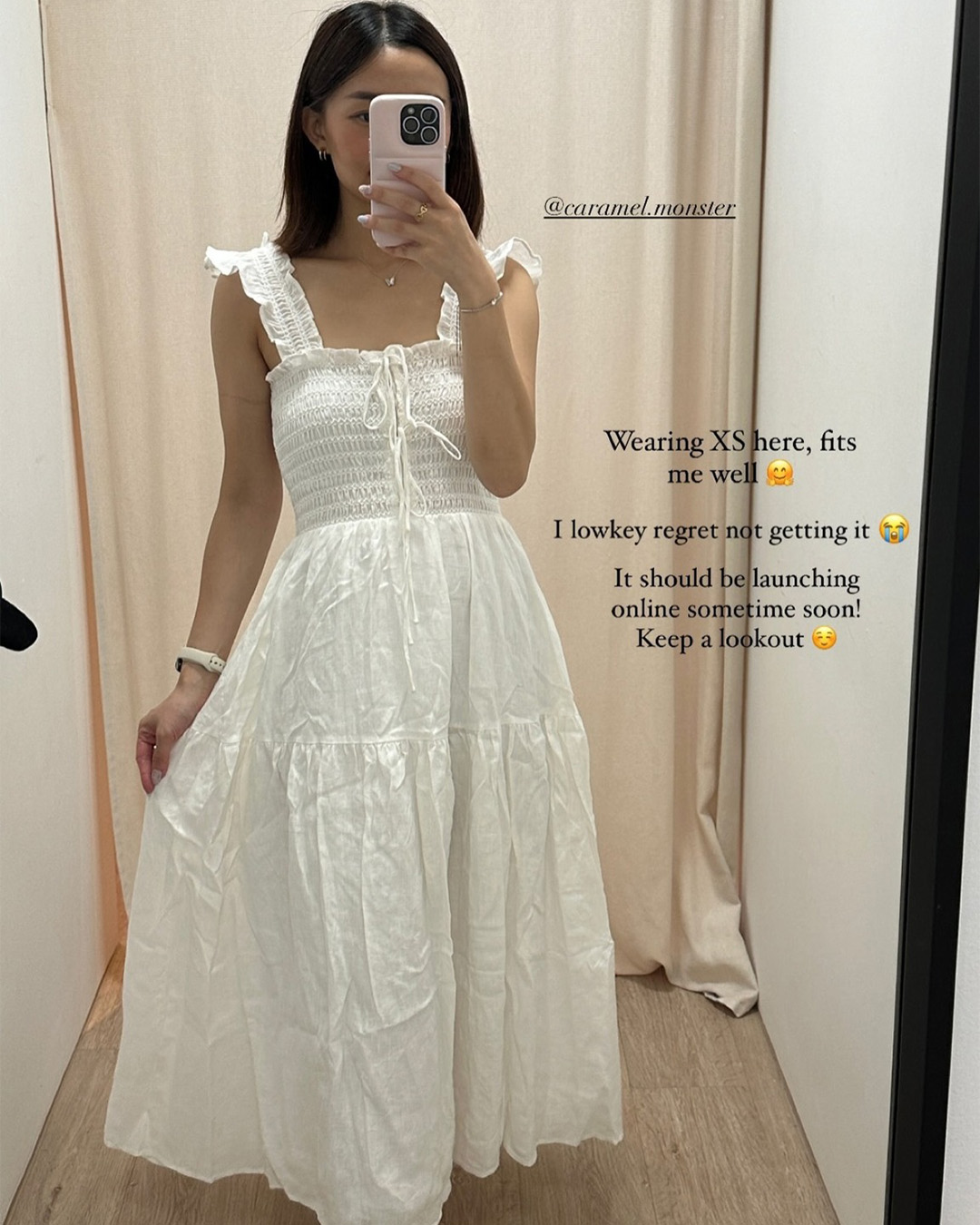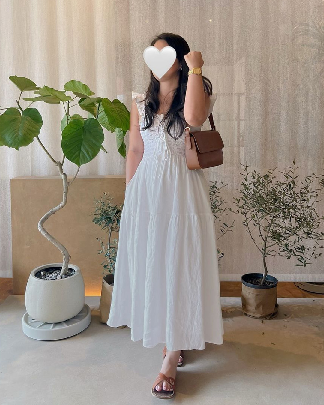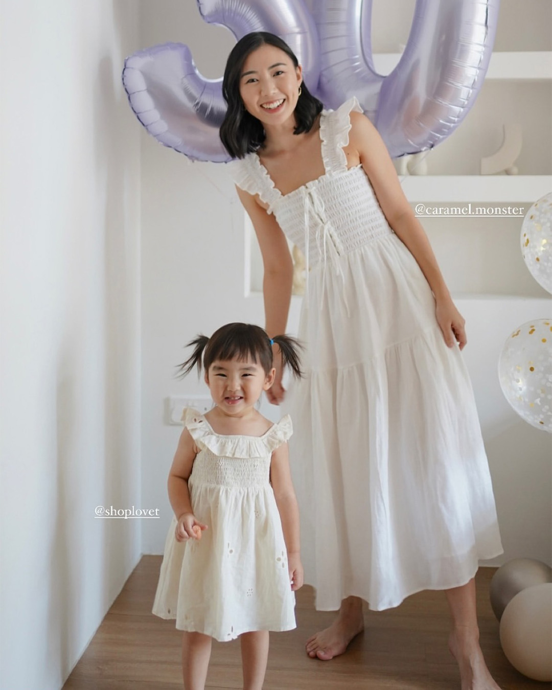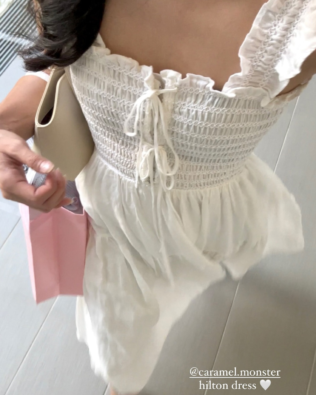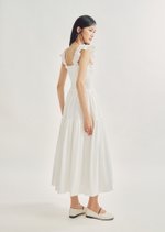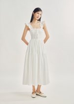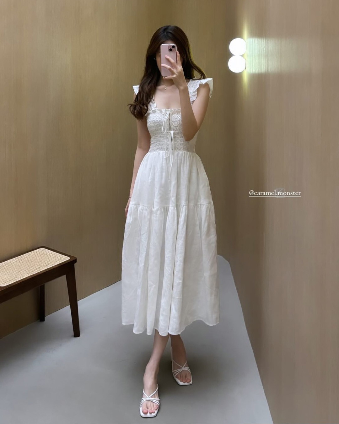The Hilton dress features frilly sleeves paried with a midi tiered skirt. The fully smocked bodice includes corset-like back detailing and is adorned with self-tied ribbons.
