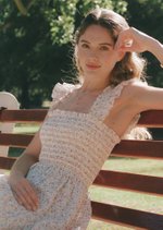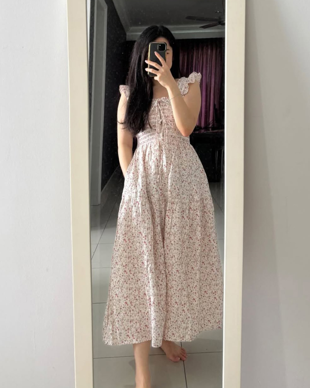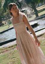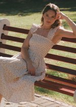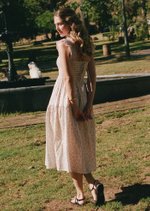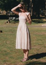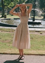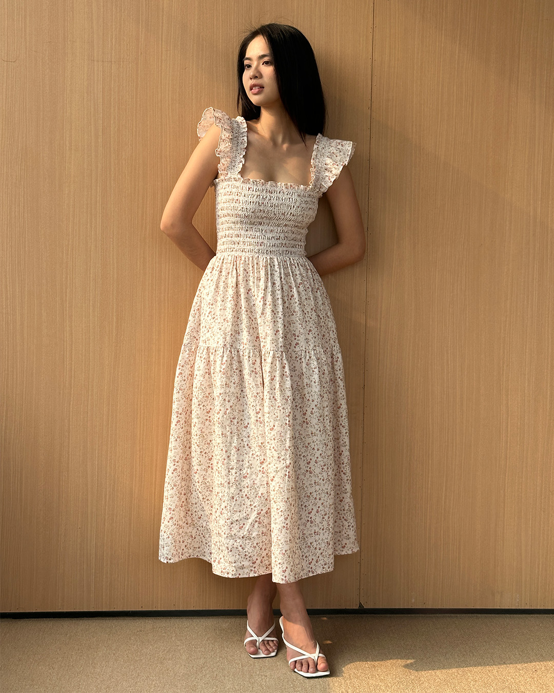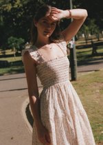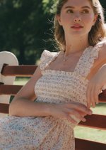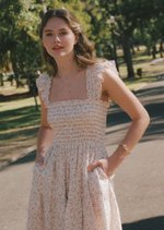 The Hilton dress features frilly sleeves paired with a midi tiered skirt. The fully smocked bodice includes corset-like back detailing and is adorned with self-tied ribbons.