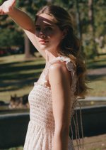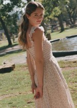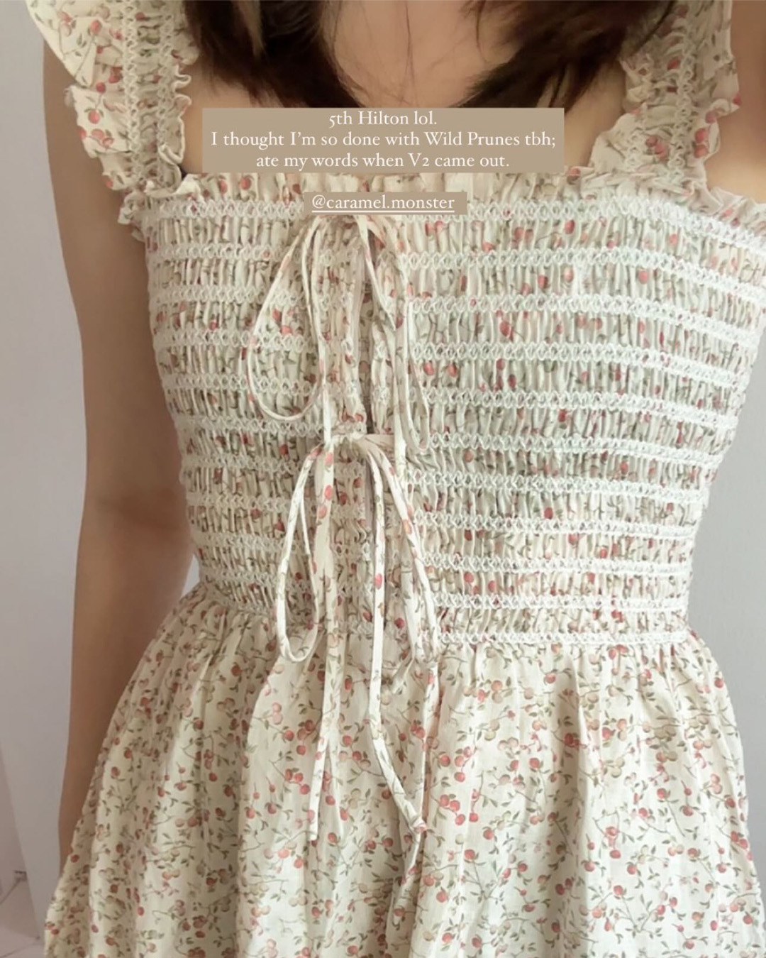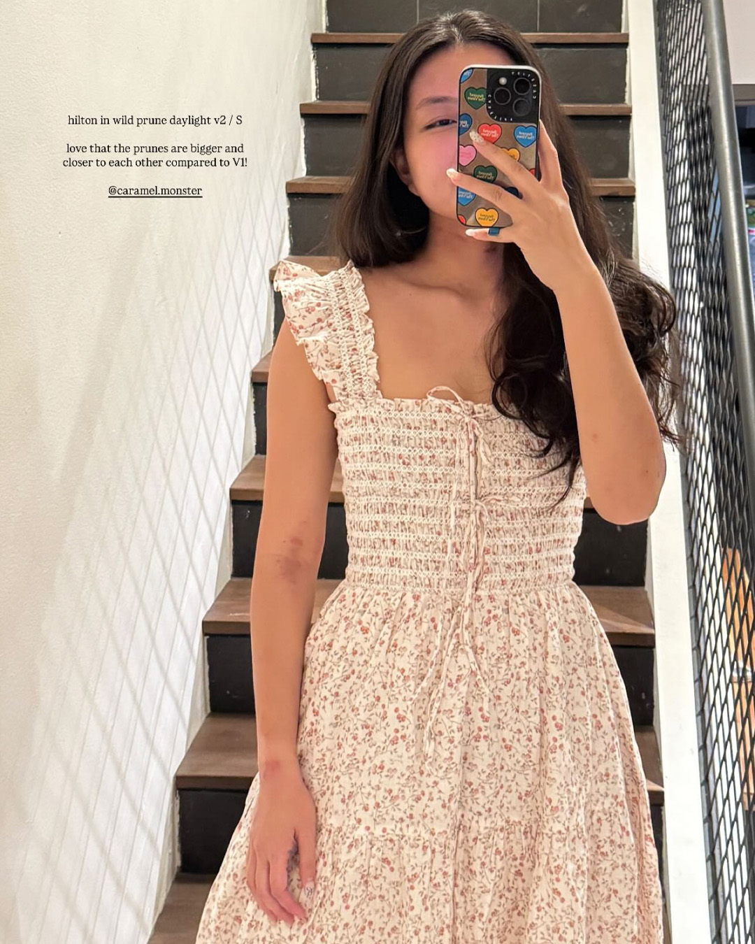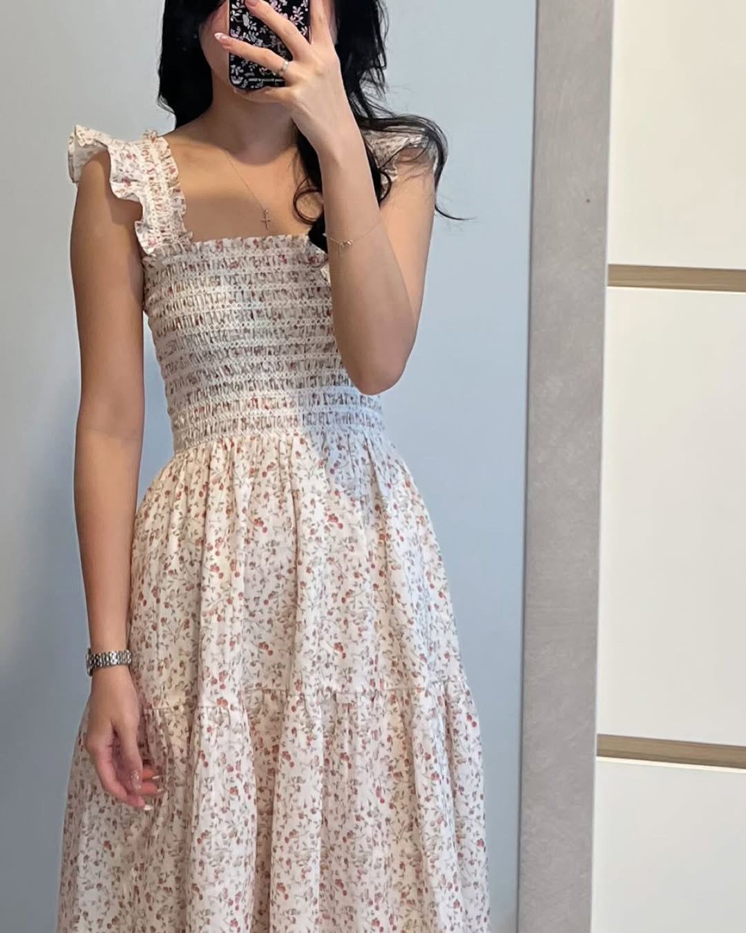 The Hilton dress features frilly sleeves paired with a midi tiered skirt. The fully smocked bodice includes corset-like back detailing and is adorned with self-tied ribbons.