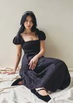 Meet Jackie, the perfect midi dress featuring puffed sleeves and a ruched bodice adorned with delicate lace detailing. The perfect choice for effortlessly dressing up your Sunday brunch date.