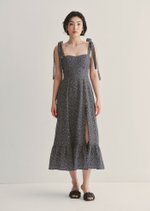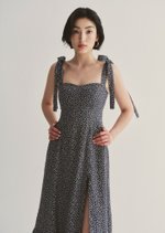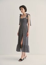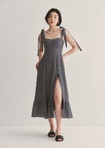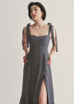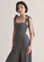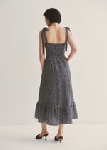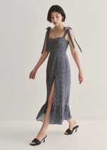 The Jessy midi dress features a sweet sweetheart neckline and delightful self-tie straps, creating a lovely fit-and-flare silhouette. With a fully lined design and ruffle panel at the hem, it adds a charming touch to any occasion.