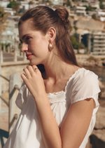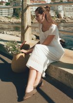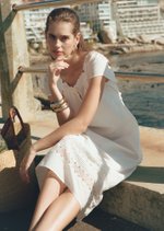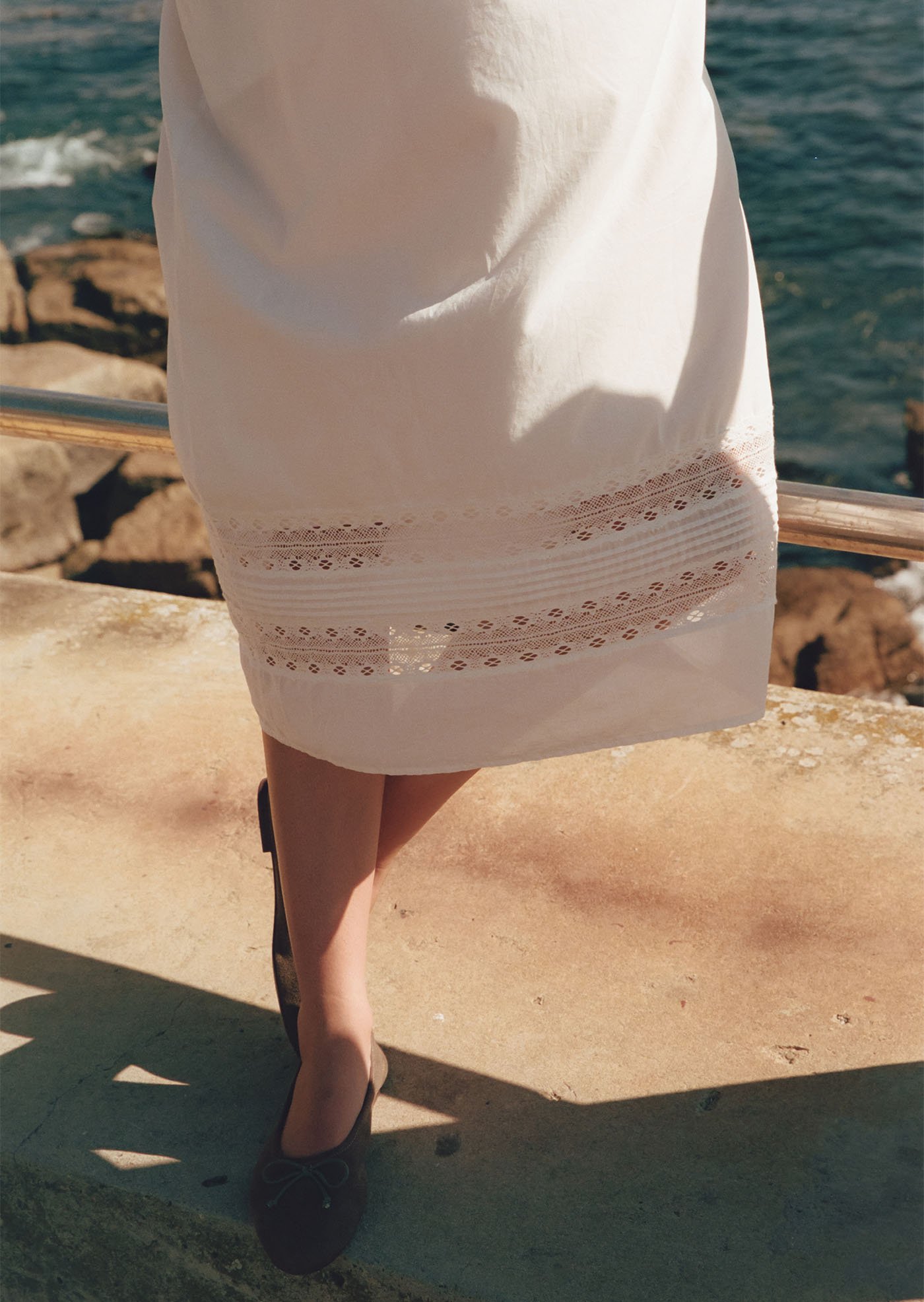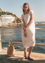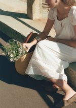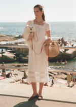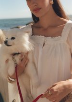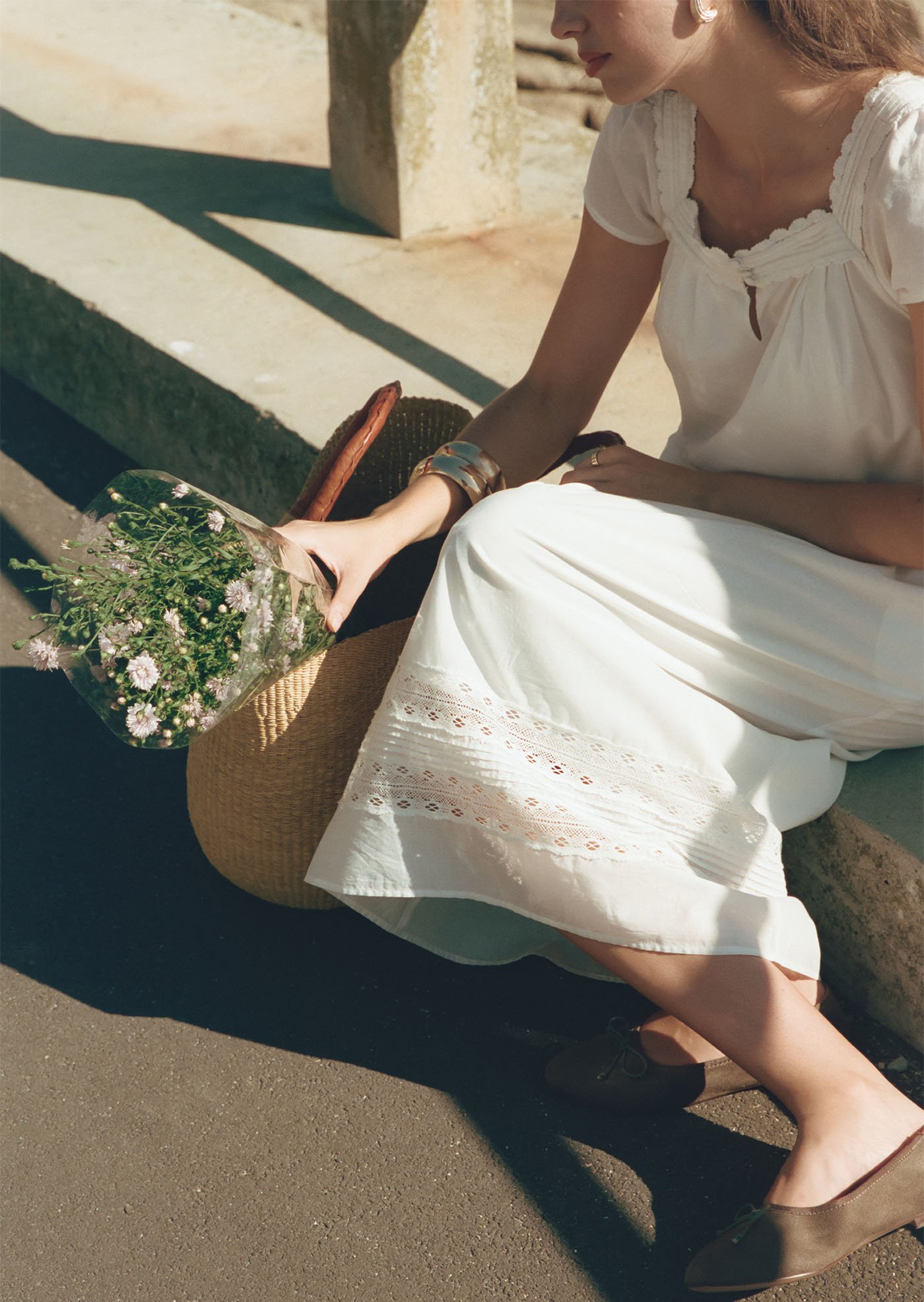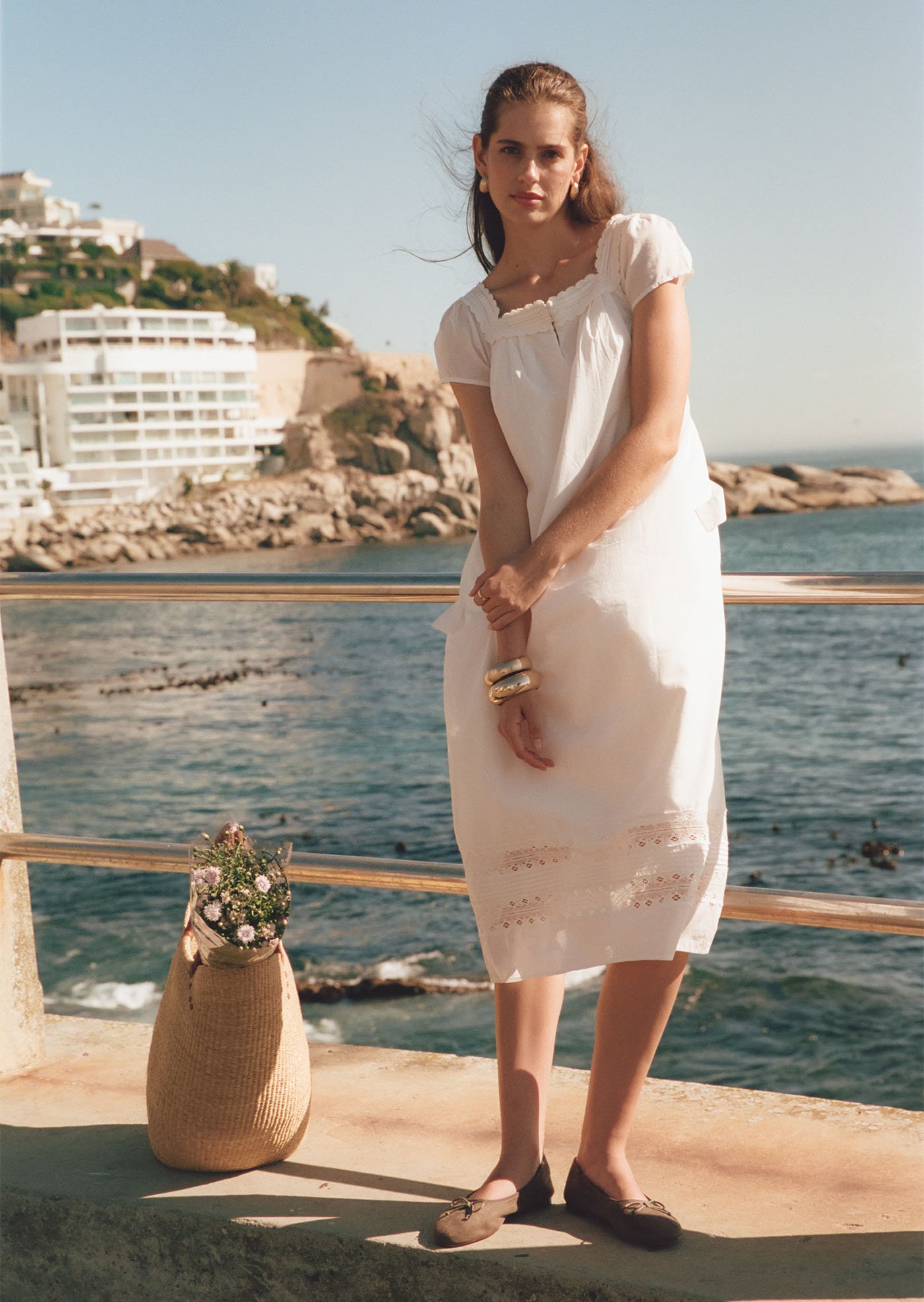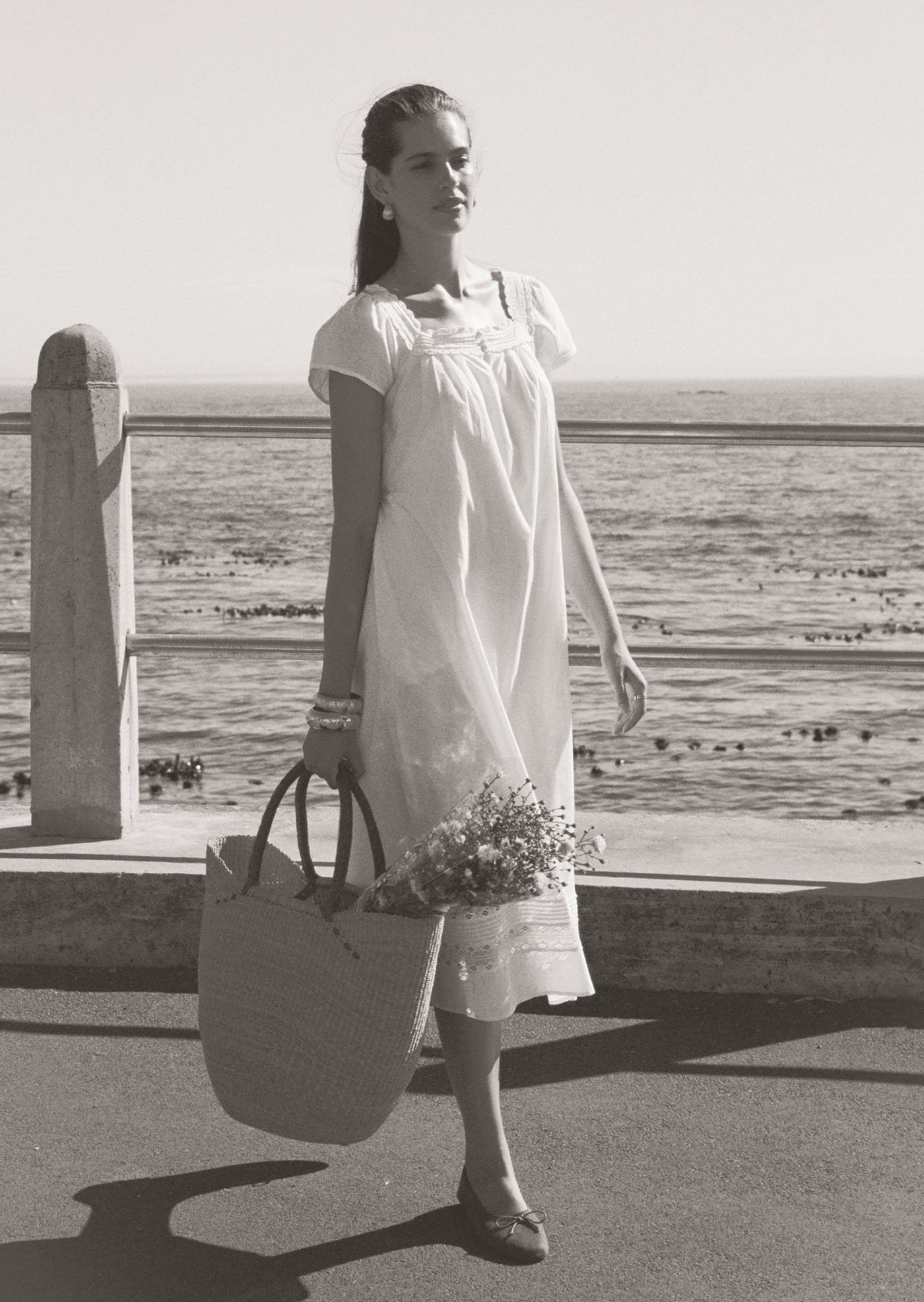 The Jinelle Midaxi Dress features a softly gathered silhouette with delicate pintuck and lace trims along the neckline. Designed with a relaxed shape and an optional waist tie, it brings a timeless, easy elegance to everyday dressing.