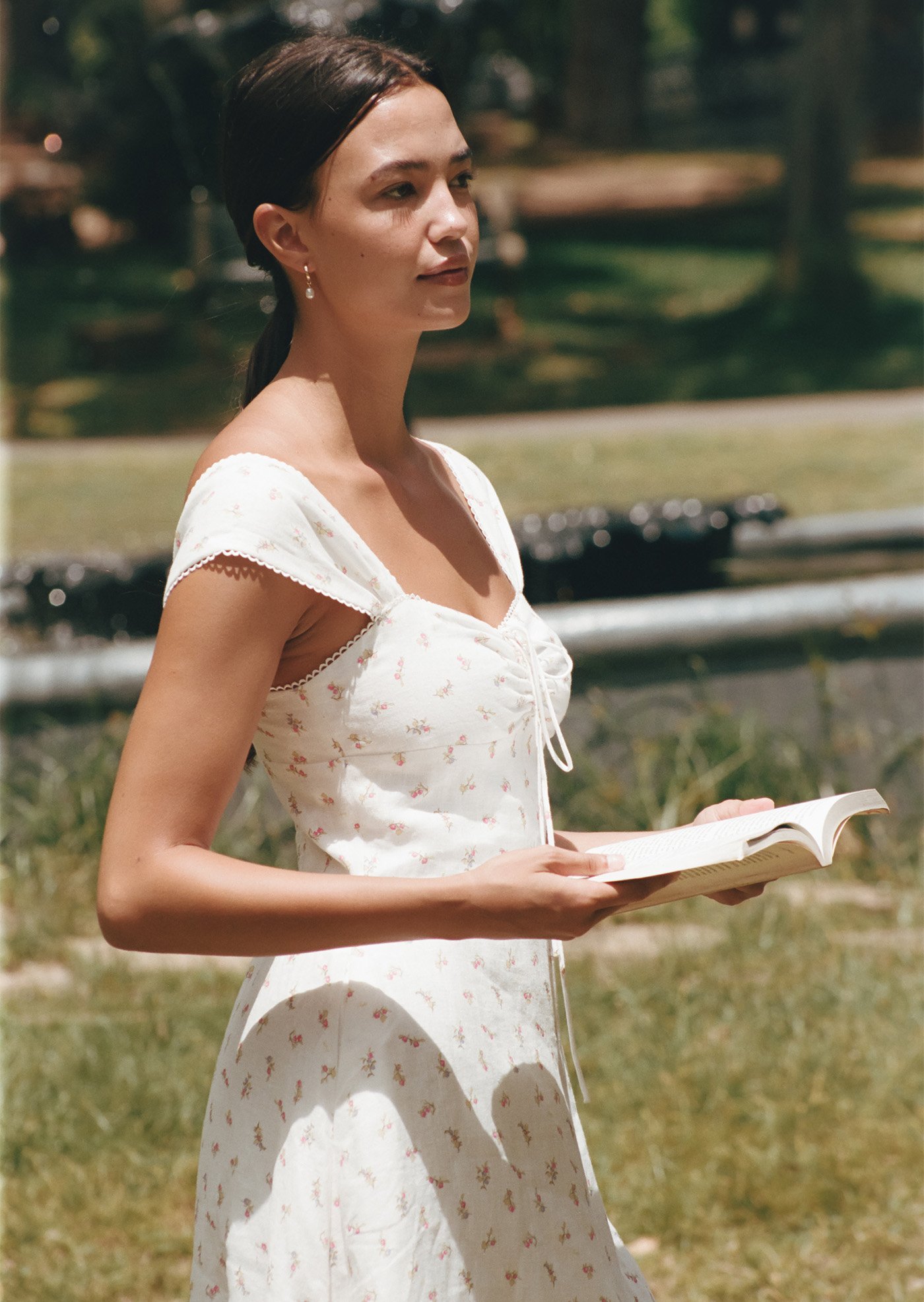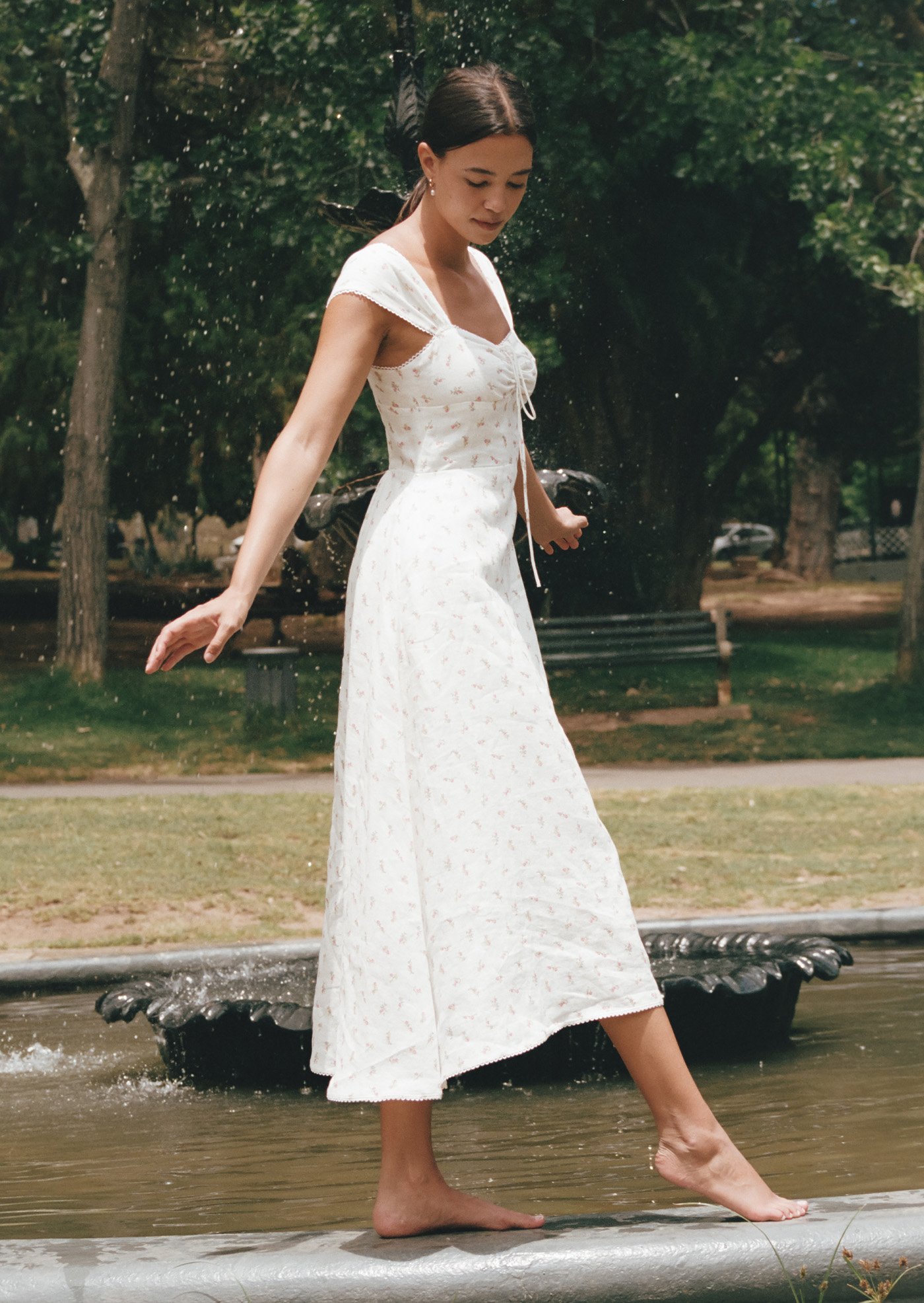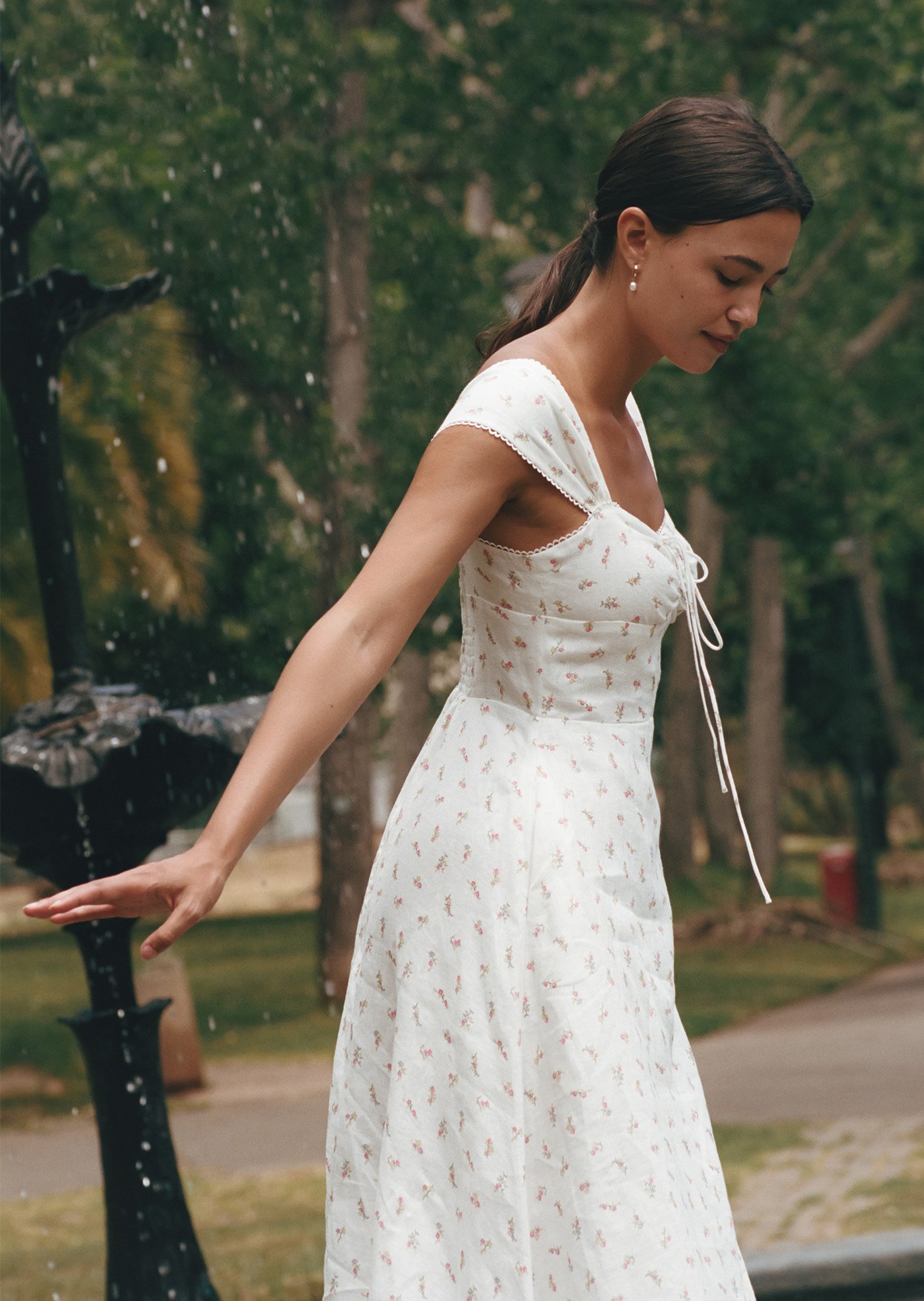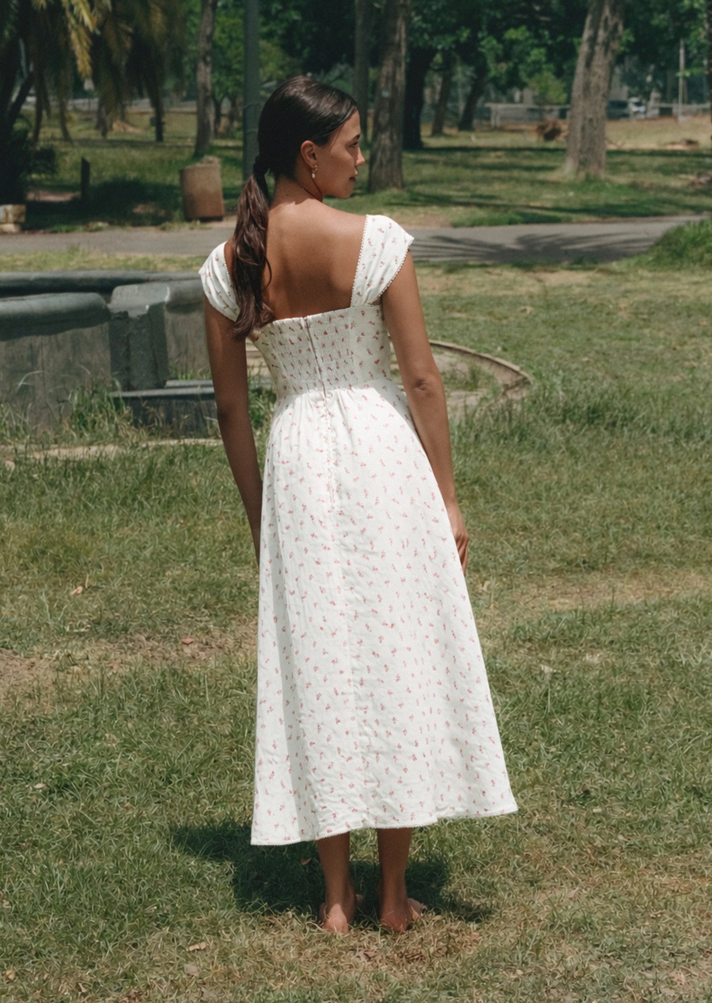 The Johanson Midi Dress features a delicate floral print on airy cotton, designed with a gentle sweetheart neckline and a softly fitted bodice that flows into an easy midi skirt. Made for slow afternoons, garden walks, and everyday elegance.