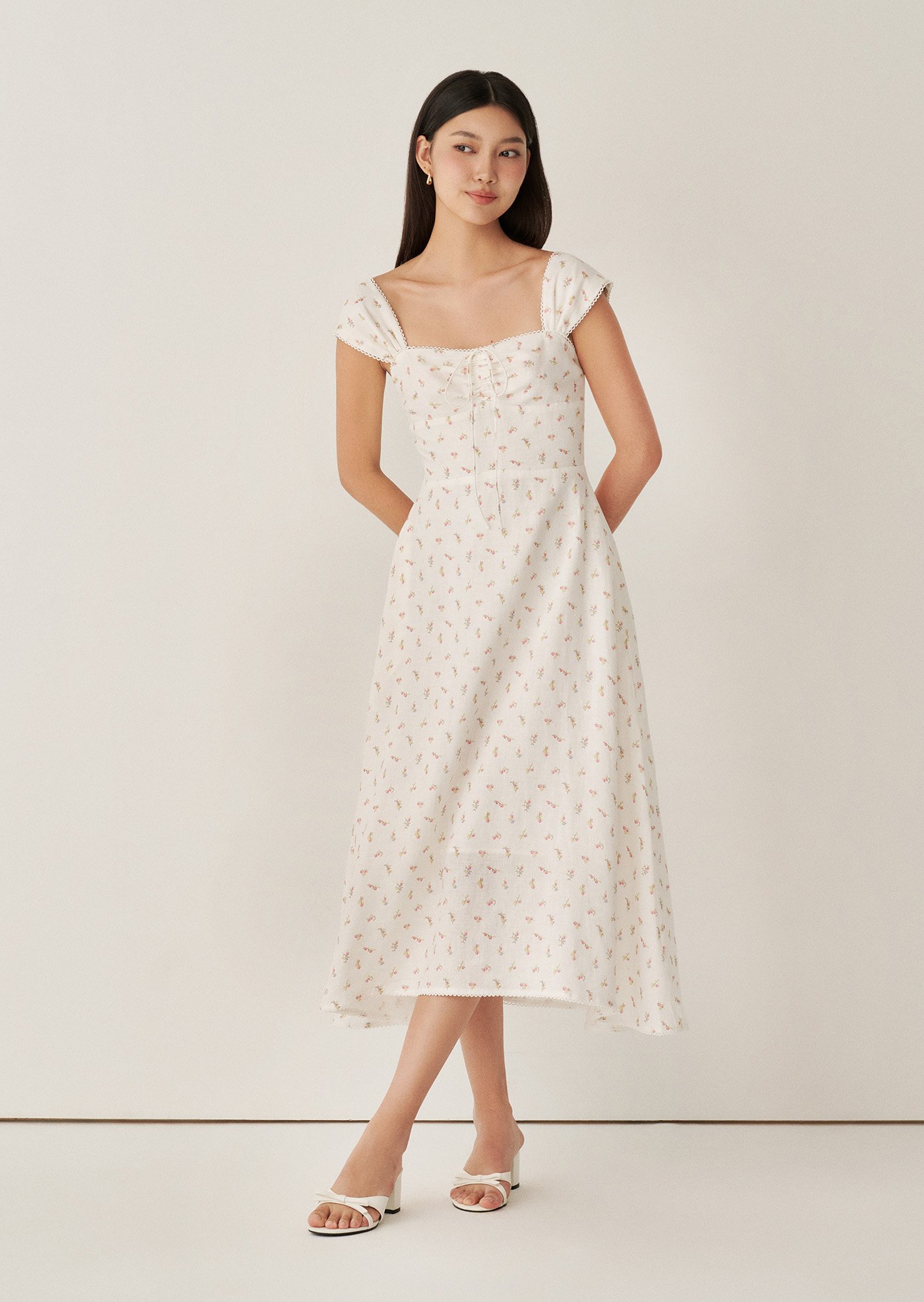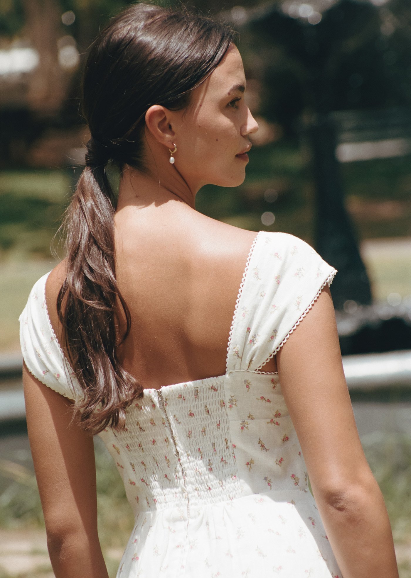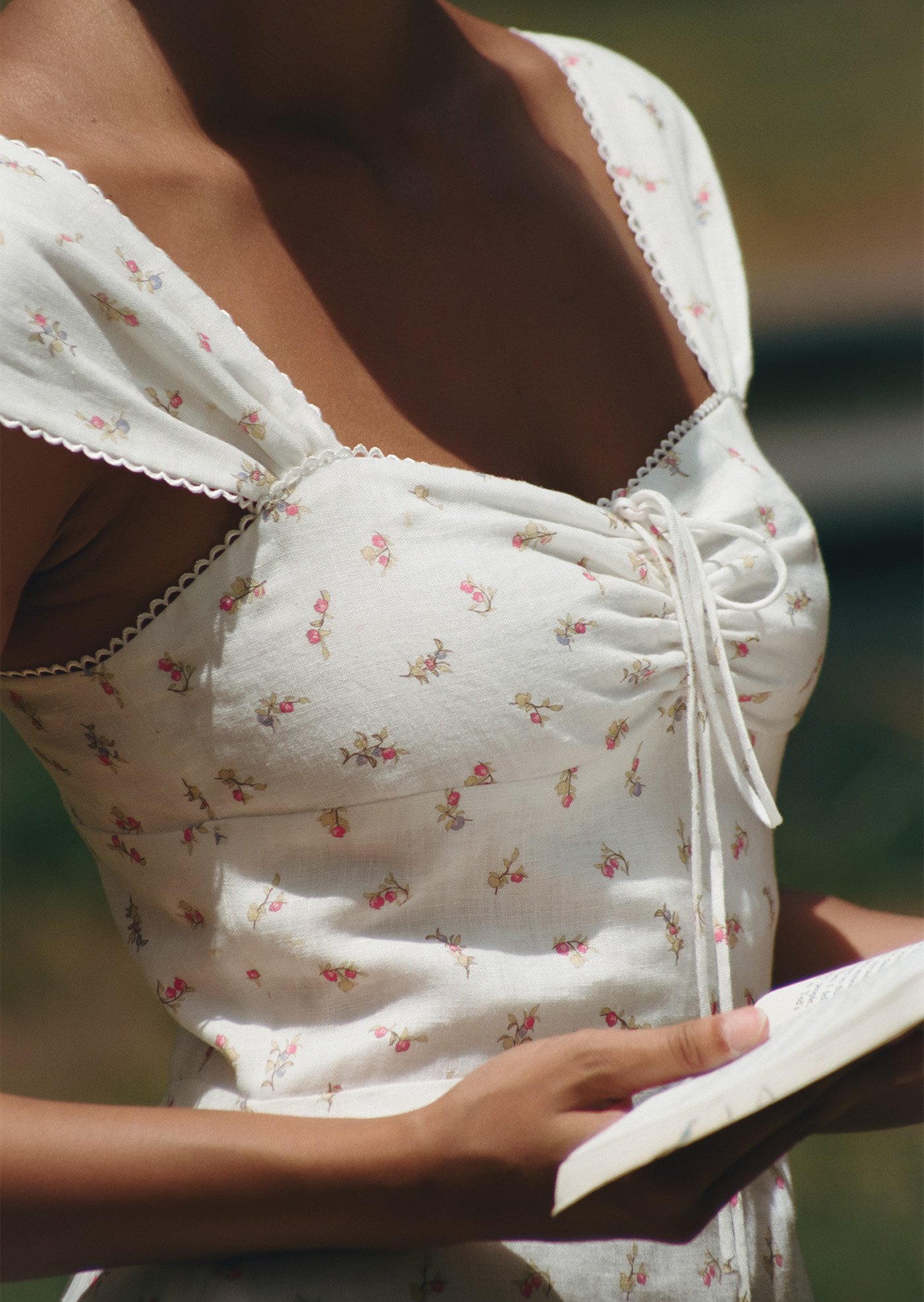The Johanson Midi Dress features a delicate floral print on airy cotton, designed with a gentle sweetheart neckline and a softly fitted bodice that flows into an easy midi skirt. Made for slow afternoons, garden walks, and everyday elegance.