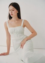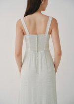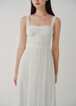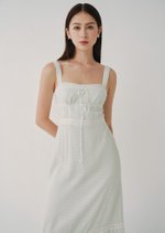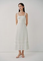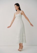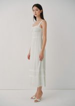 The Jora midaxi dress showcases a lovely square neckline and delicate lace trimming panels. With its sleeveless design, charming self-tie ribbon, and fully lined silhouette, it offers effortless elegance for any occasion.
