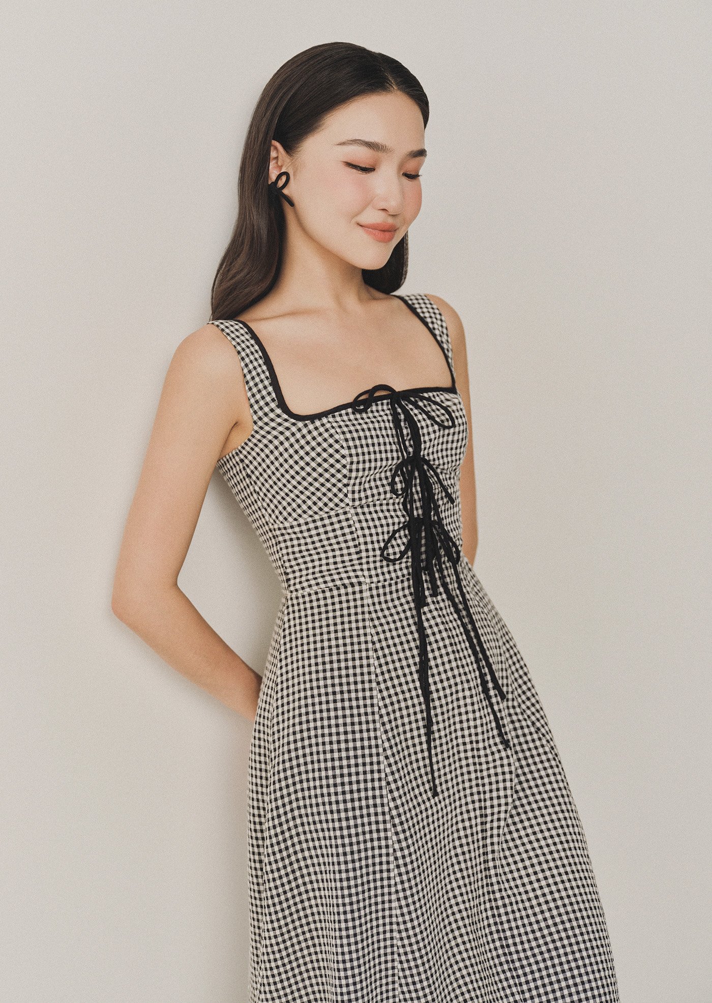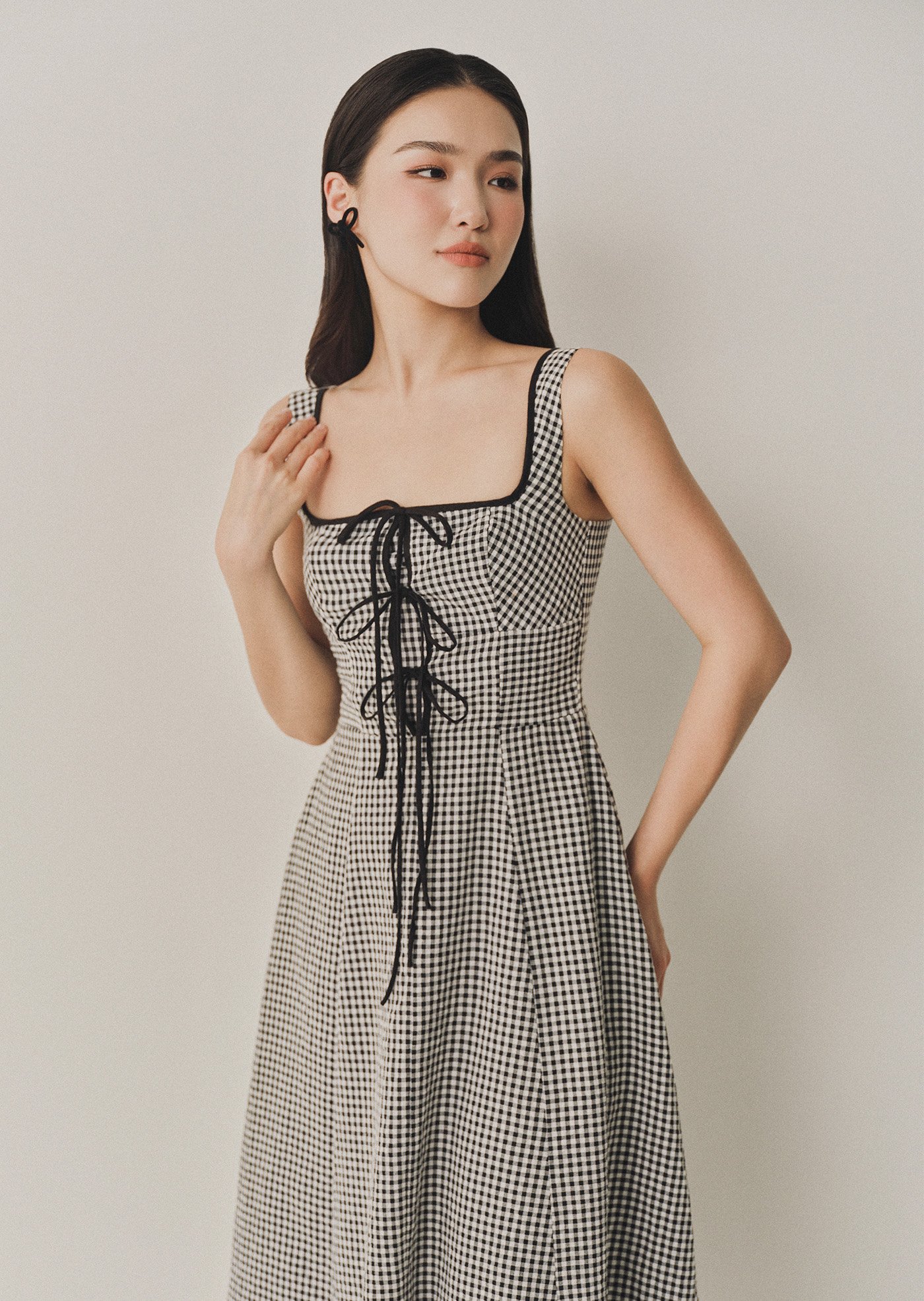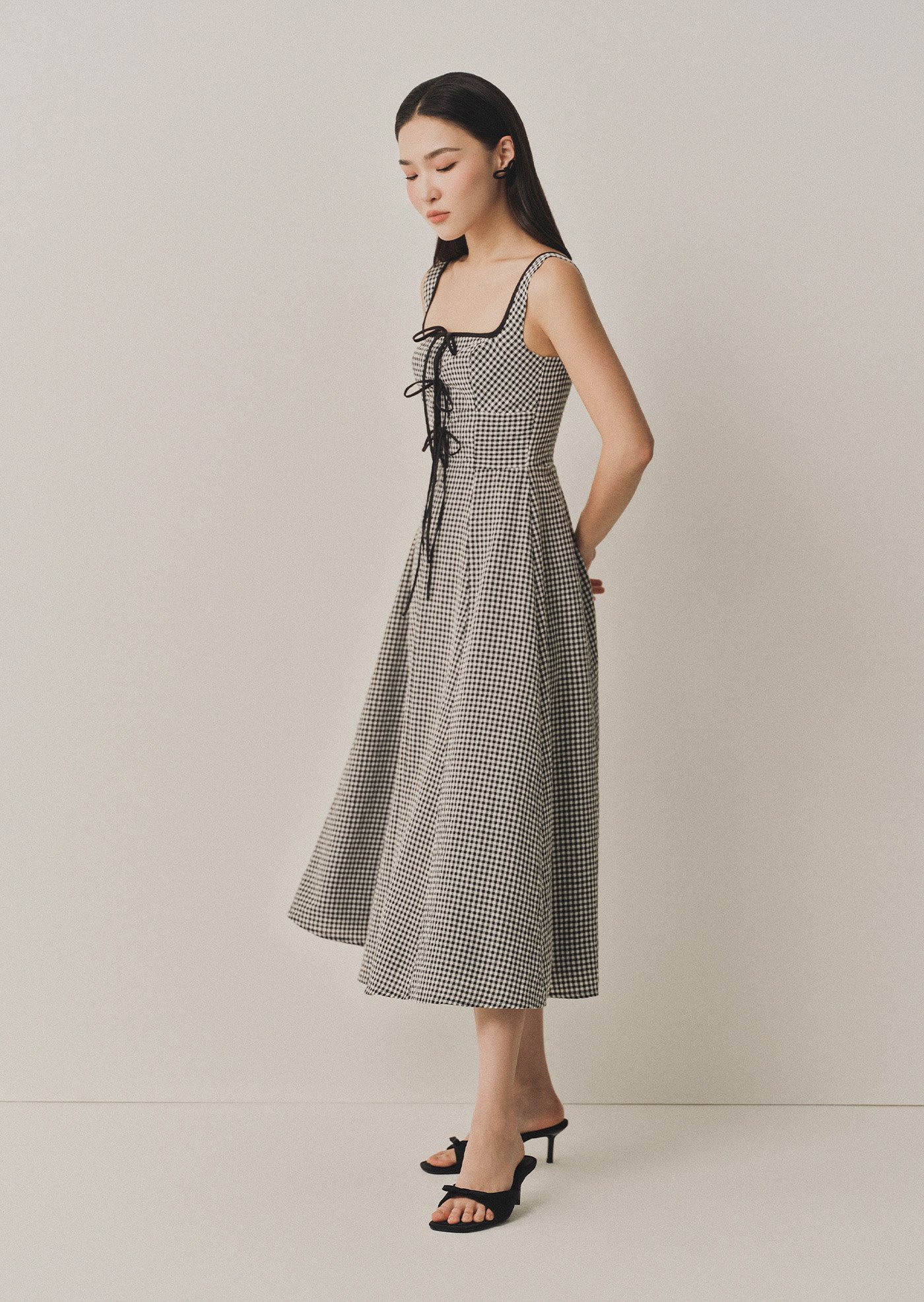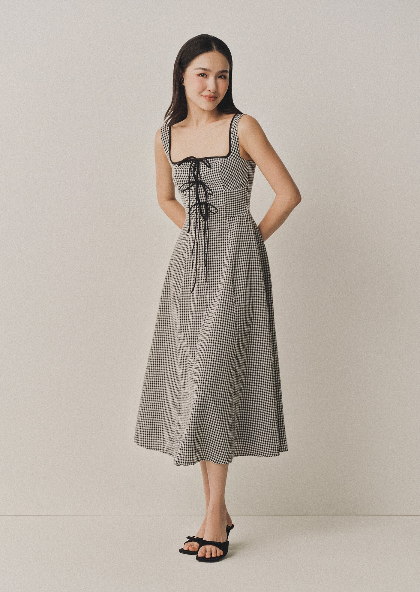 The Juliette is a checked printed midi dress featuring a square neckline with contrast trimmings and a corset-like bodice with self-tied detailing.