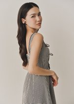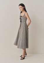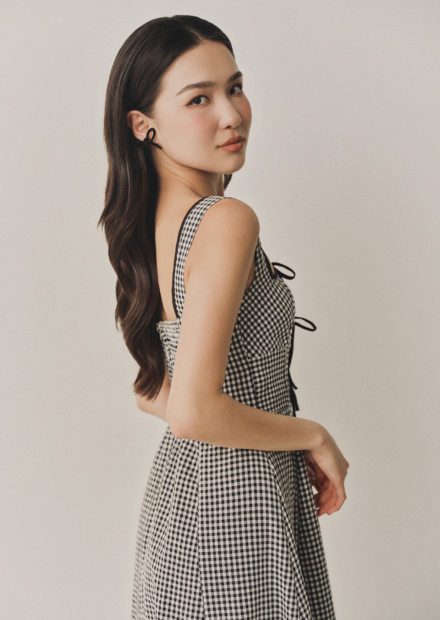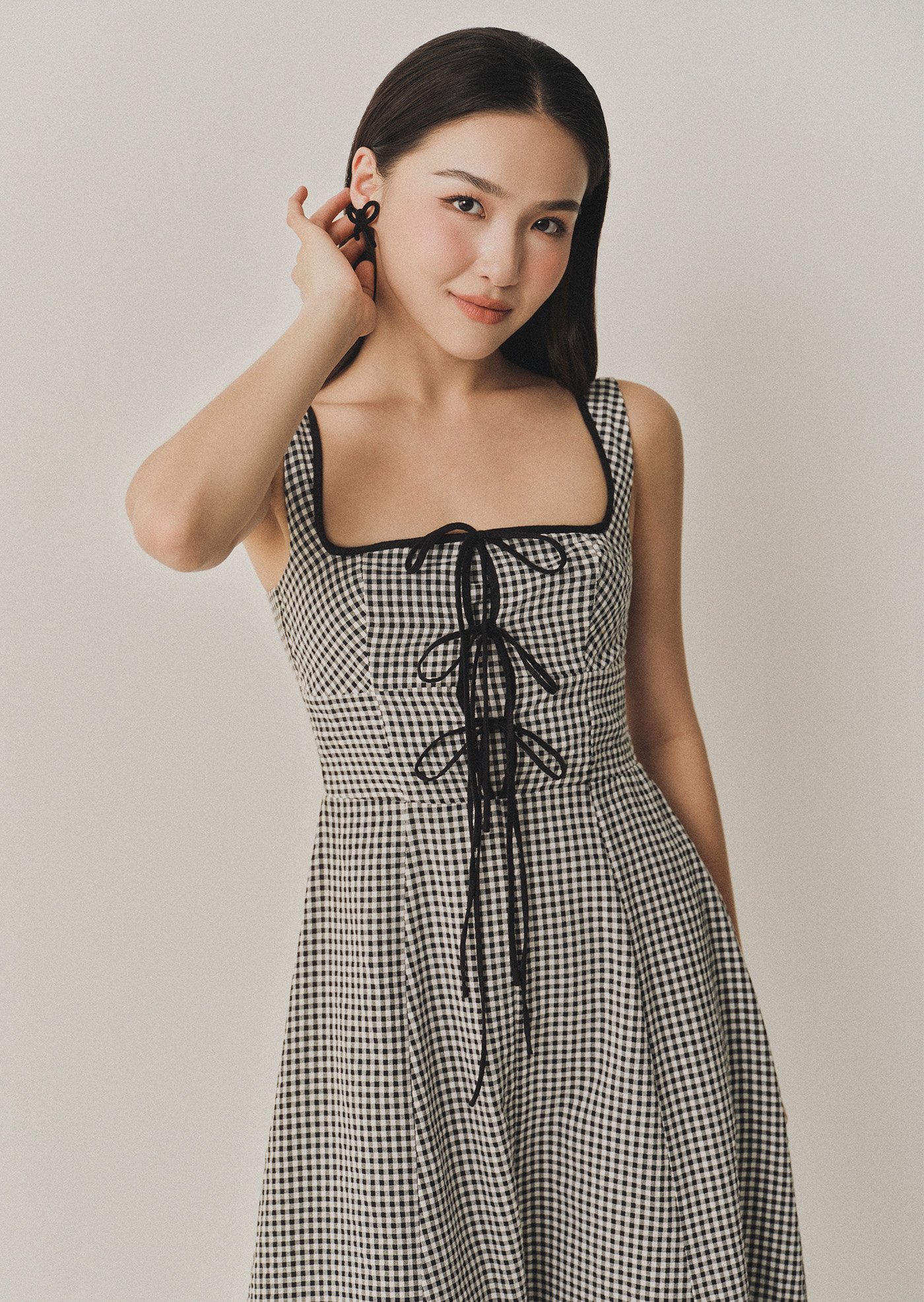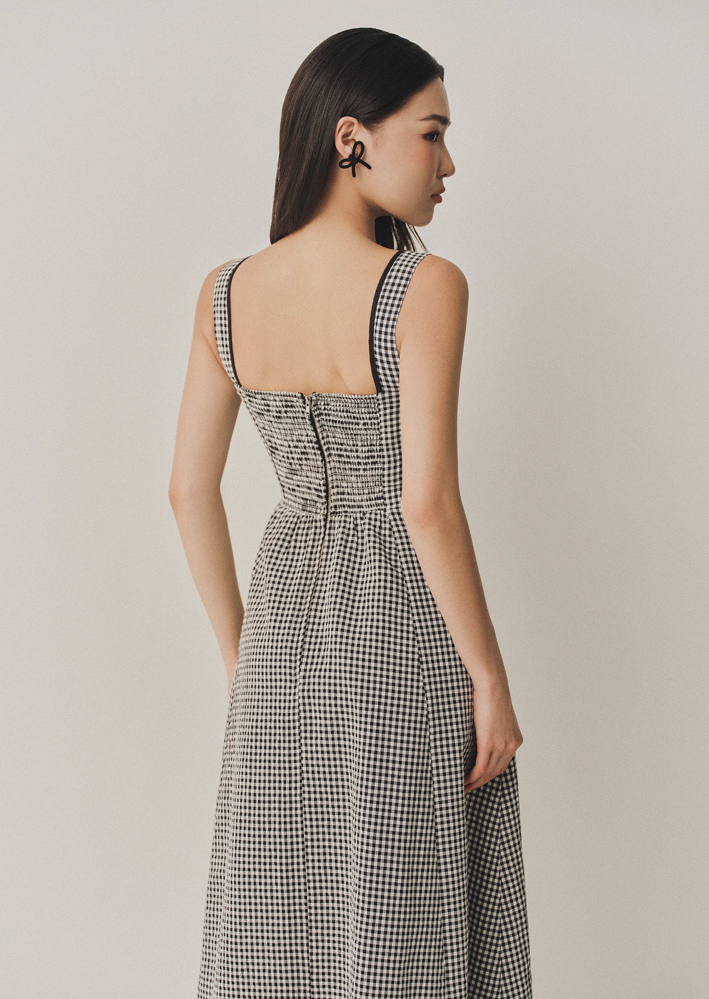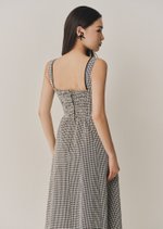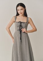 The Juliette is a checked printed midi dress featuring a square neckline with contrast trimmings and a corset-like bodice with self-tied detailing.