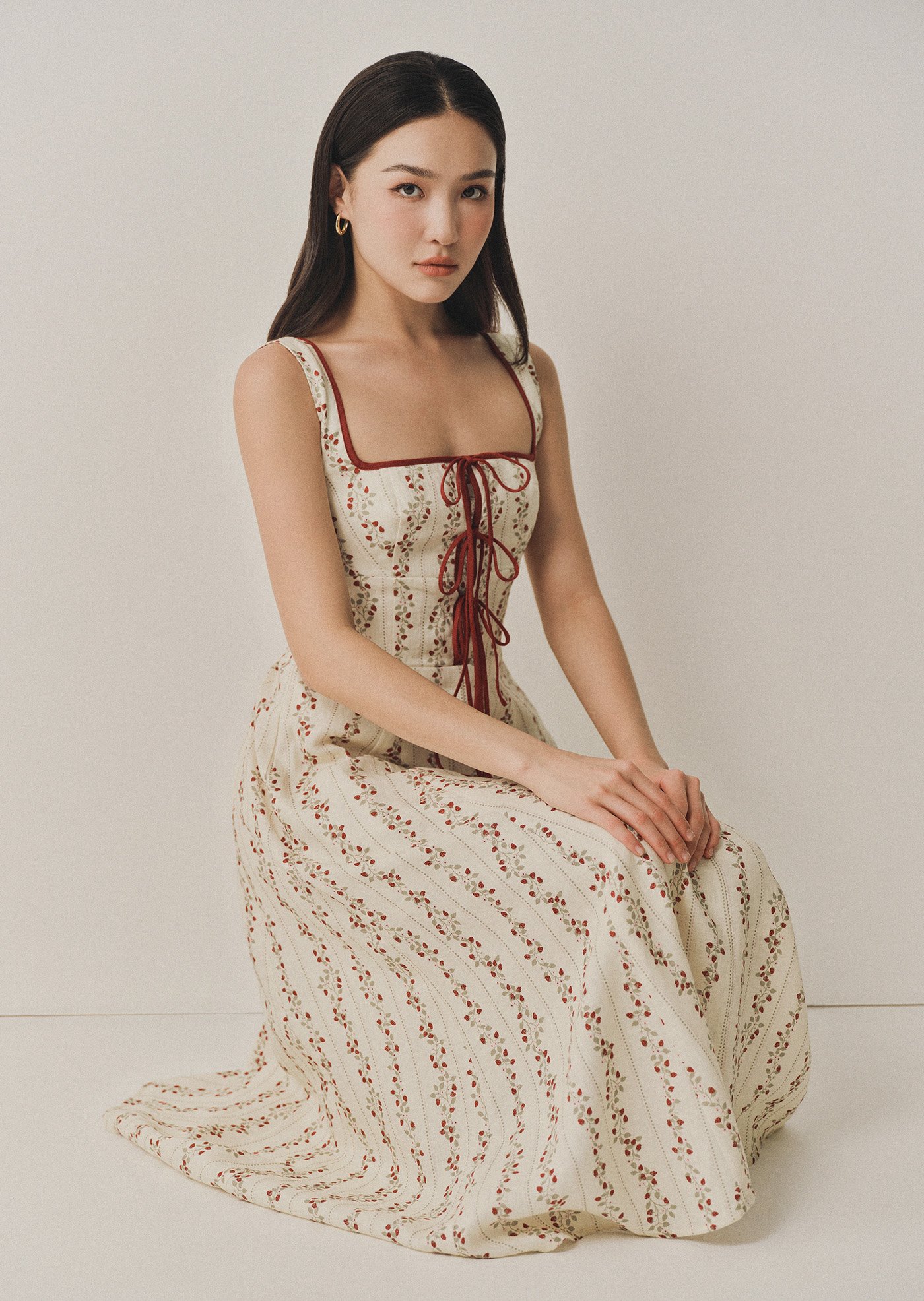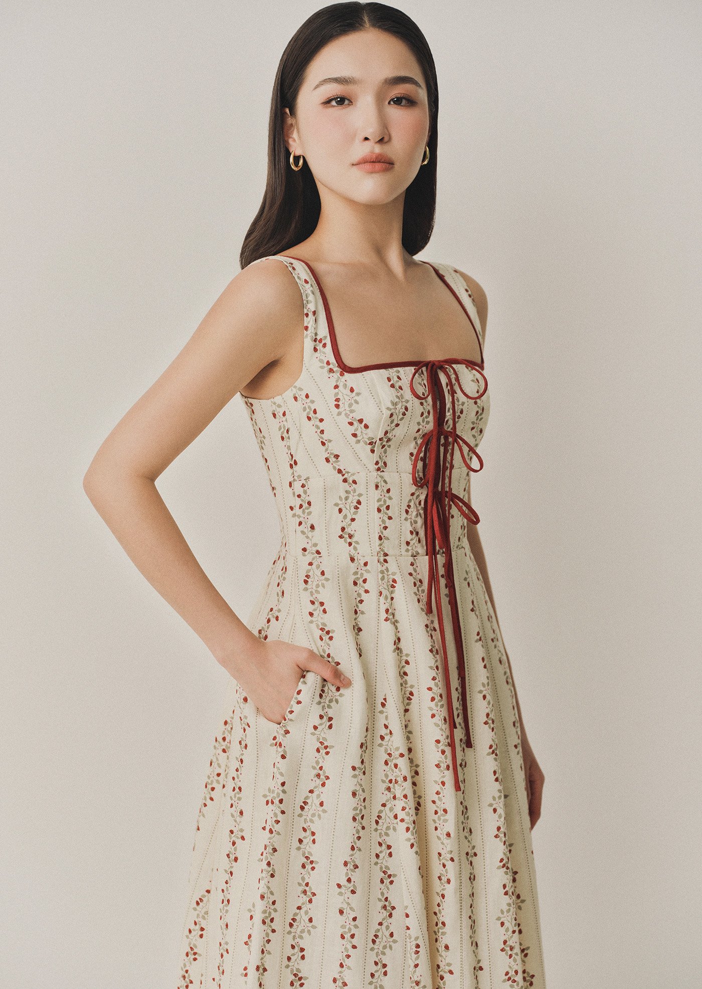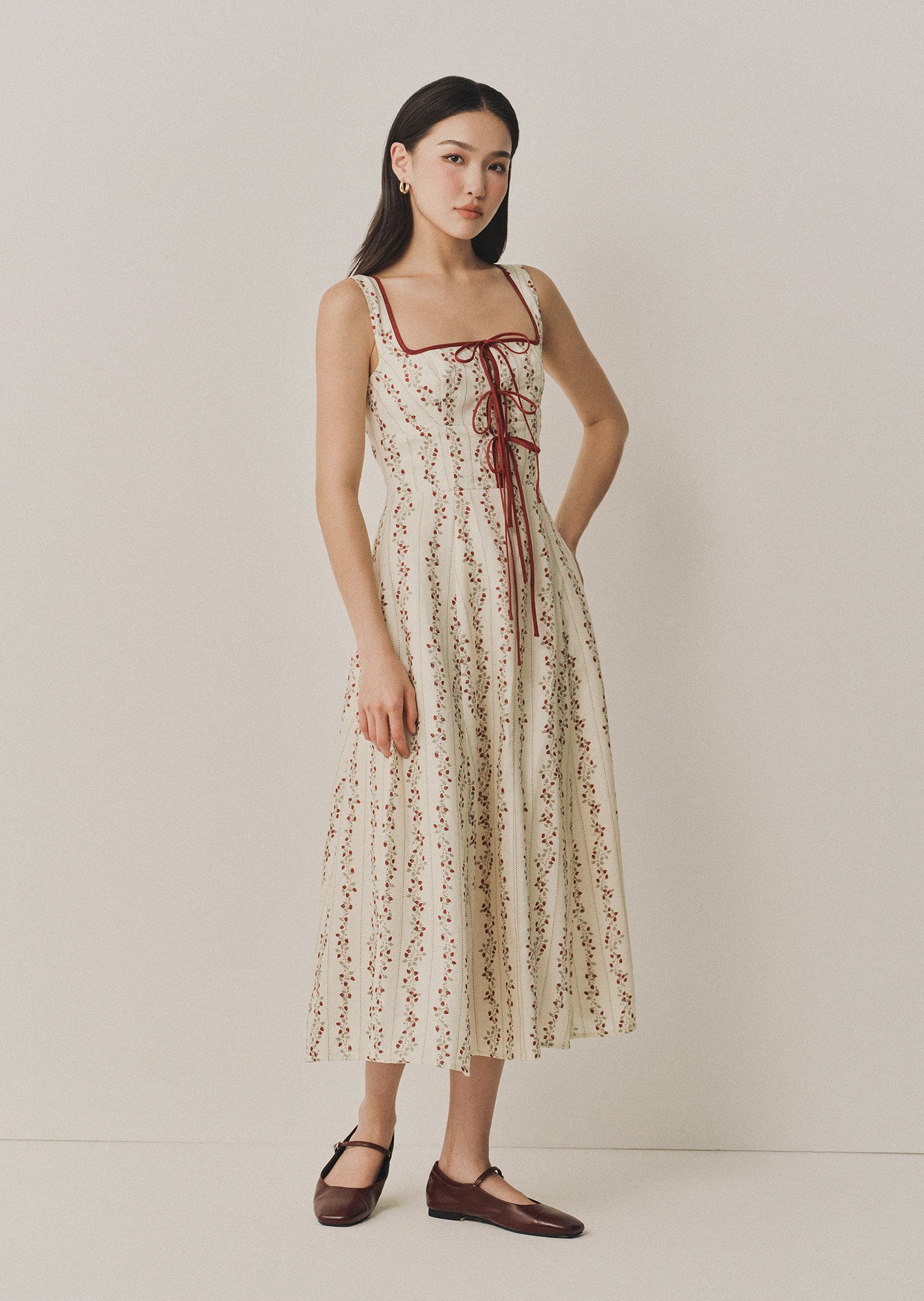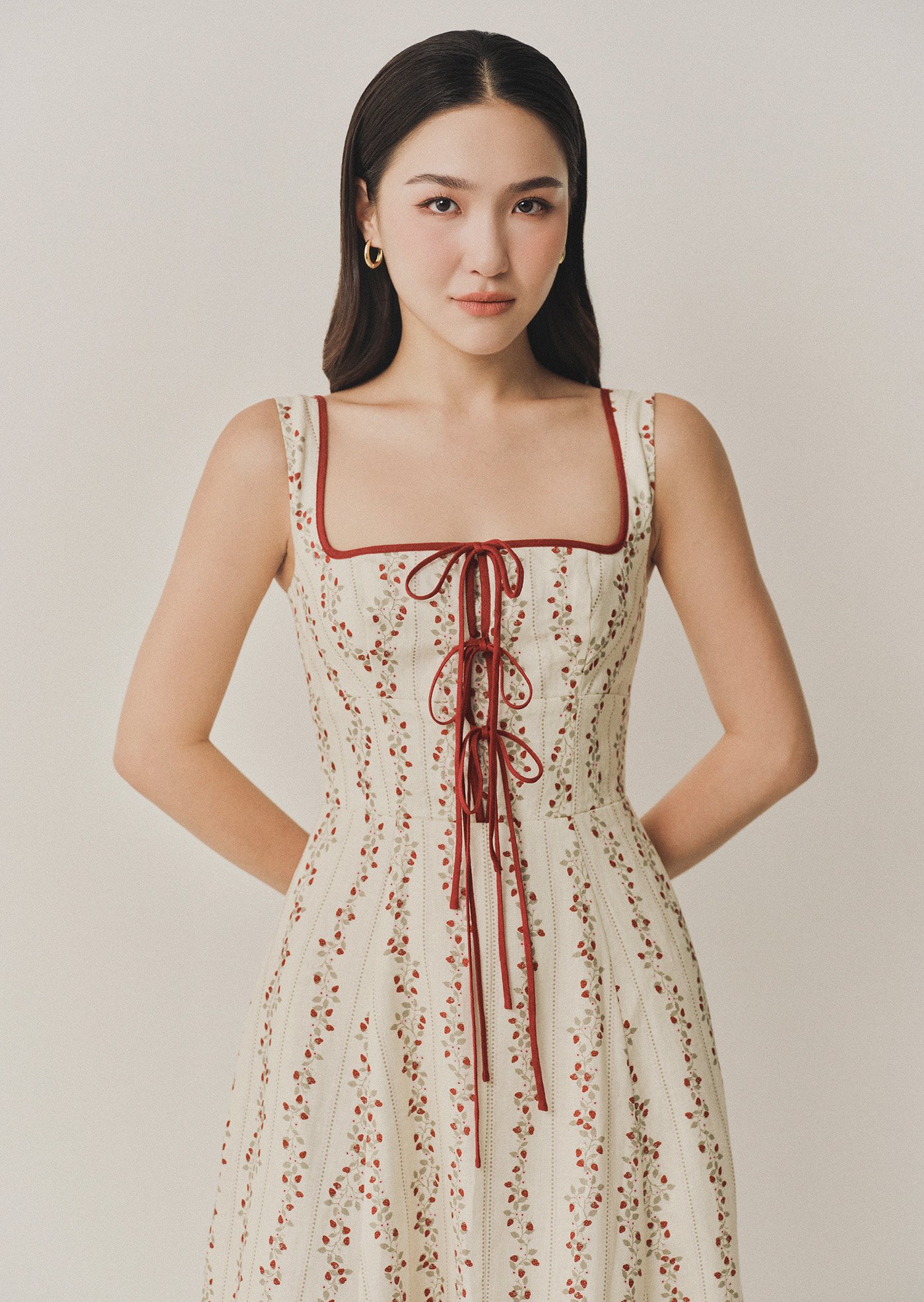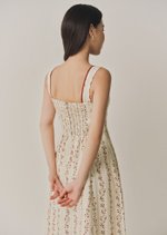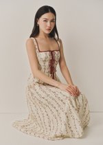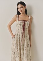 The Juliette is a midi dress featuring a square neckline with contrast trimmings and a corset-like bodice with self-tied detailing.