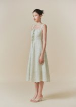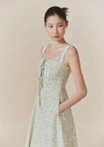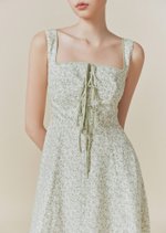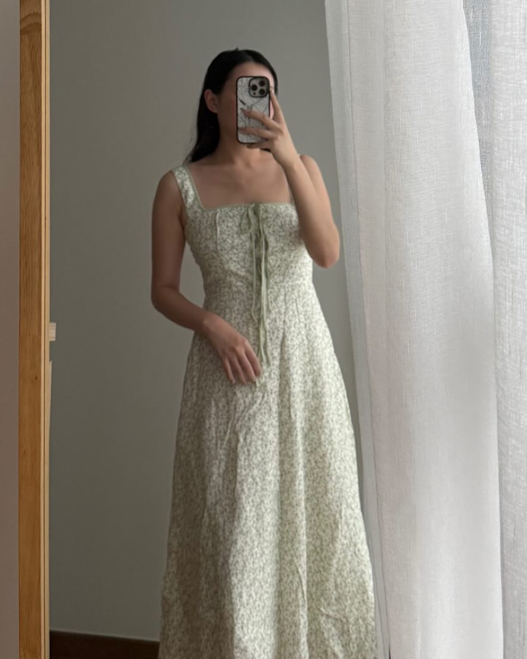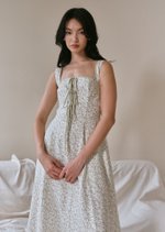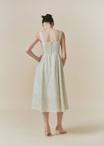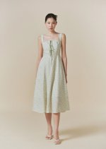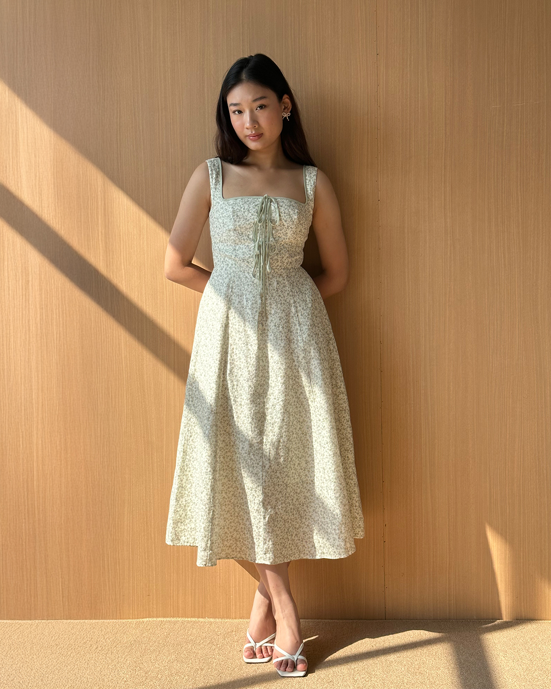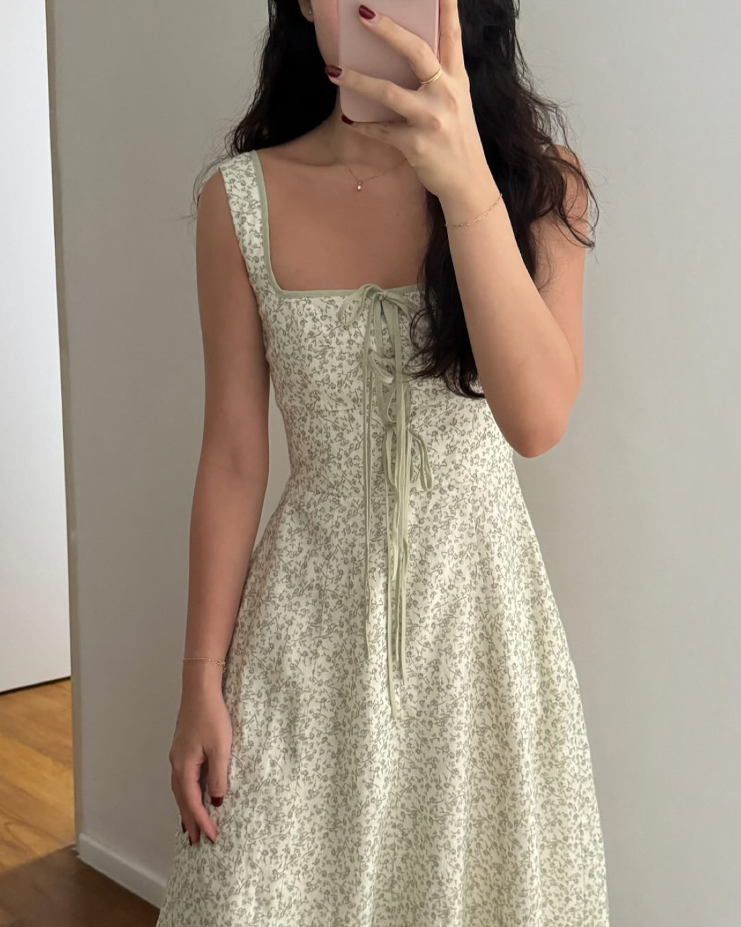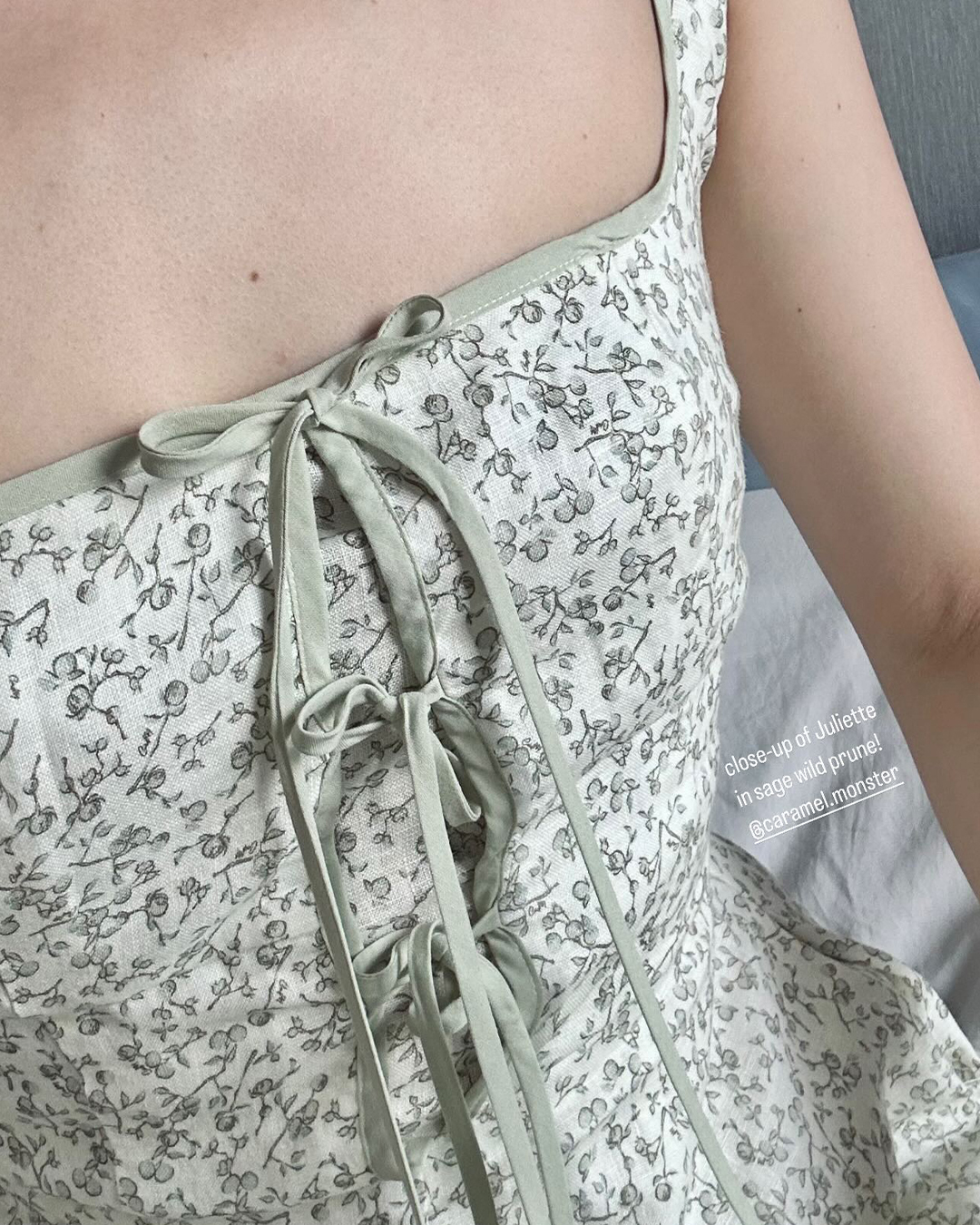 The Juliette is a printed midi dress featuring a square neckline with contrast trimmings and a corset-like bodice with self-tied detailing.