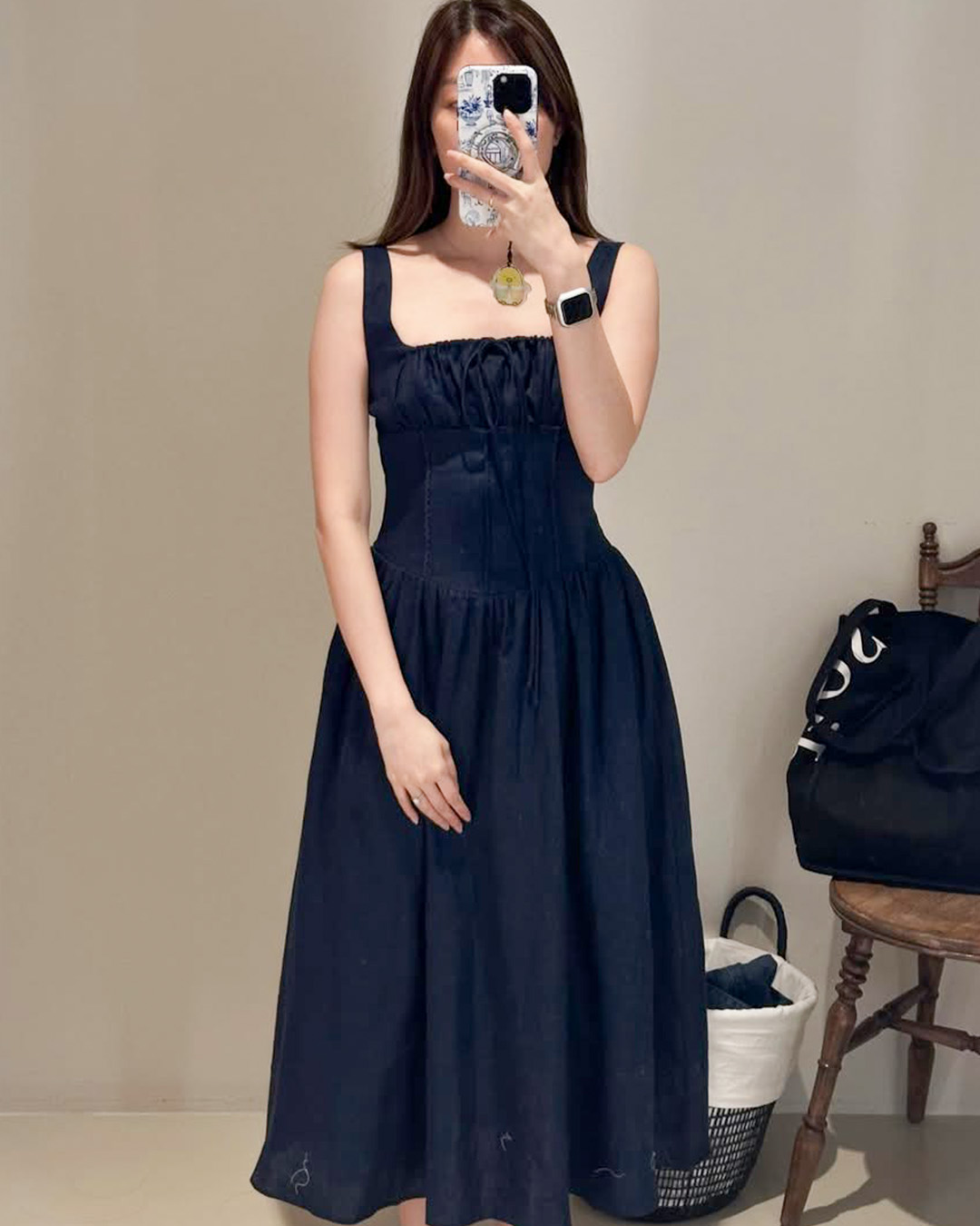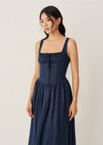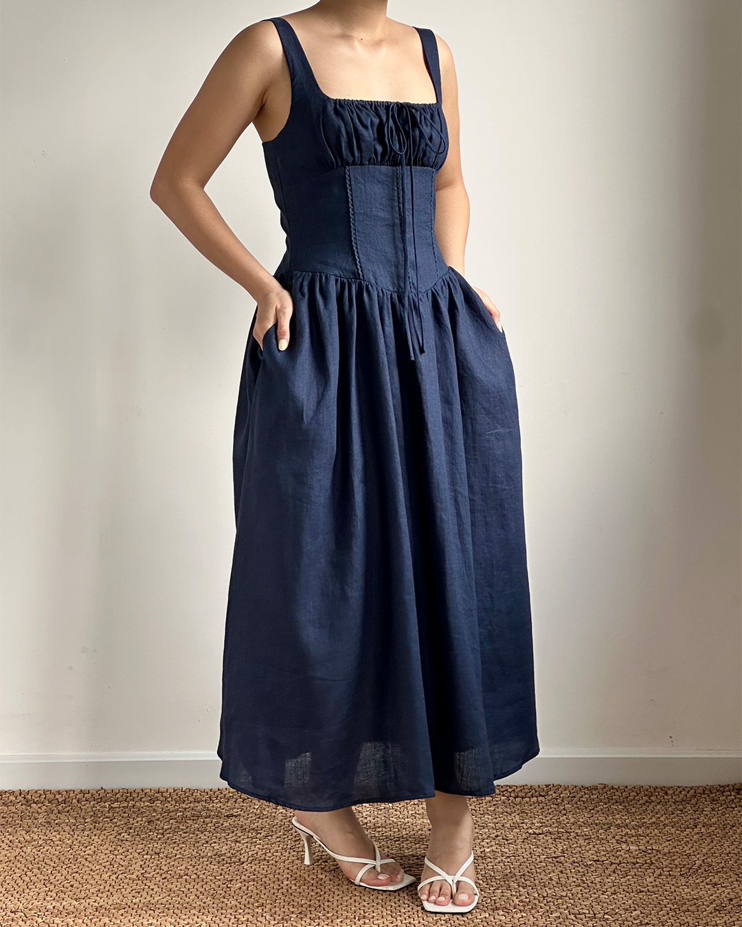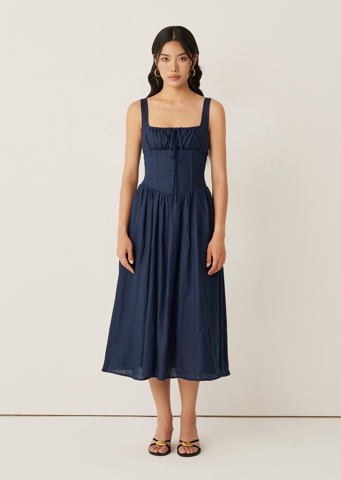 The Liberty Midi is a nostalgic take on summer dressing, featuring a gingham print, ruched bust detail, and a corset-inspired bodice. Finished with a softly gathered skirt, it’s an effortlessly charming piece for sun-drenched days.