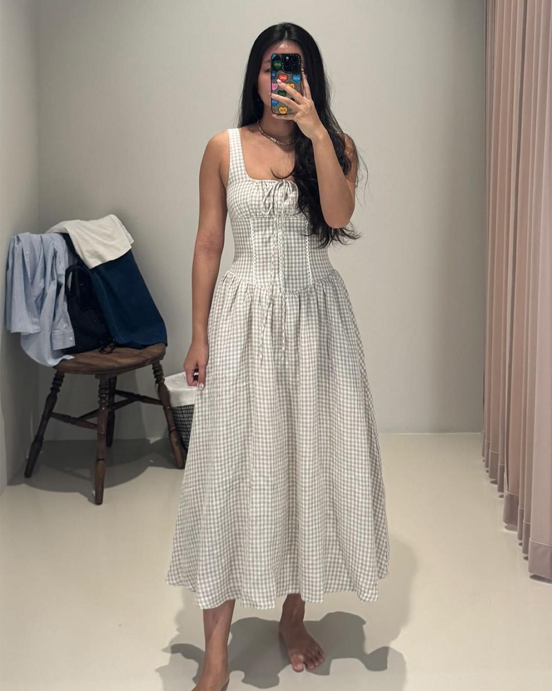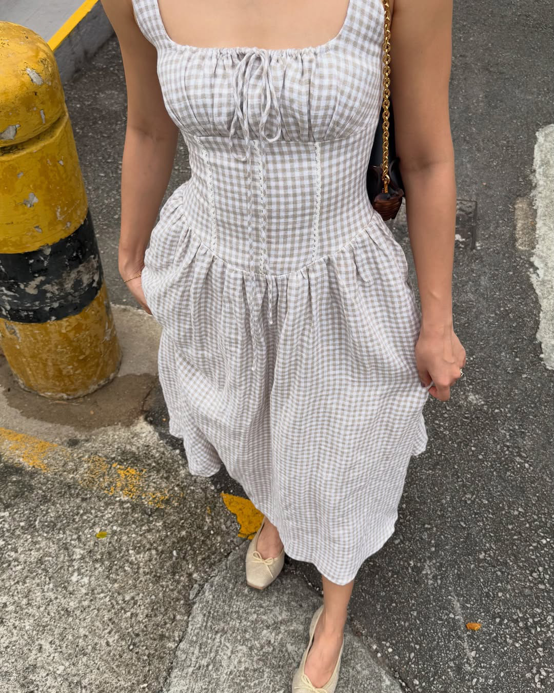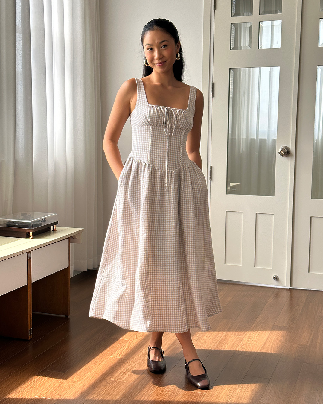 The Liberty Midi is a nostalgic take on summer dressing, featuring a gingham print, ruched bust detail, and a corset-inspired bodice. Finished with a softly gathered skirt, it’s an effortlessly charming piece for sun-drenched days.