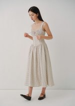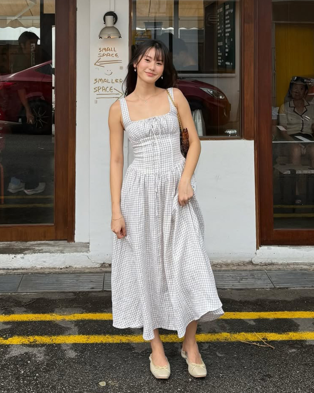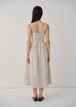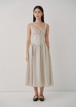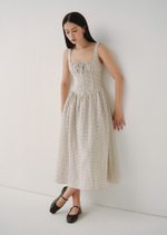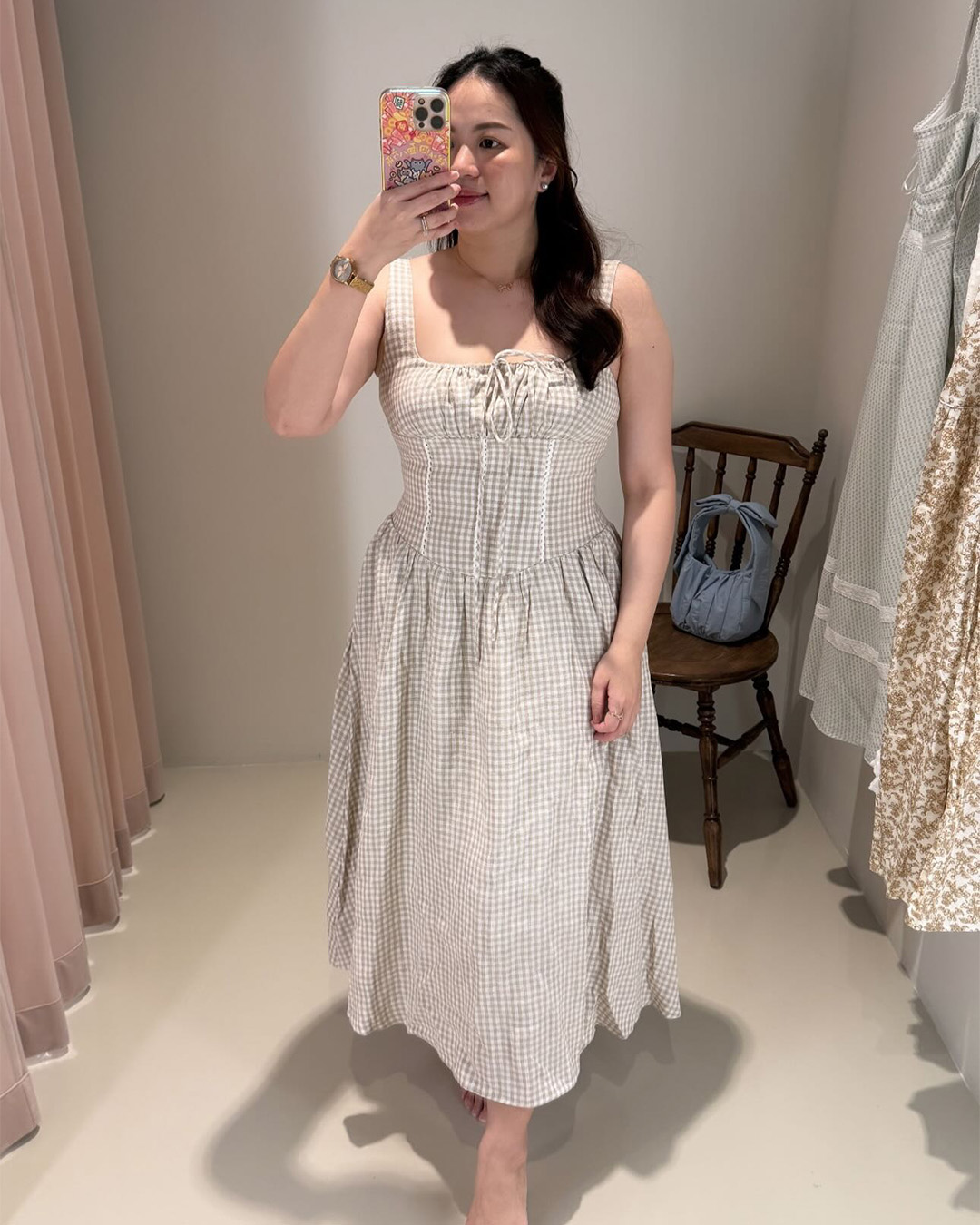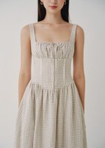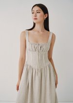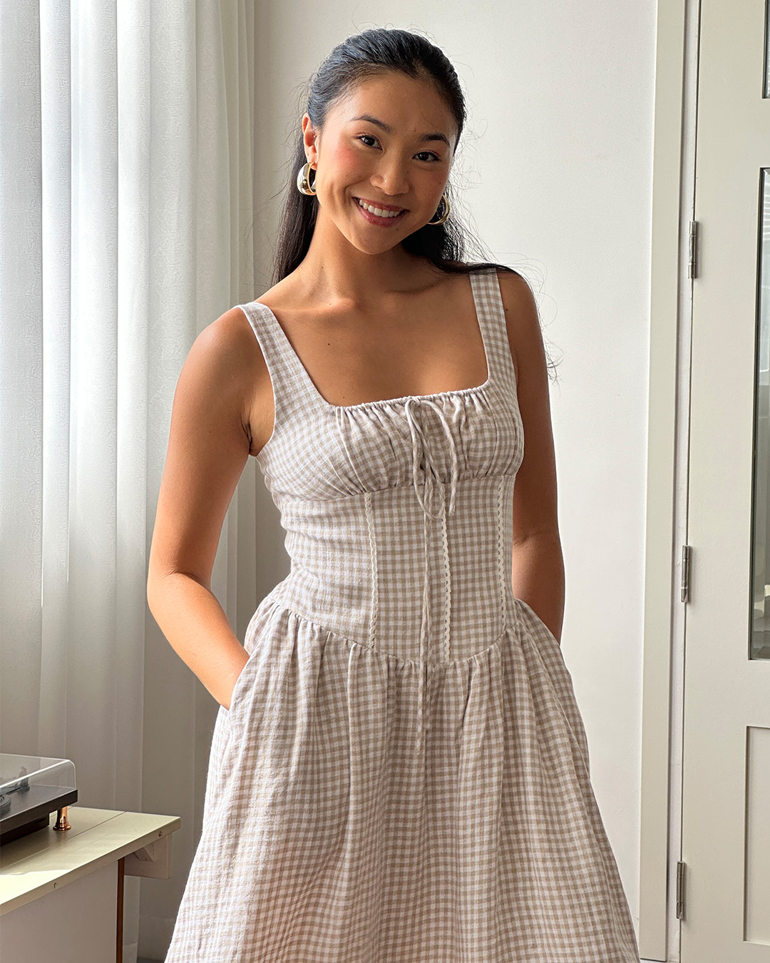 The Liberty Midi is a nostalgic take on summer dressing, featuring a gingham print, ruched bust detail, and a corset-inspired bodice. Finished with a softly gathered skirt, it’s an effortlessly charming piece for sun-drenched days.