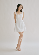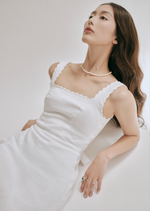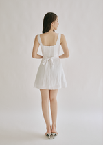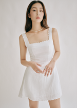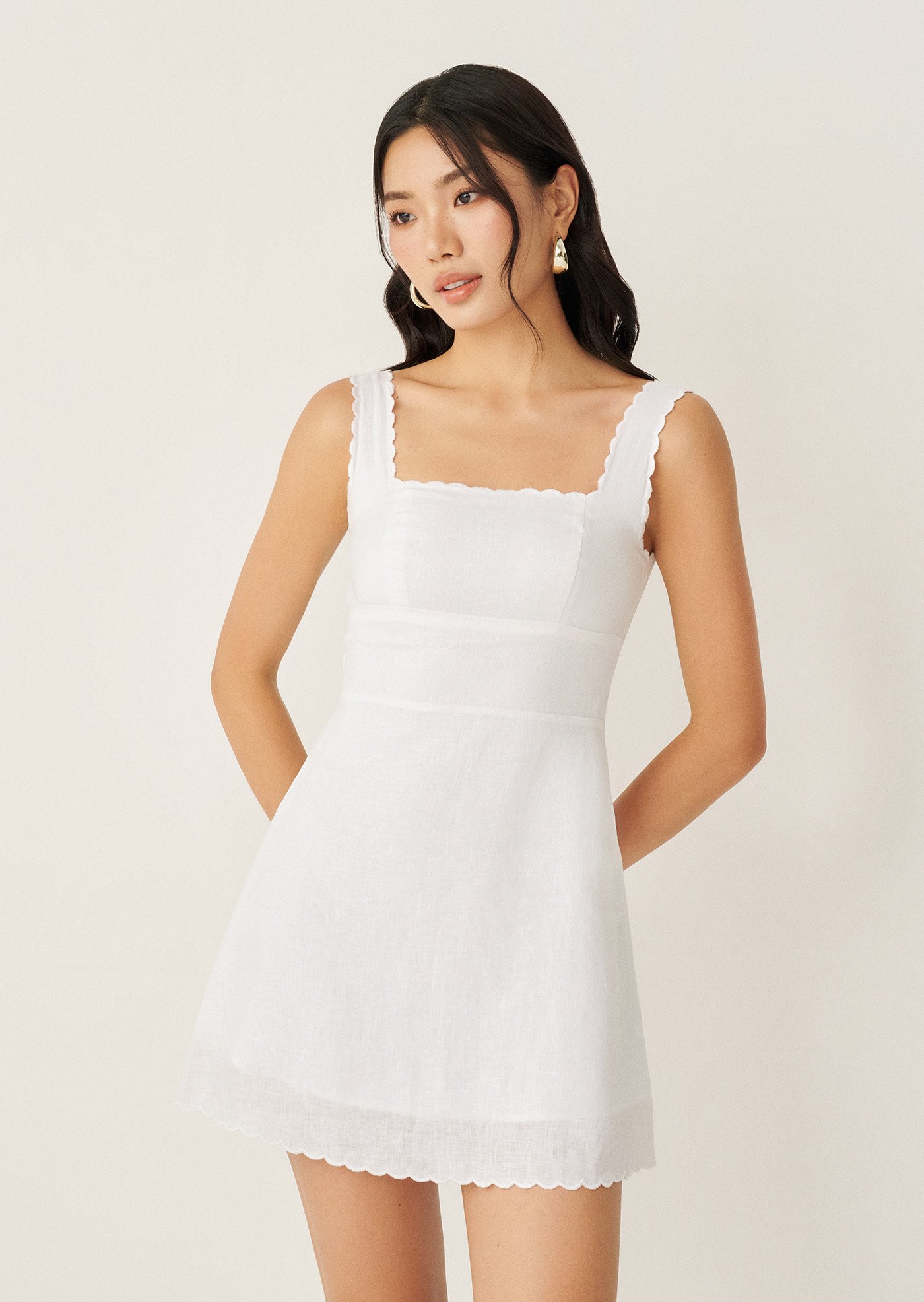 The scalloped series that you've all been waiting for. Say hello to Lily, a mini dress with delicate scallop trimming that adorns the edges, adding a touch of femininity and sophistication, as well as a self-tie back detailing.