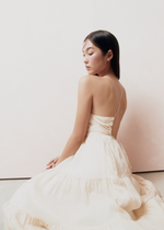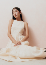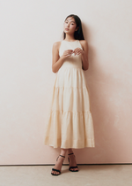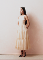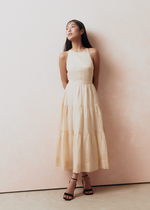 The Lois features a simple and romantic design with floaty skirt and halter bodice with ties at the back to adjust the fit. Make a statement in the crowd with this simple but unique midi dress.