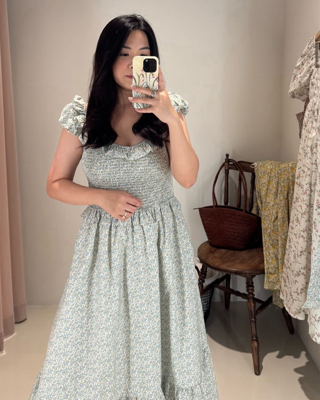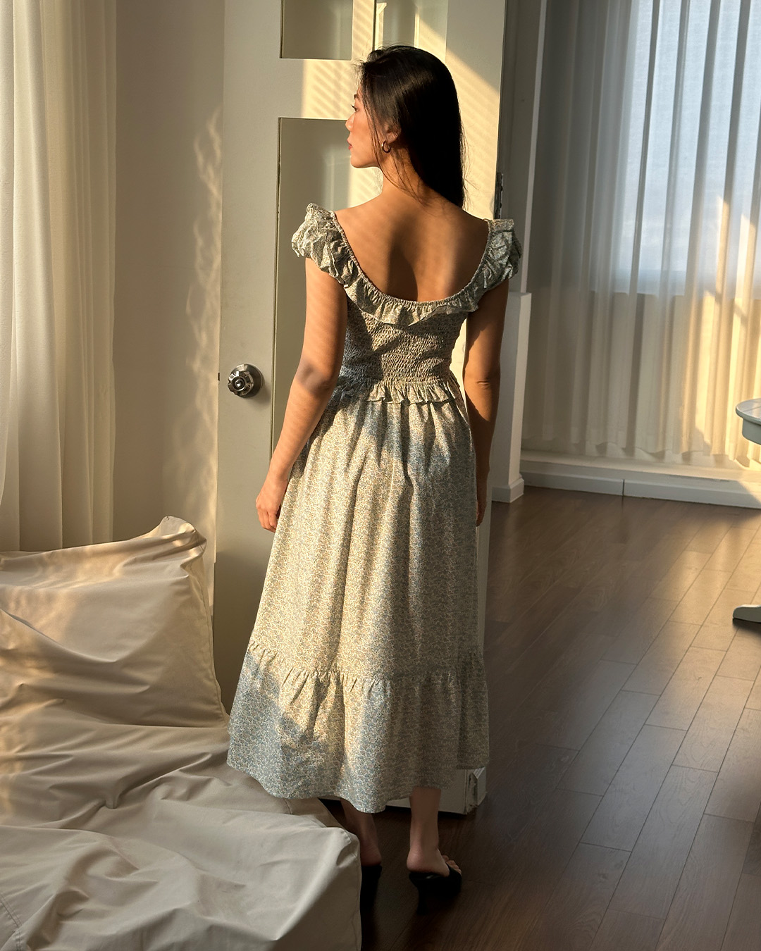 The Lucia Midi Dress is a romantic silhouette with ruffled straps, a smocked bodice, and a flowing tiered skirt that falls to mid-calf. Crafted in delicate Piccadilly Poplin Cotton, it’s the perfect balance of ease and charm for sunlit days and dreamy evenings.