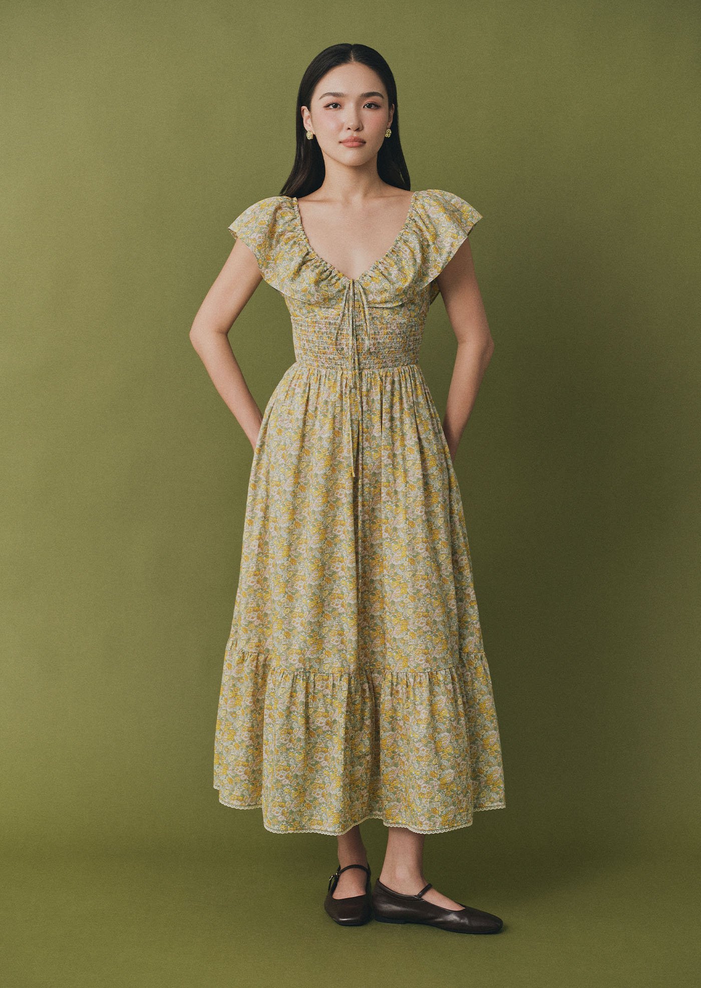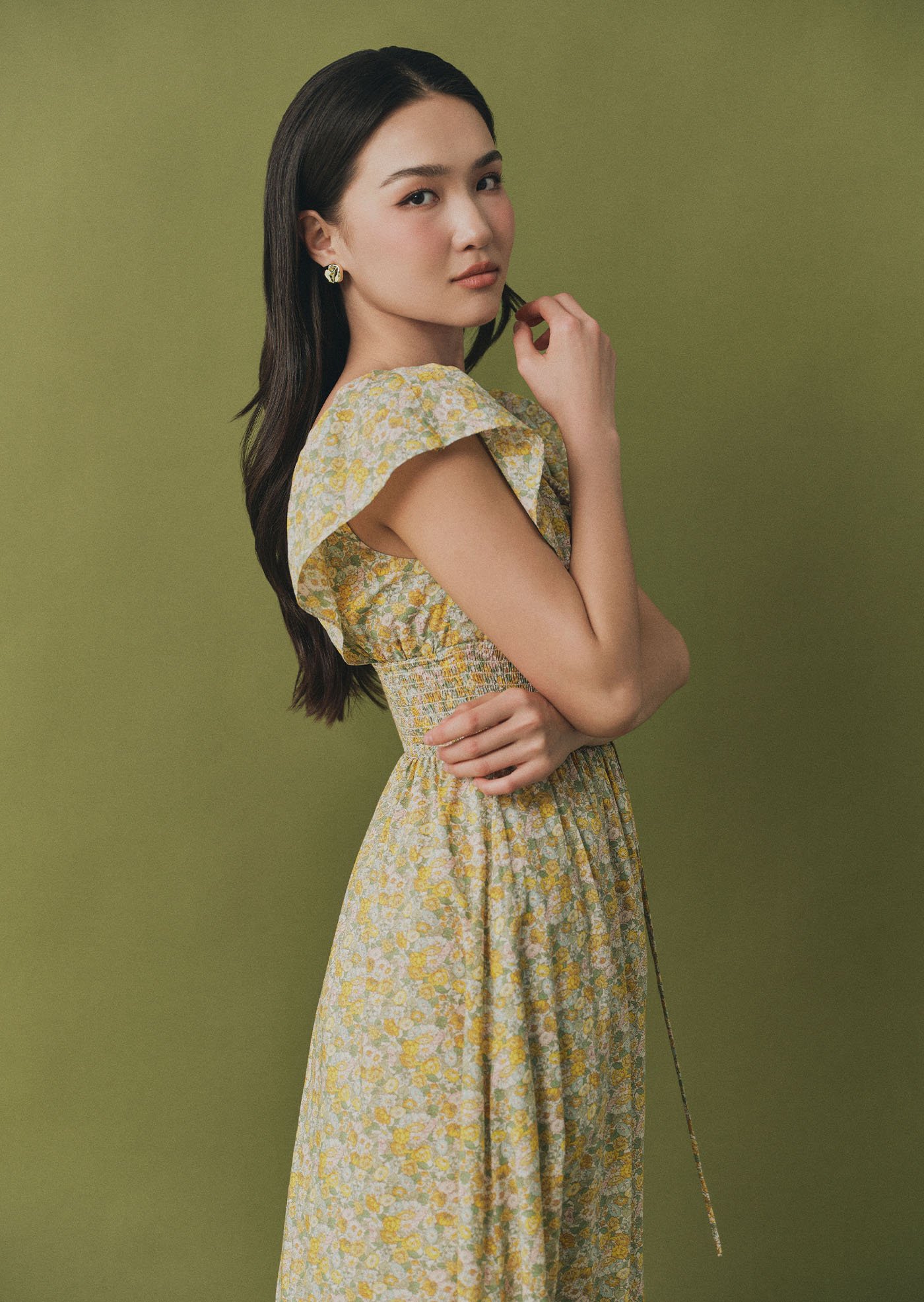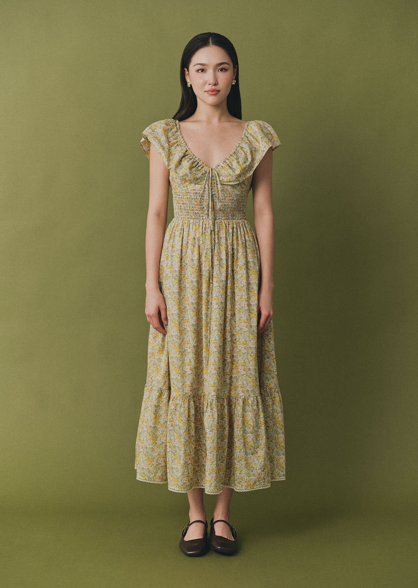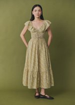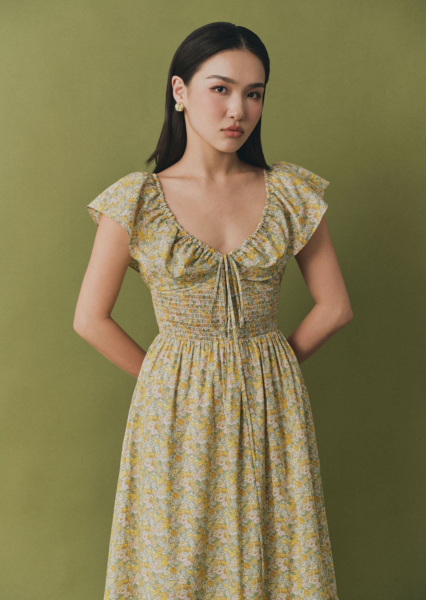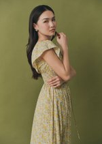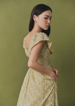 The Luna Midi Dress is a feminine silhouette with flutter sleeves, a ruched bodice with tie detail, and a flowing skirt that falls to mid-calf. Printed in soft florals, it’s an airy, romantic piece perfect for sunlit days and effortless evenings.