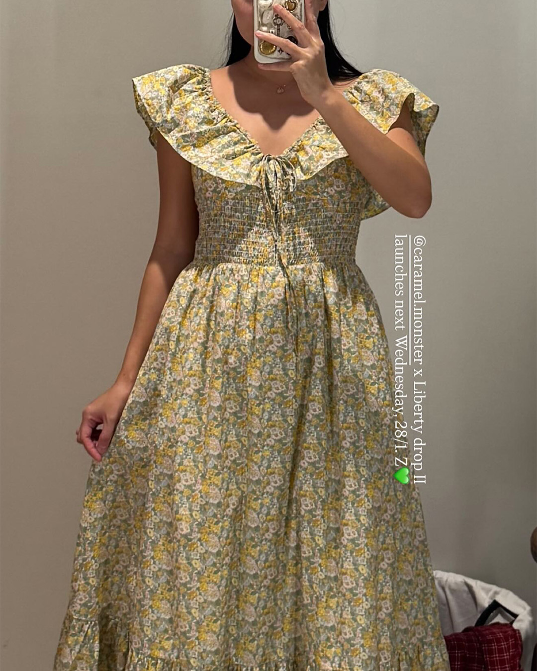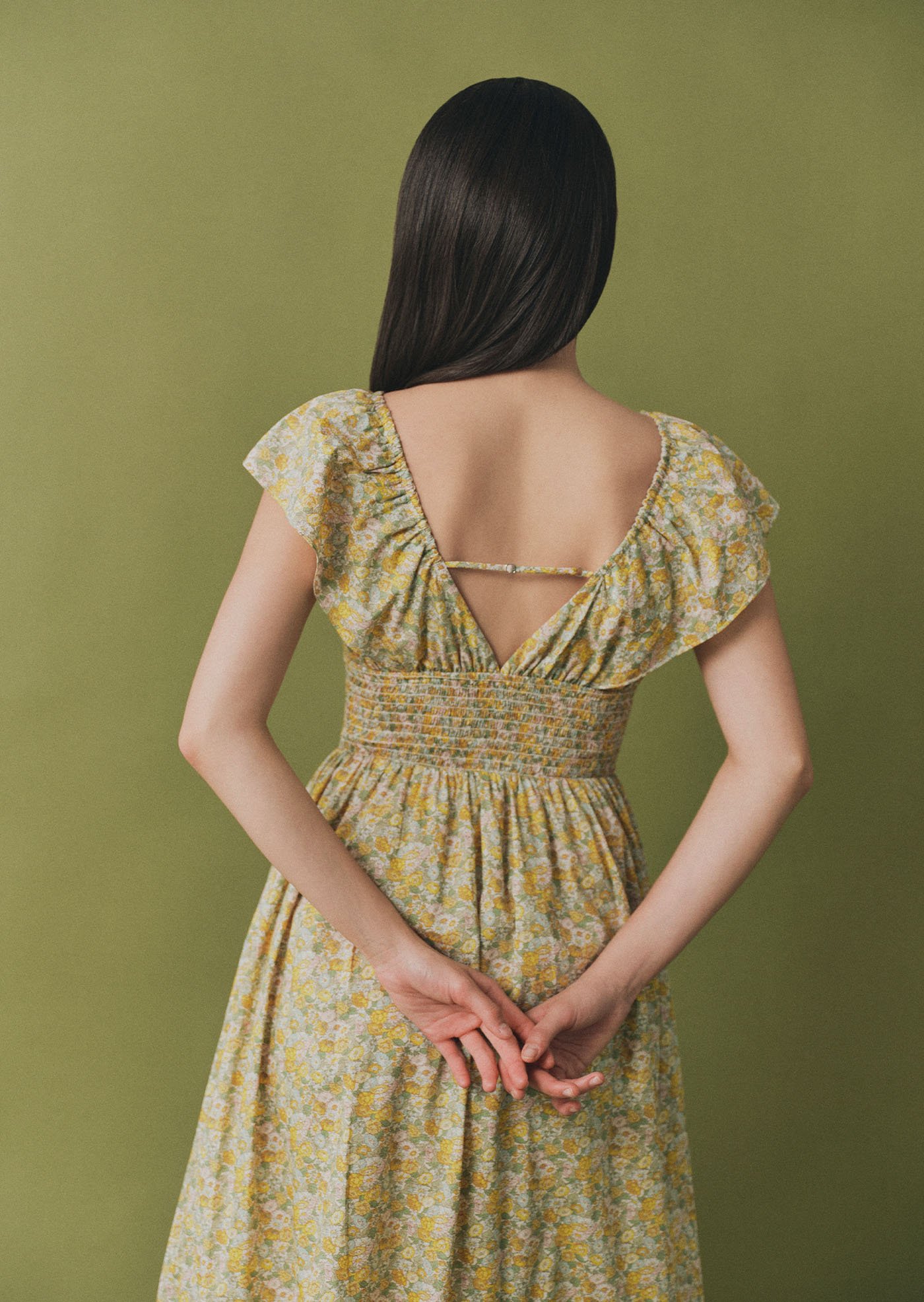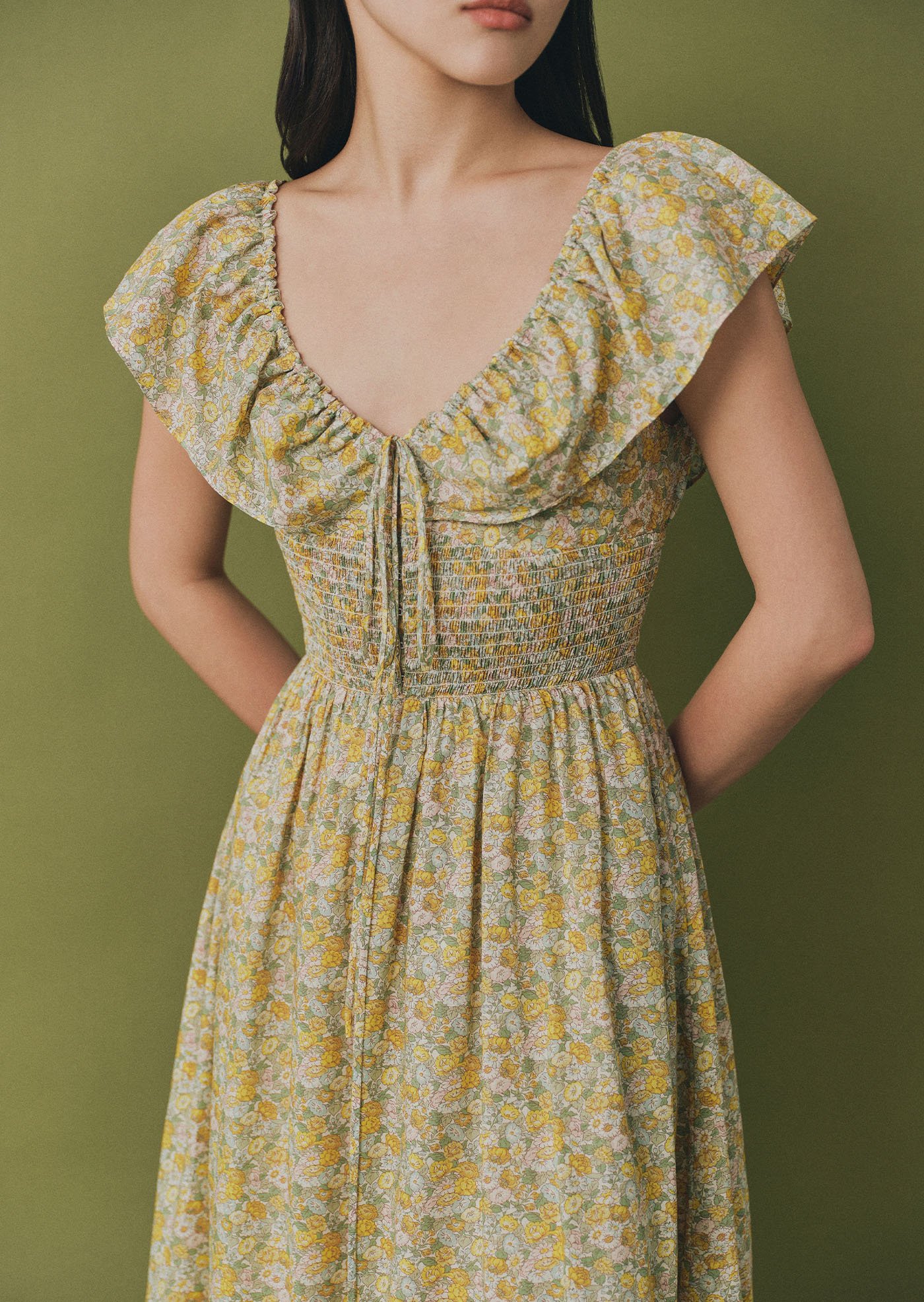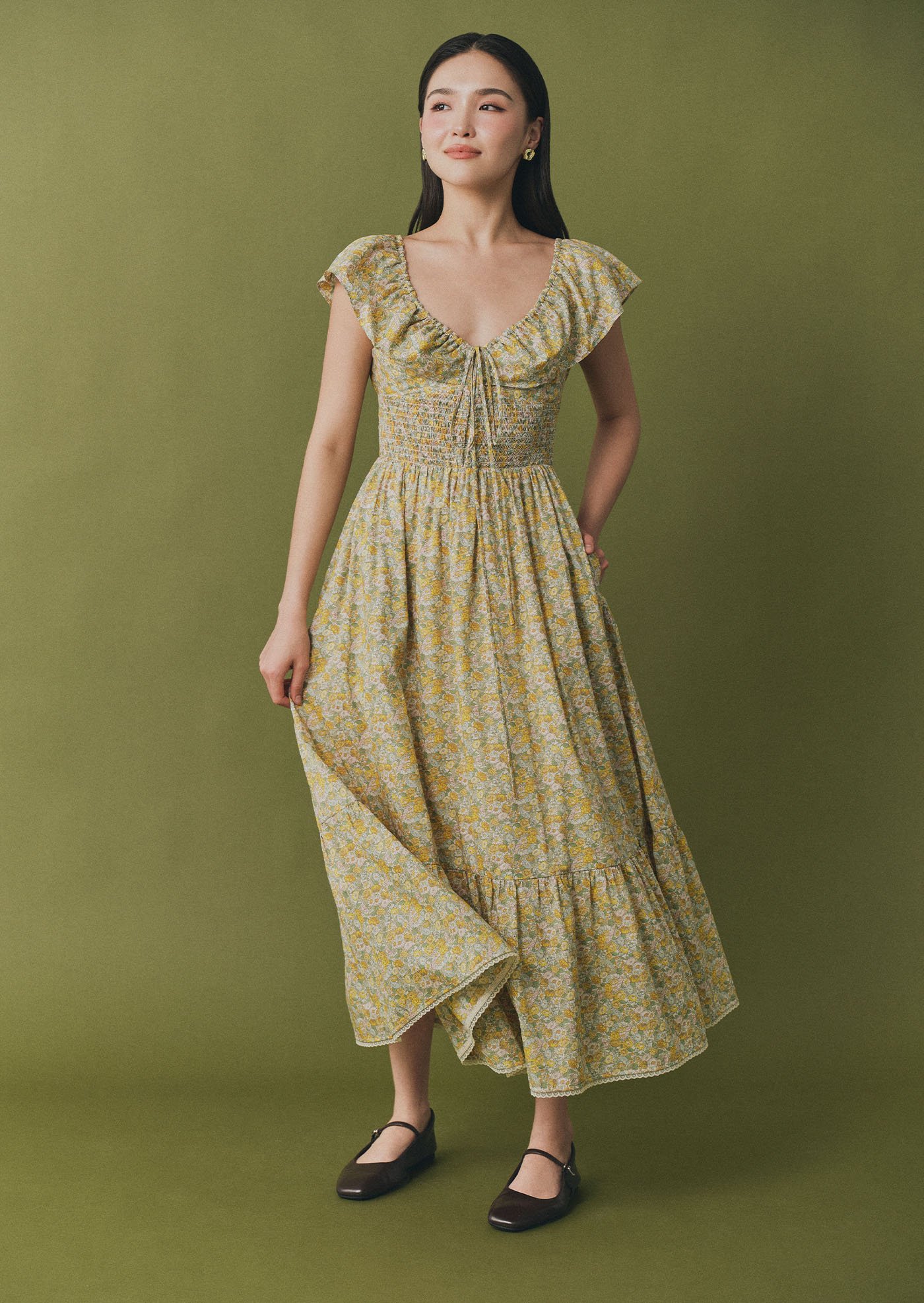 The Luna Midi Dress is a feminine silhouette with flutter sleeves, a ruched bodice with tie detail, and a flowing skirt that falls to mid-calf. Printed in soft florals, it’s an airy, romantic piece perfect for sunlit days and effortless evenings.