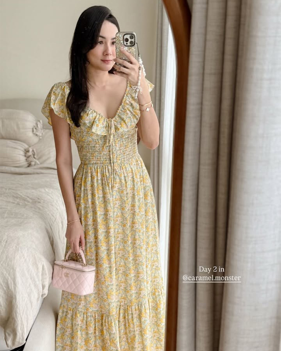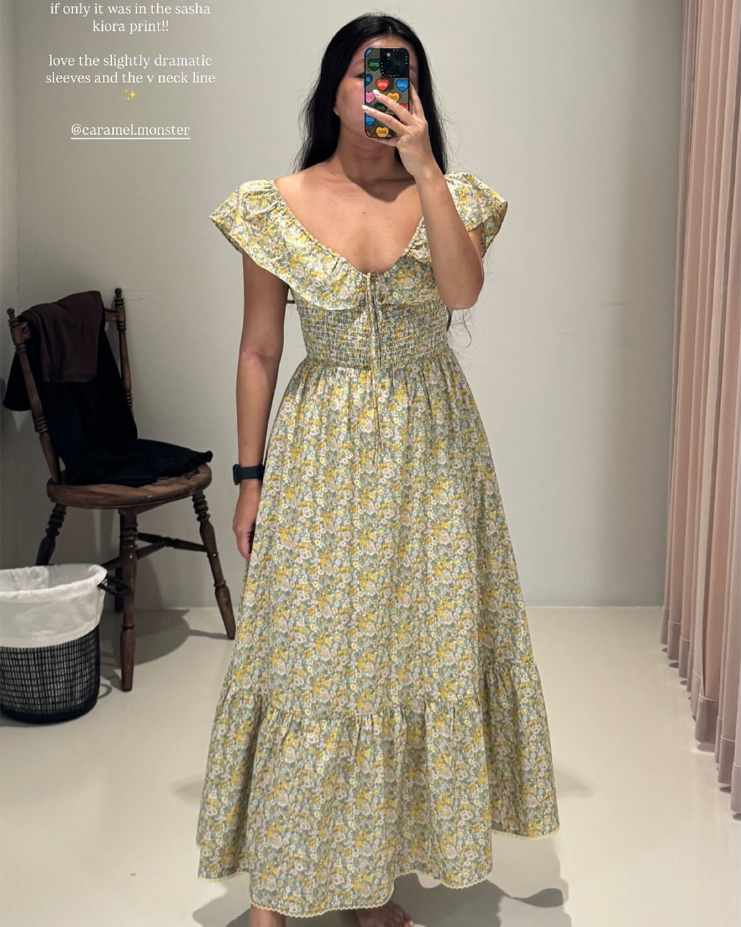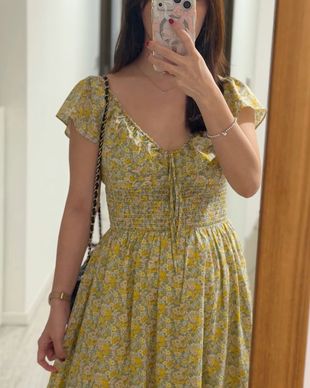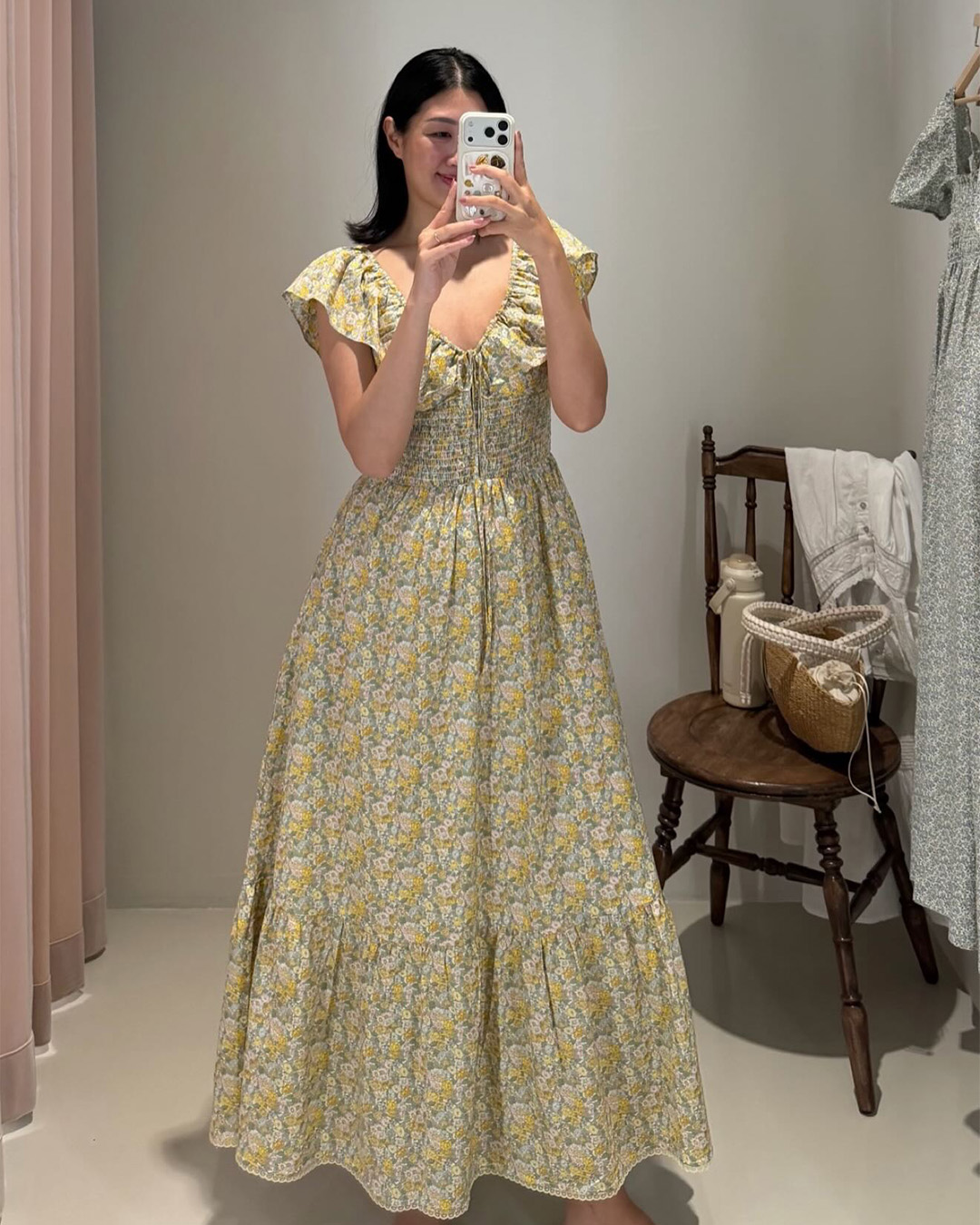 The Luna Midi Dress is a feminine silhouette with flutter sleeves, a ruched bodice with tie detail, and a flowing skirt that falls to mid-calf. Printed in soft florals, it’s an airy, romantic piece perfect for sunlit days and effortless evenings.