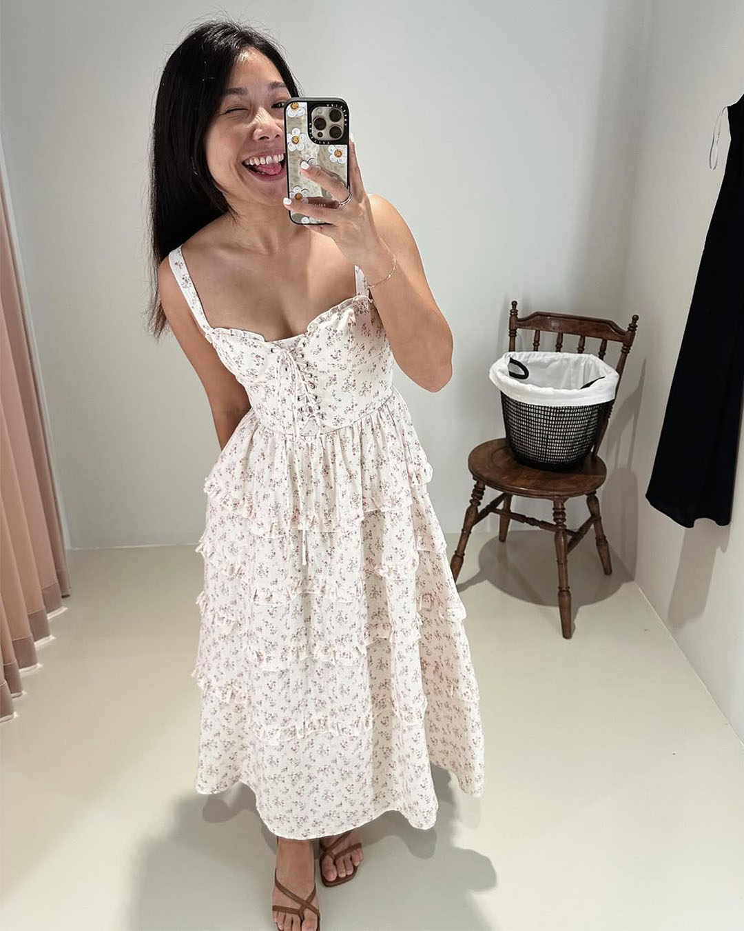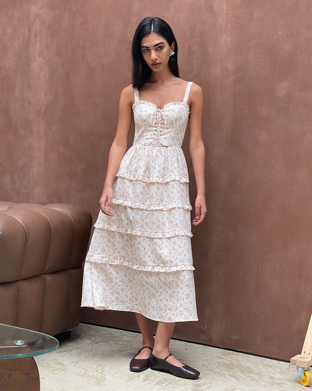 - Ruffles details at skirt panel