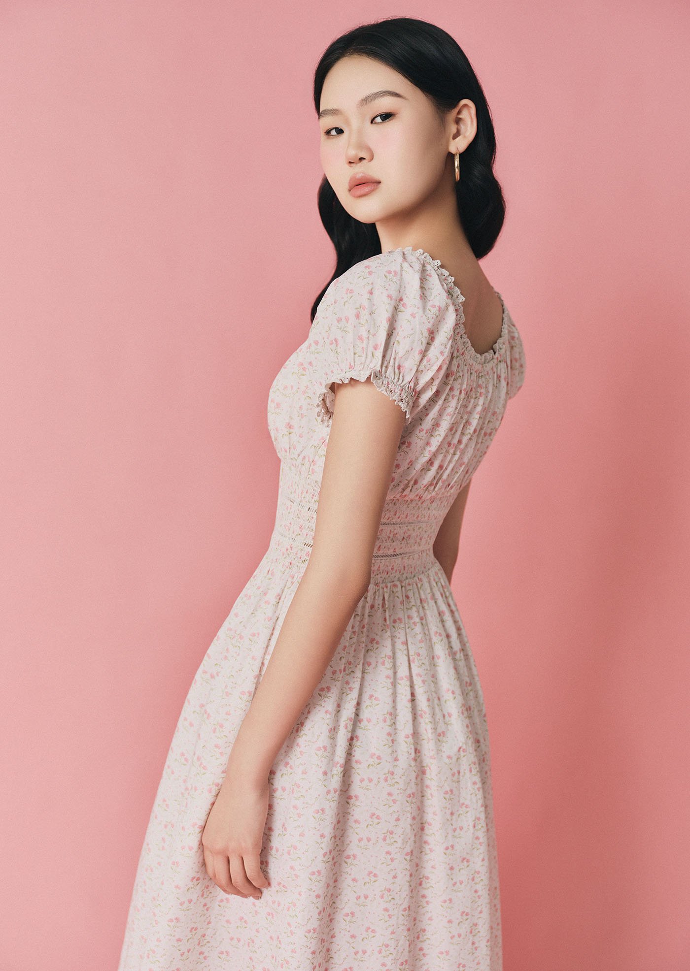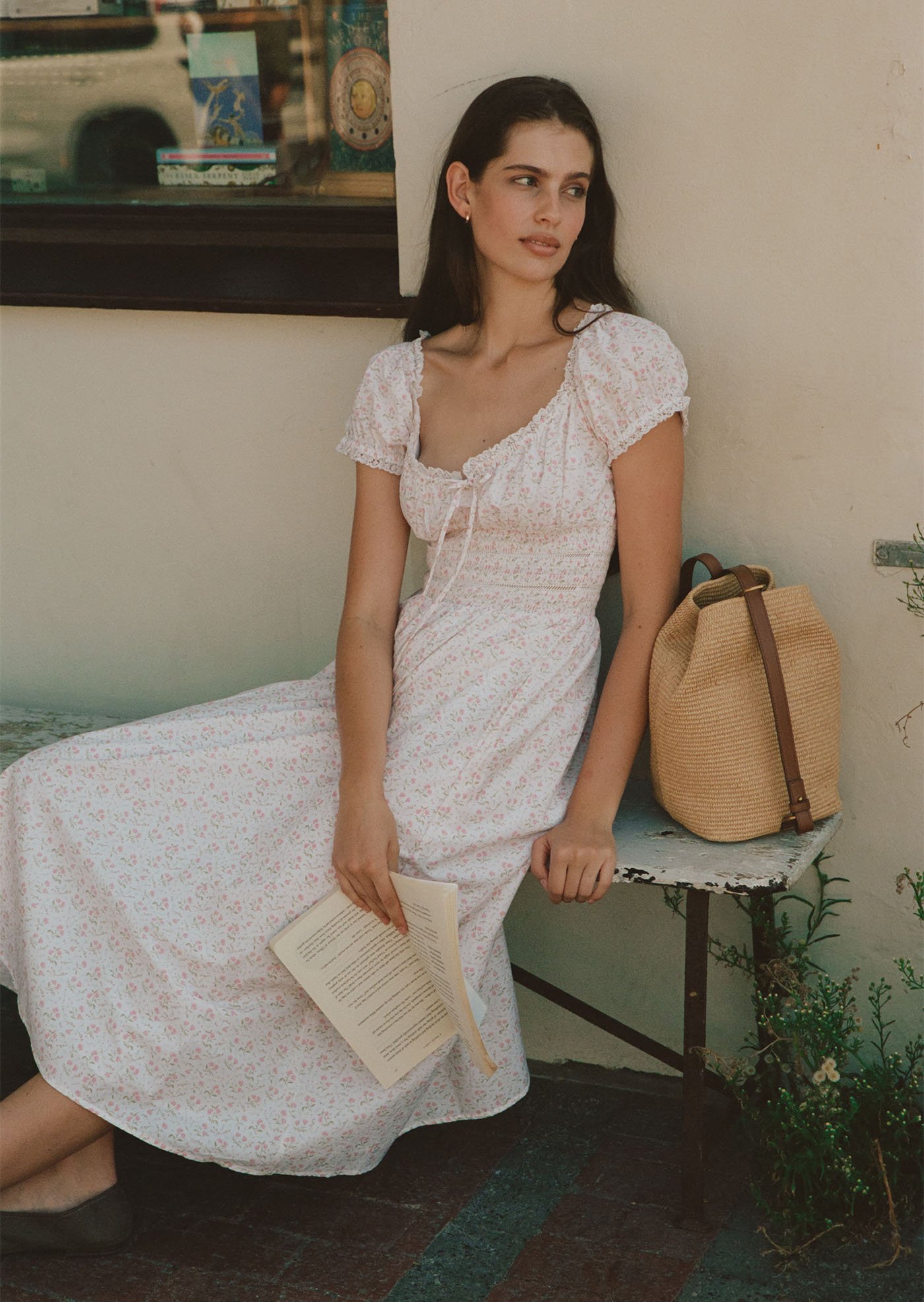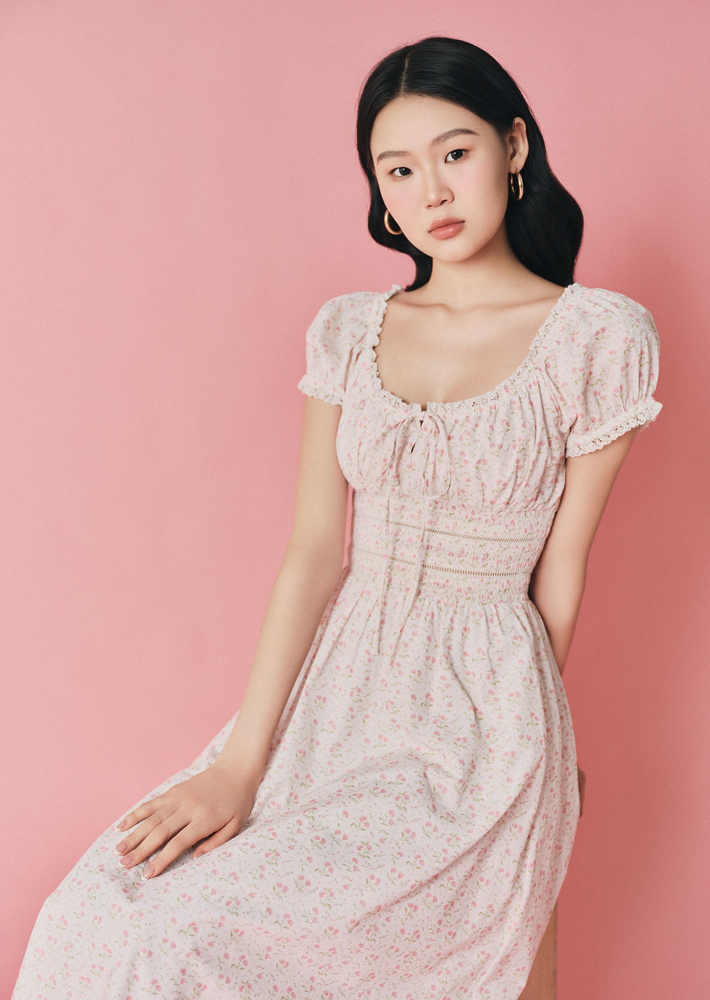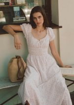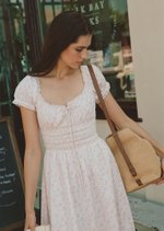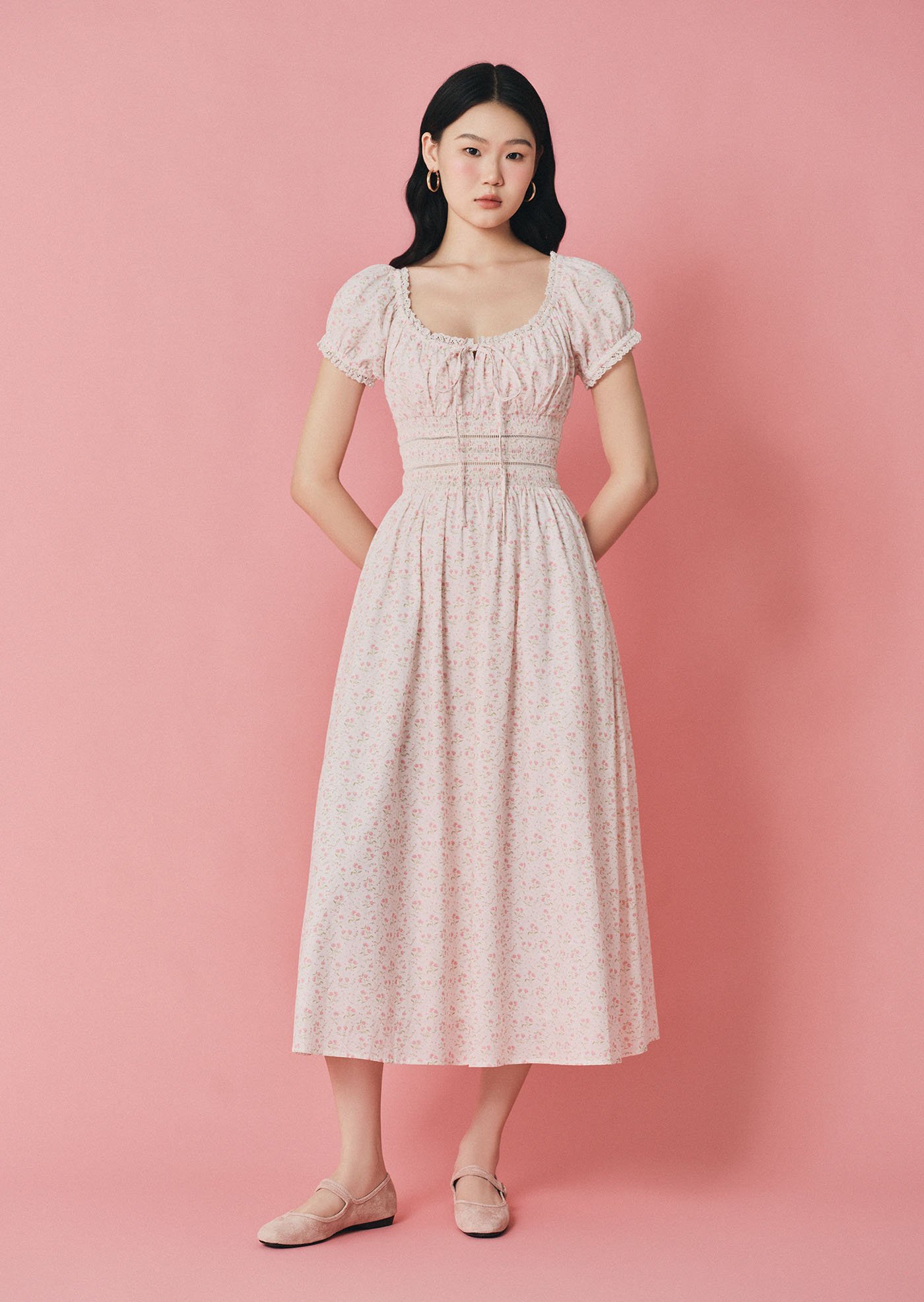 This version of the Maribeth Midi Dress features a soft floral print, delicate lace details, and a gently gathered silhouette that feels romantic, light, and easy for everyday wear.
