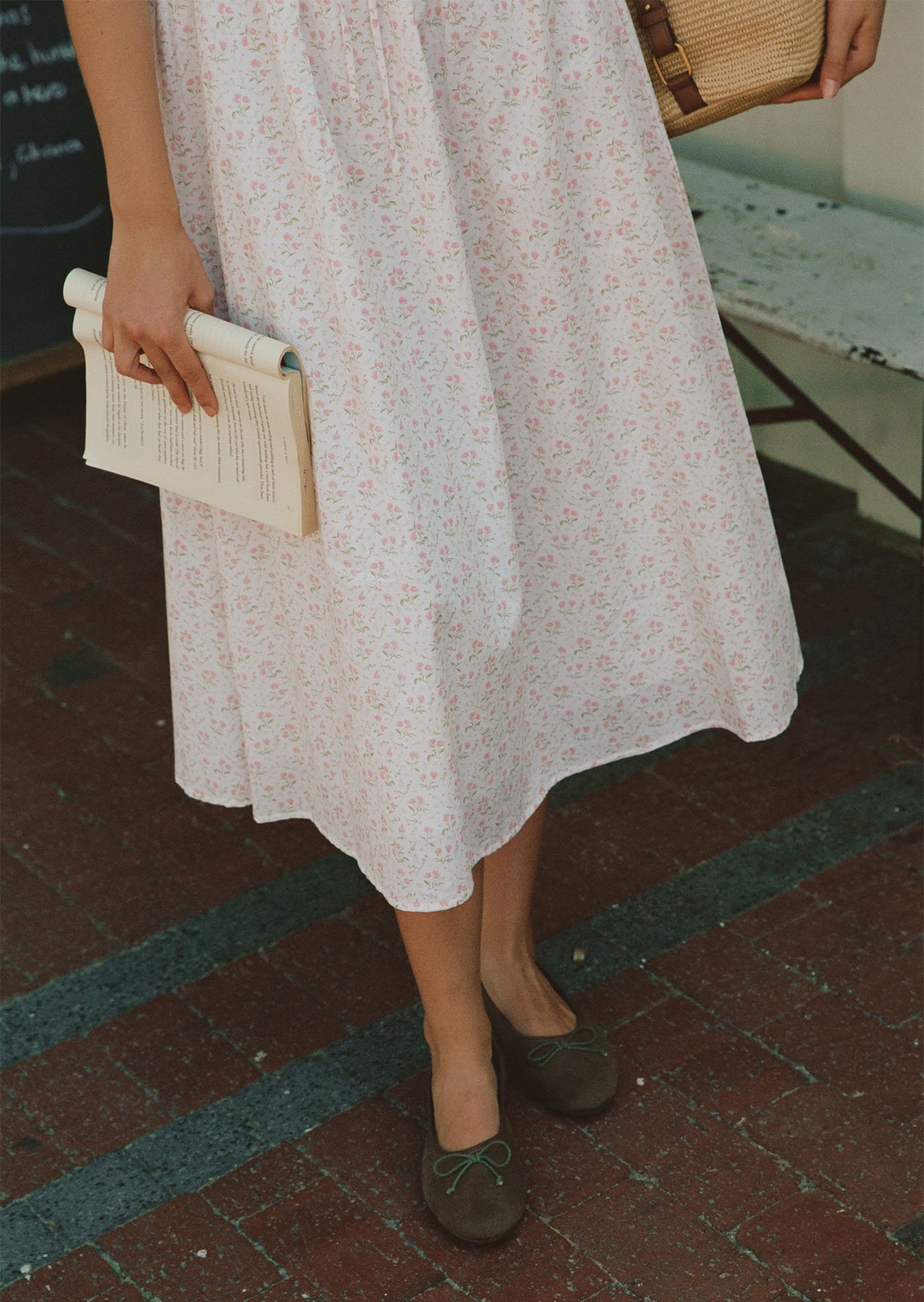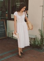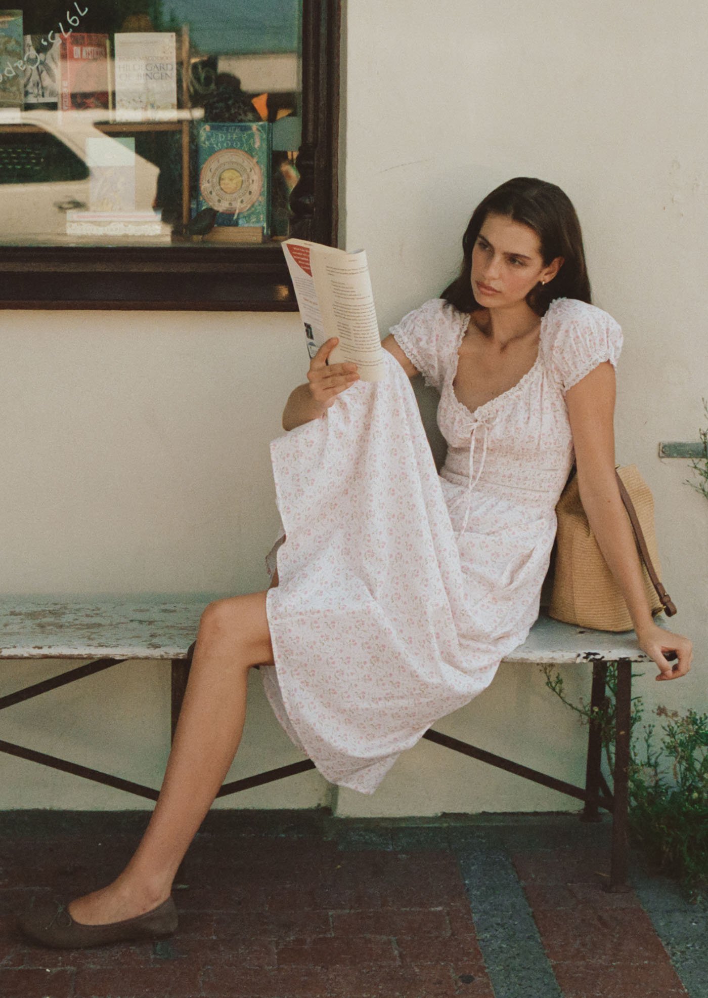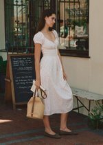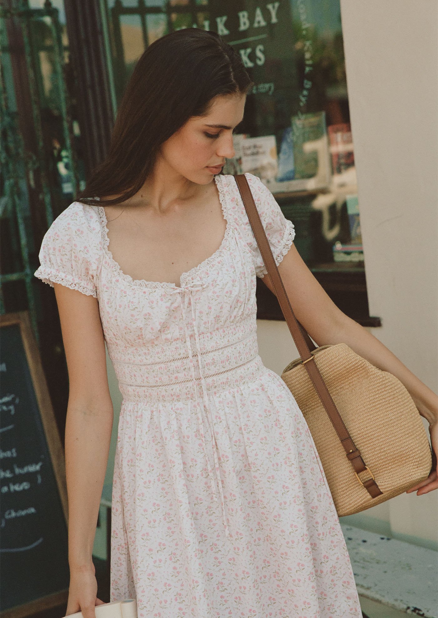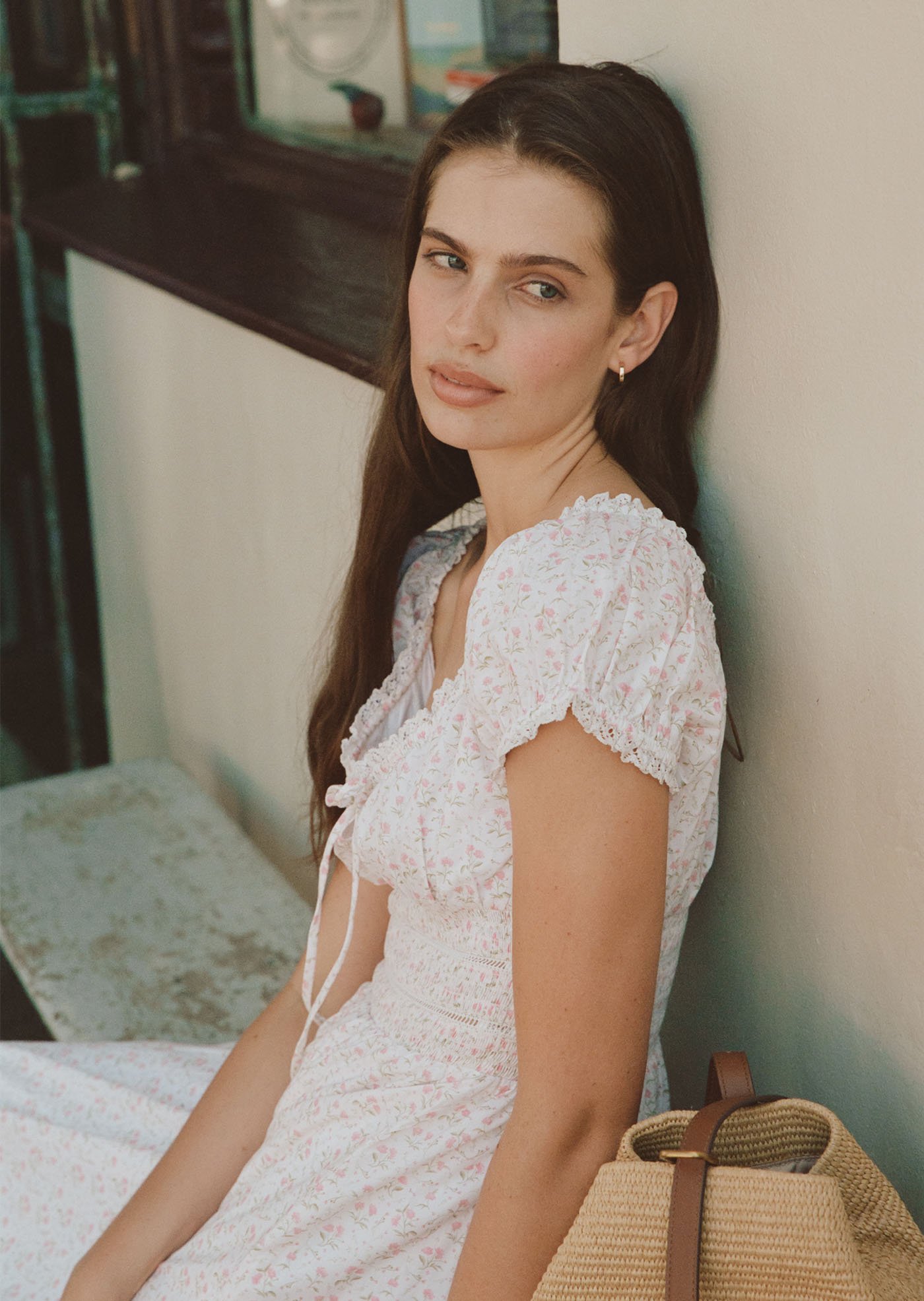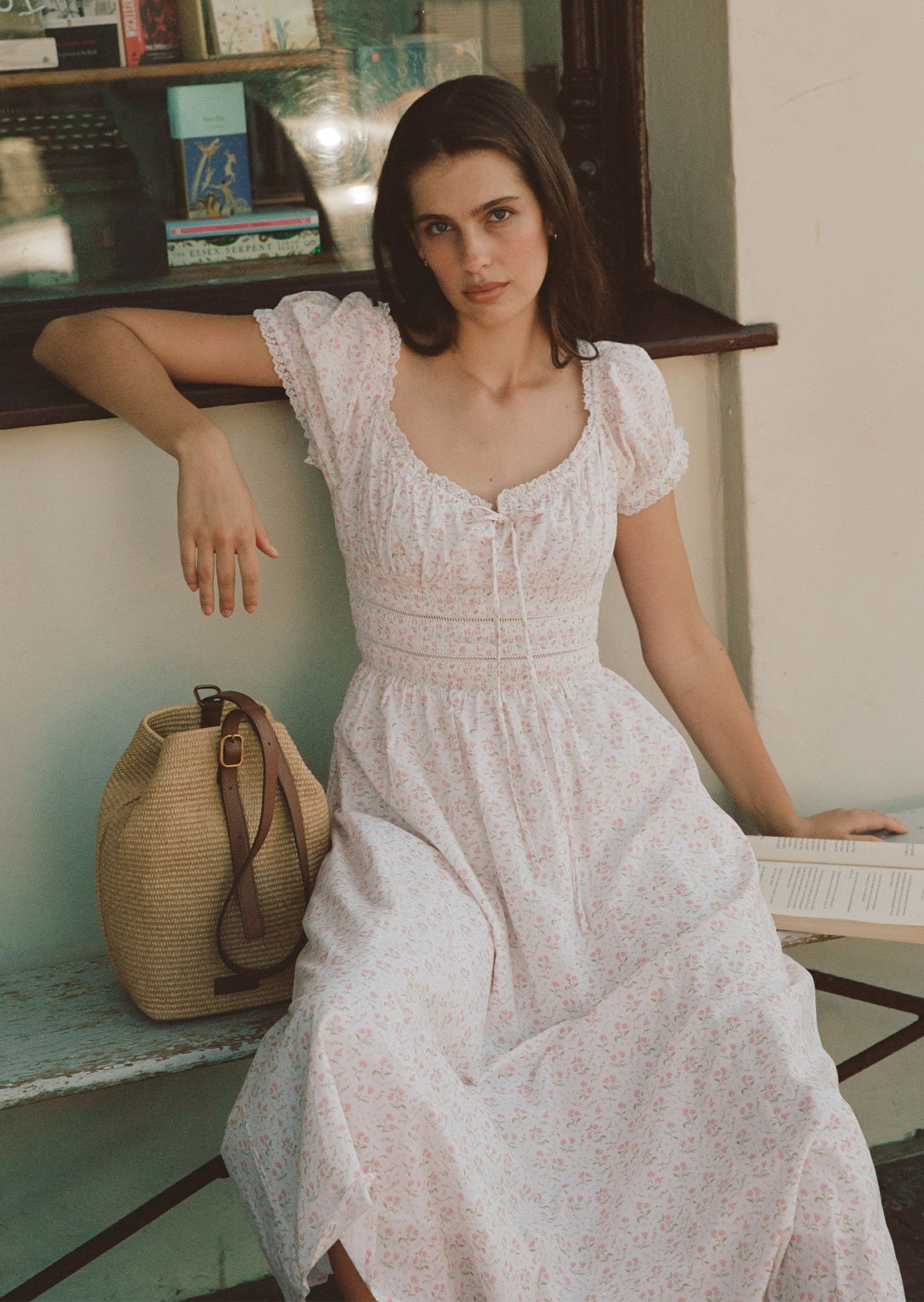 This version of the Maribeth Midi Dress features a soft floral print, delicate lace details, and a gently gathered silhouette that feels romantic, light, and easy for everyday wear.