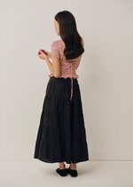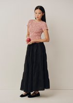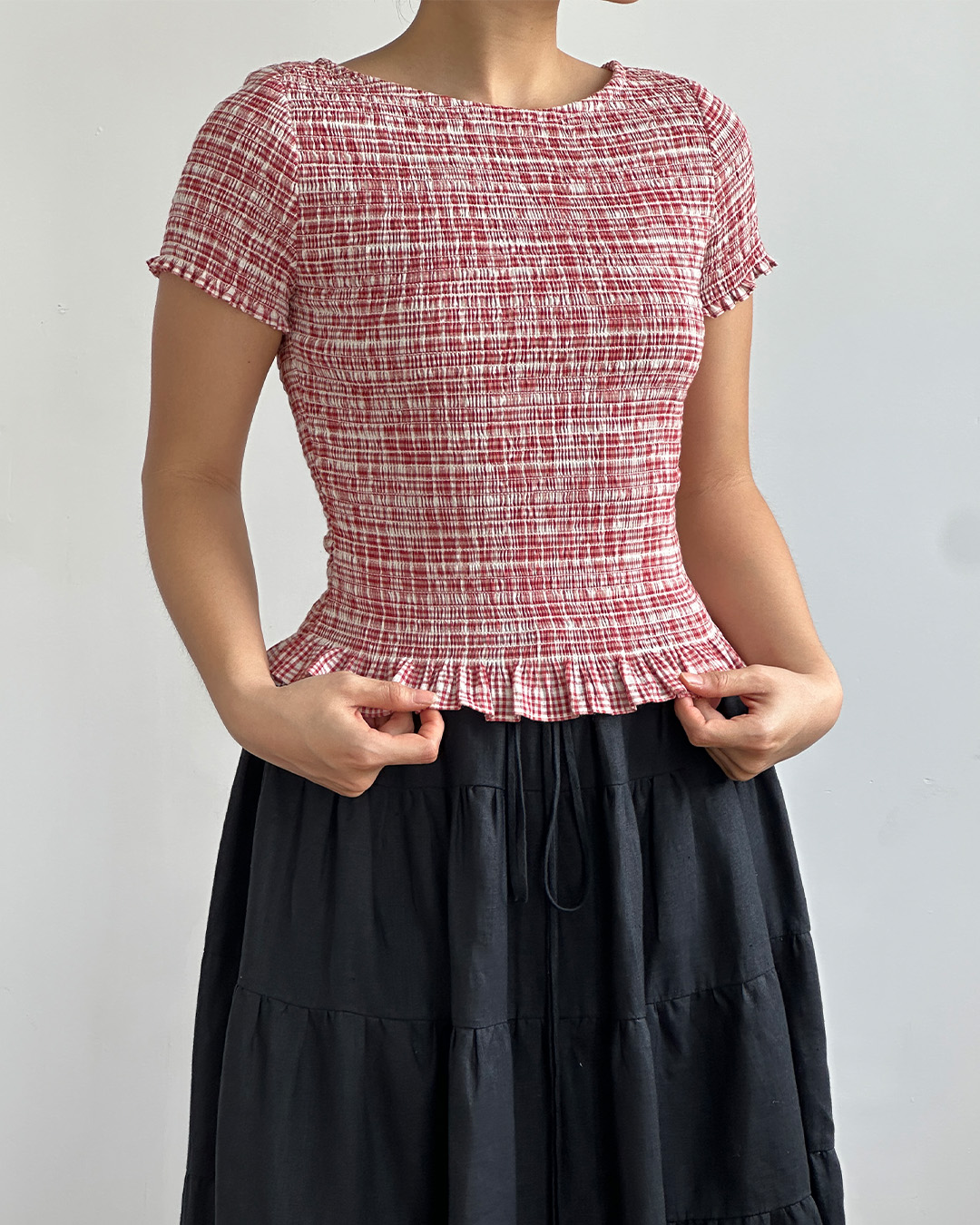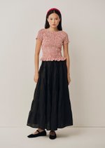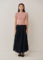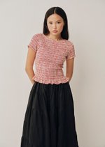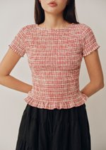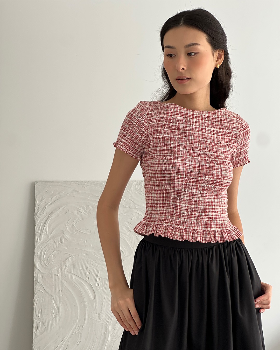 A playful update to a classic silhouette. This fully smocked top hugs gently with just the right amount of stretch, balanced by a soft ruffle hem. Designed with a straight boat neckline and short sleeves, it surprises with cut-out detailing at the back—secured by a hook-and-eye closure and a detachable tie for a touch of versatility.