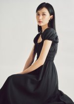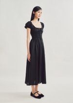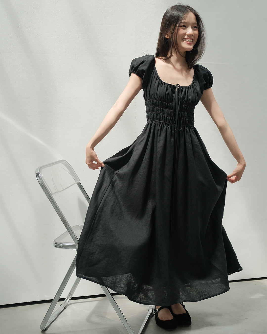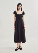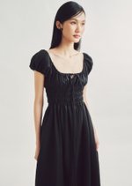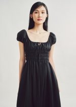 The milkmaid style Mia is a gorgeous midi dress featuring a simple scoop neckline on a ruched bodice with self tie-front and keyhole detailing around the bust. The perfect piece to spruce up your date night.
