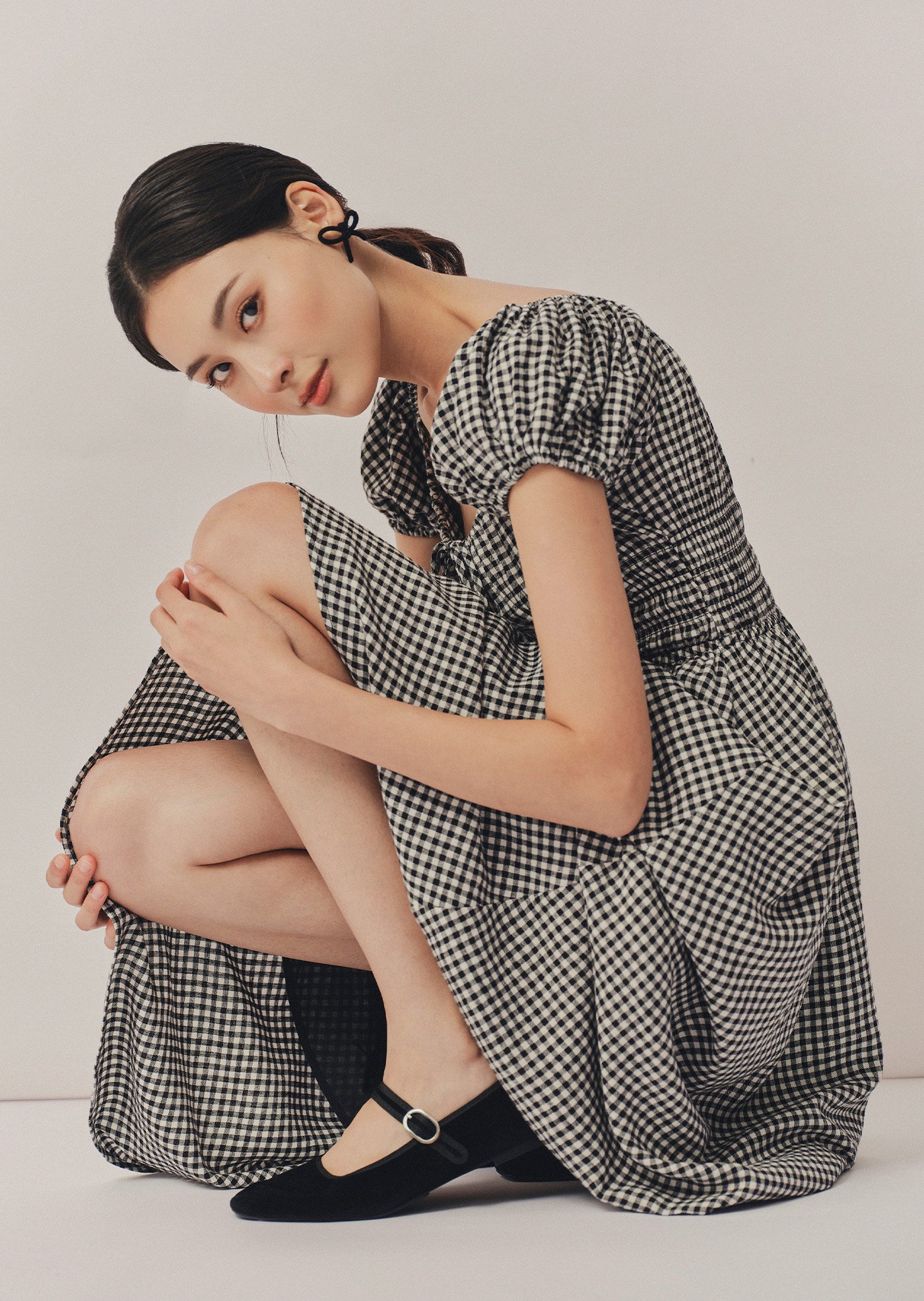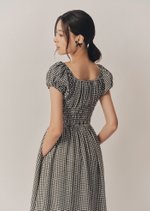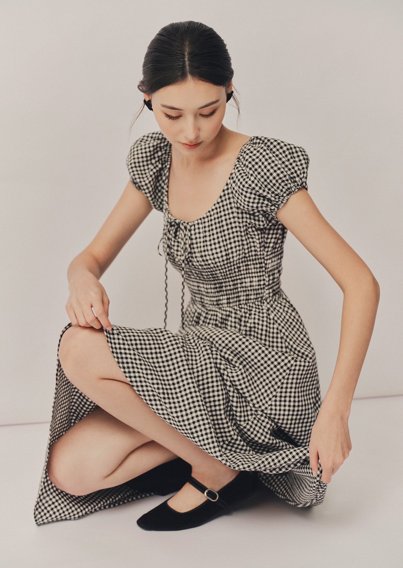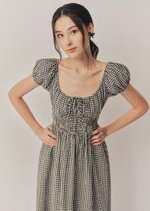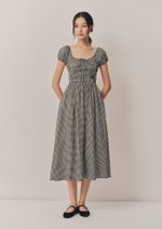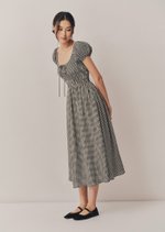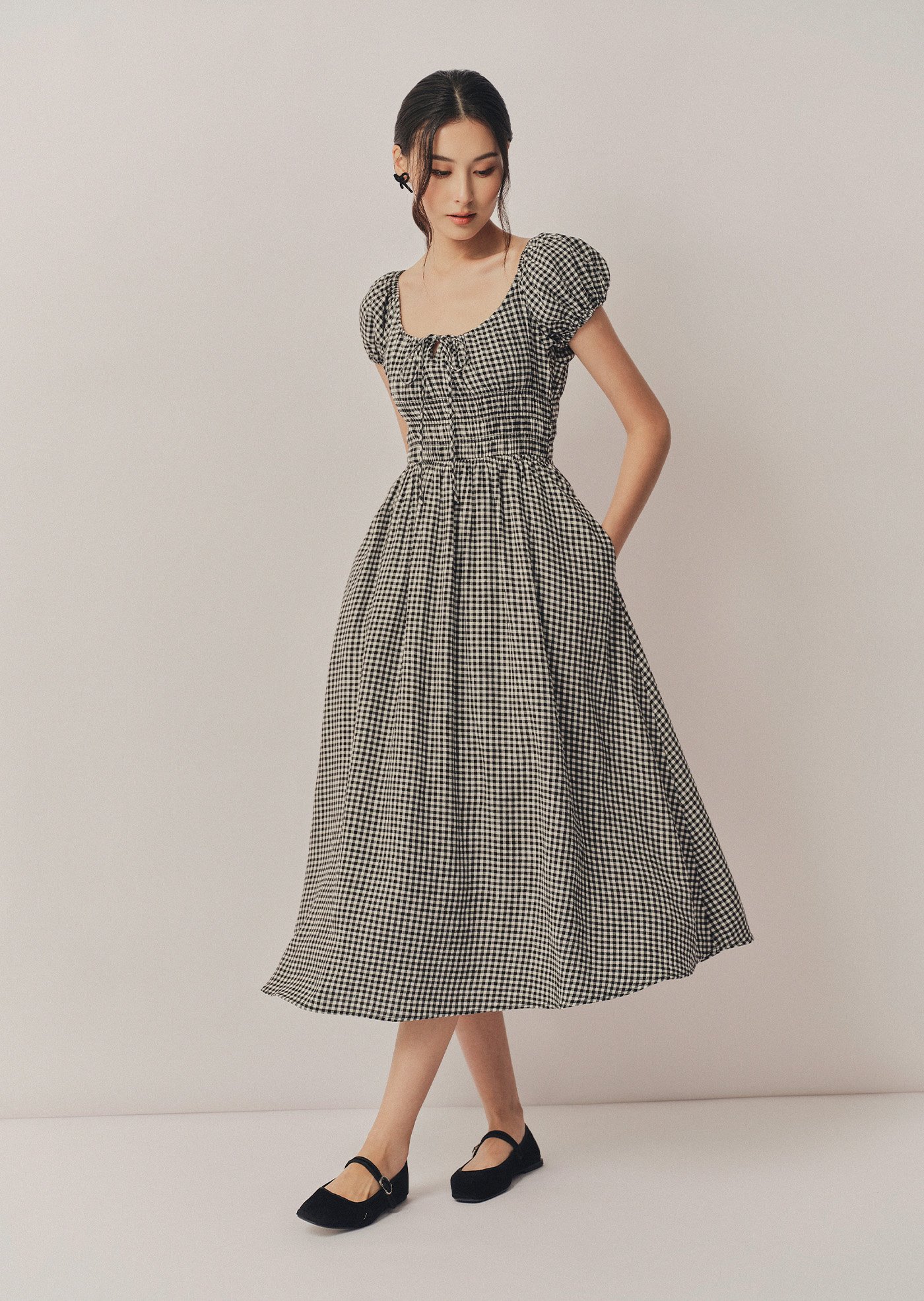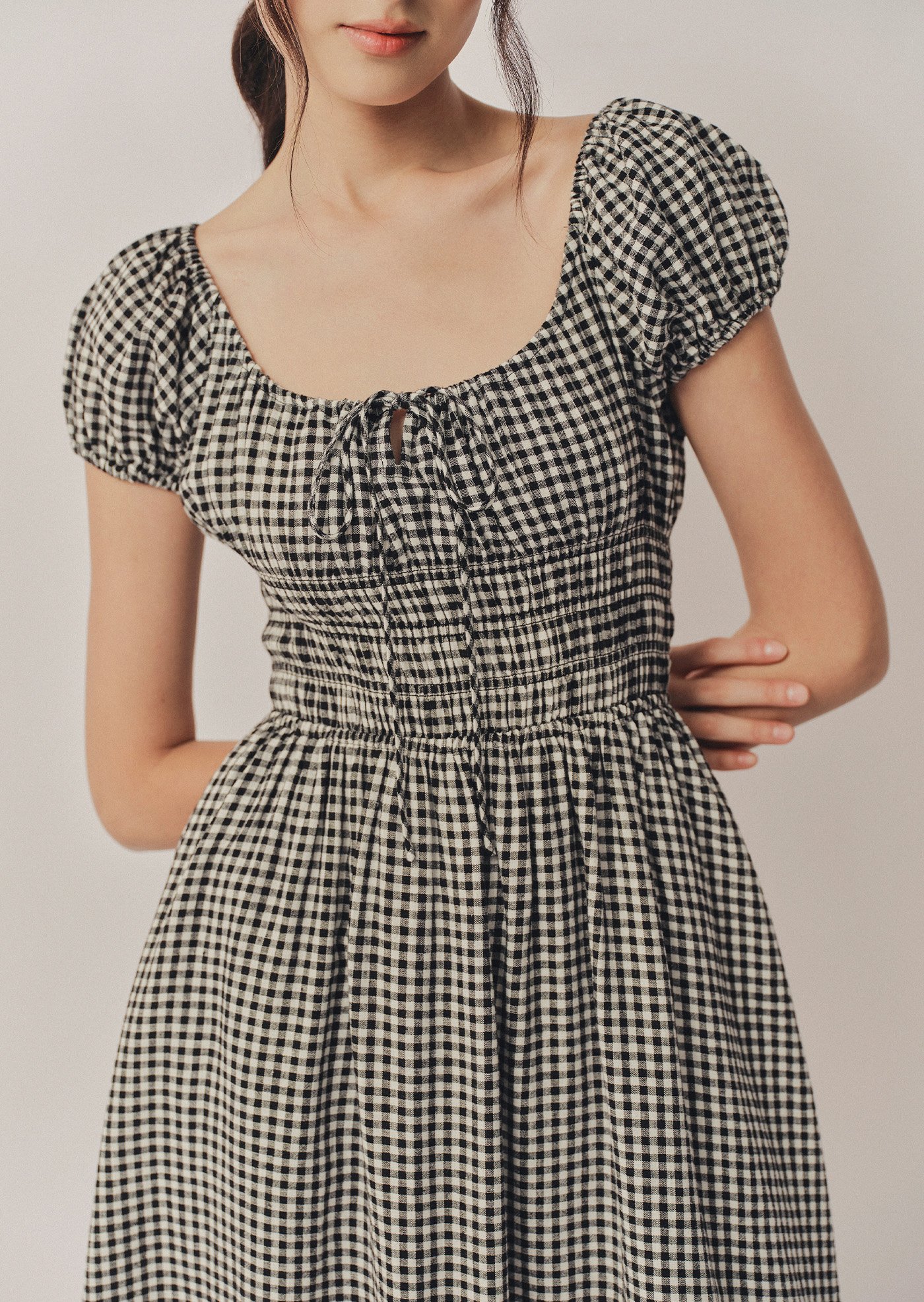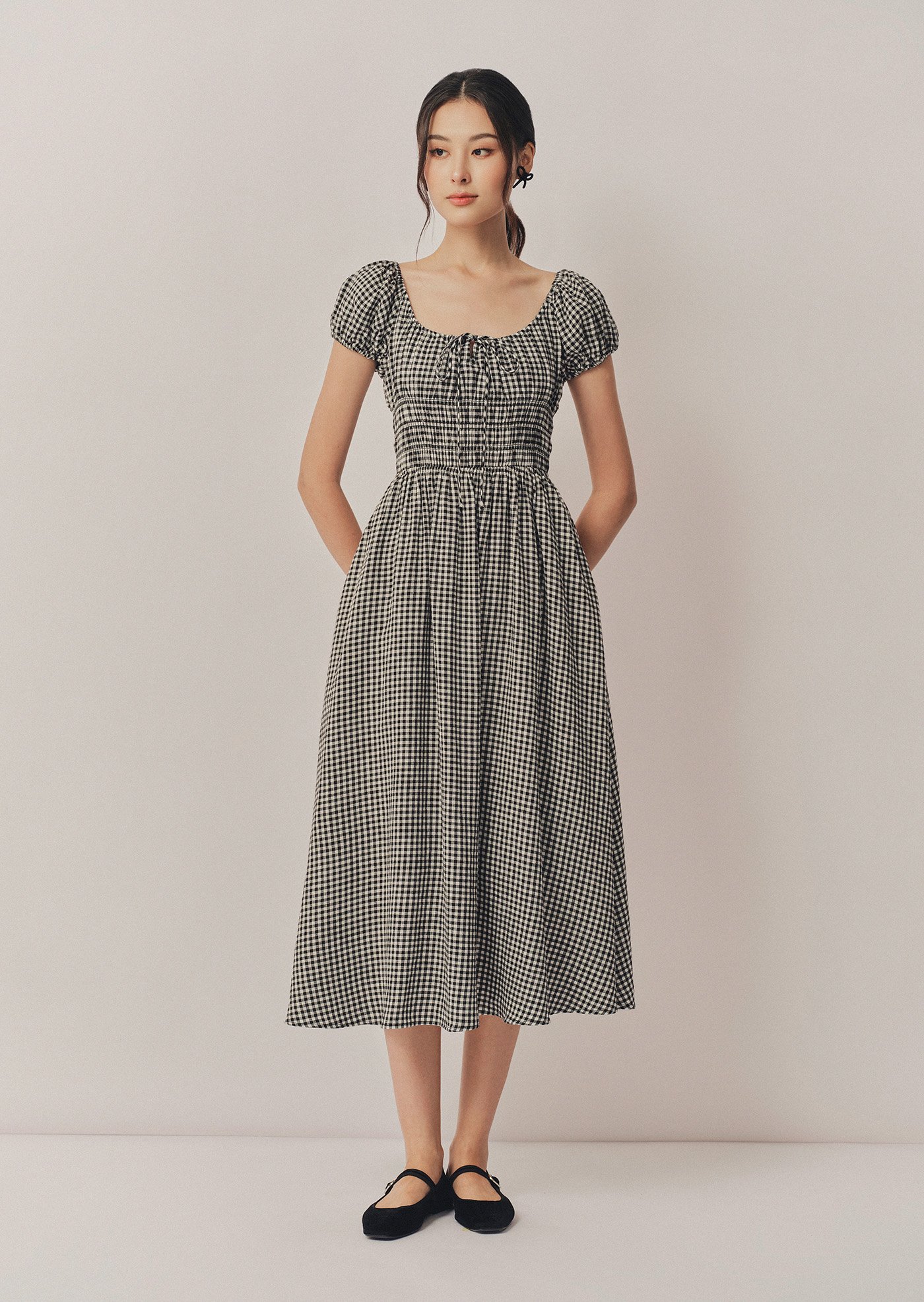 The milkmaid style Mia is a gorgeous midi dress featuring a simple scoop neckline on a ruched bodice with self tie-front and keyhole detailing around the bust. The perfect piece to spruce up your date night
