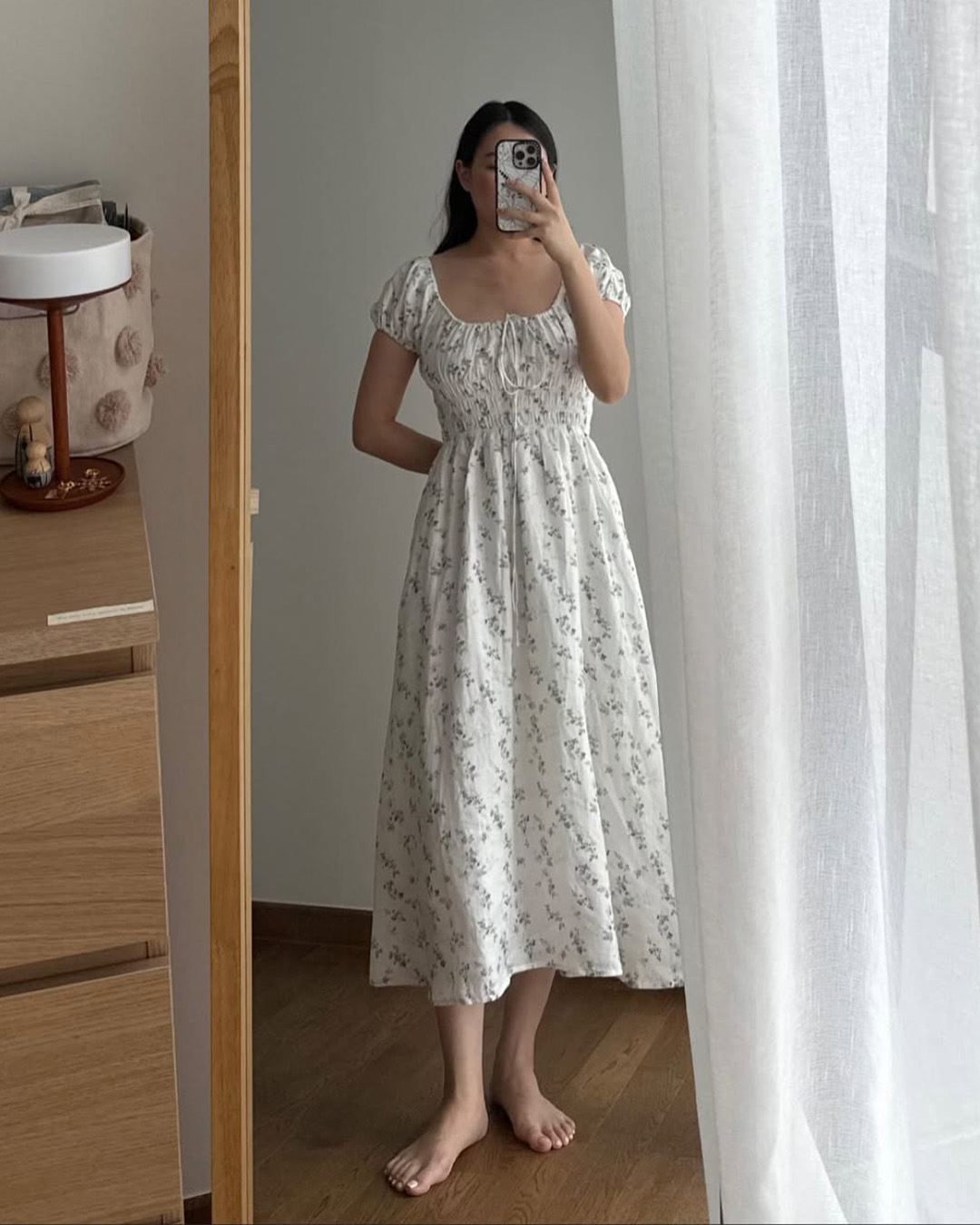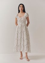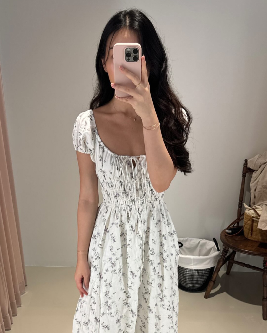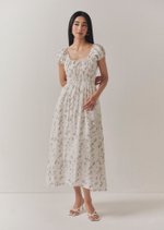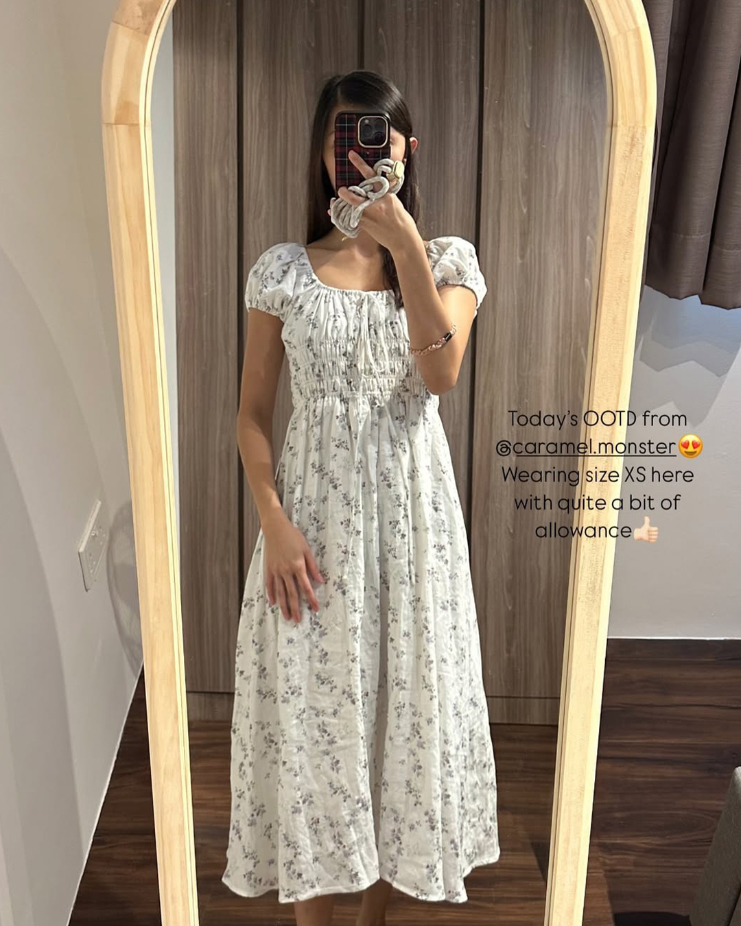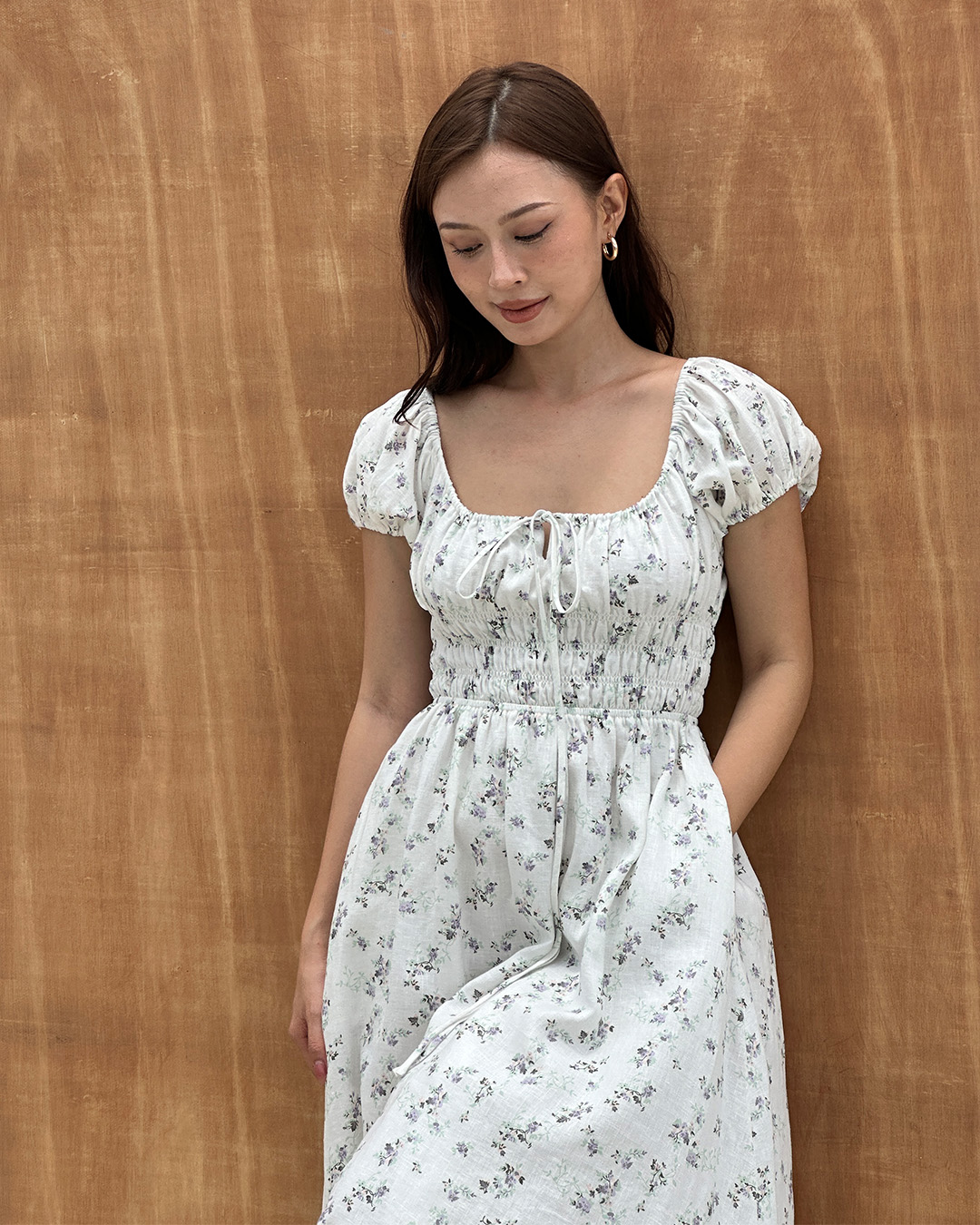The milkmaid style Mia is a gorgeous midi dress featuring a simple scoop neckline on a ruched bodice with self tie-front and keyhole detailing around the bust. The perfect piece to spruce up your date night.