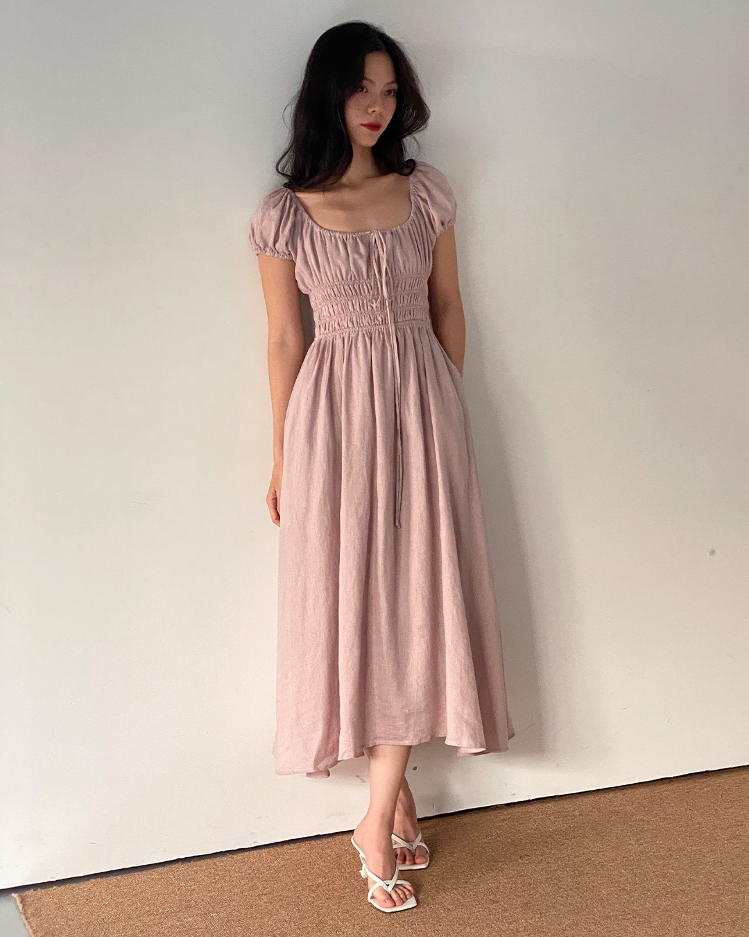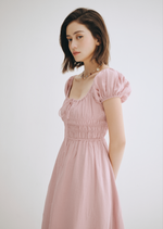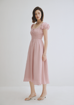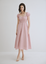 The milkmaid style Mia is a gorgeous midi dress featuring a simple scoop neckline on a ruched bodice with self tie-front and keyhole detailing around the bust. The perfect piece to spruce up your date night.