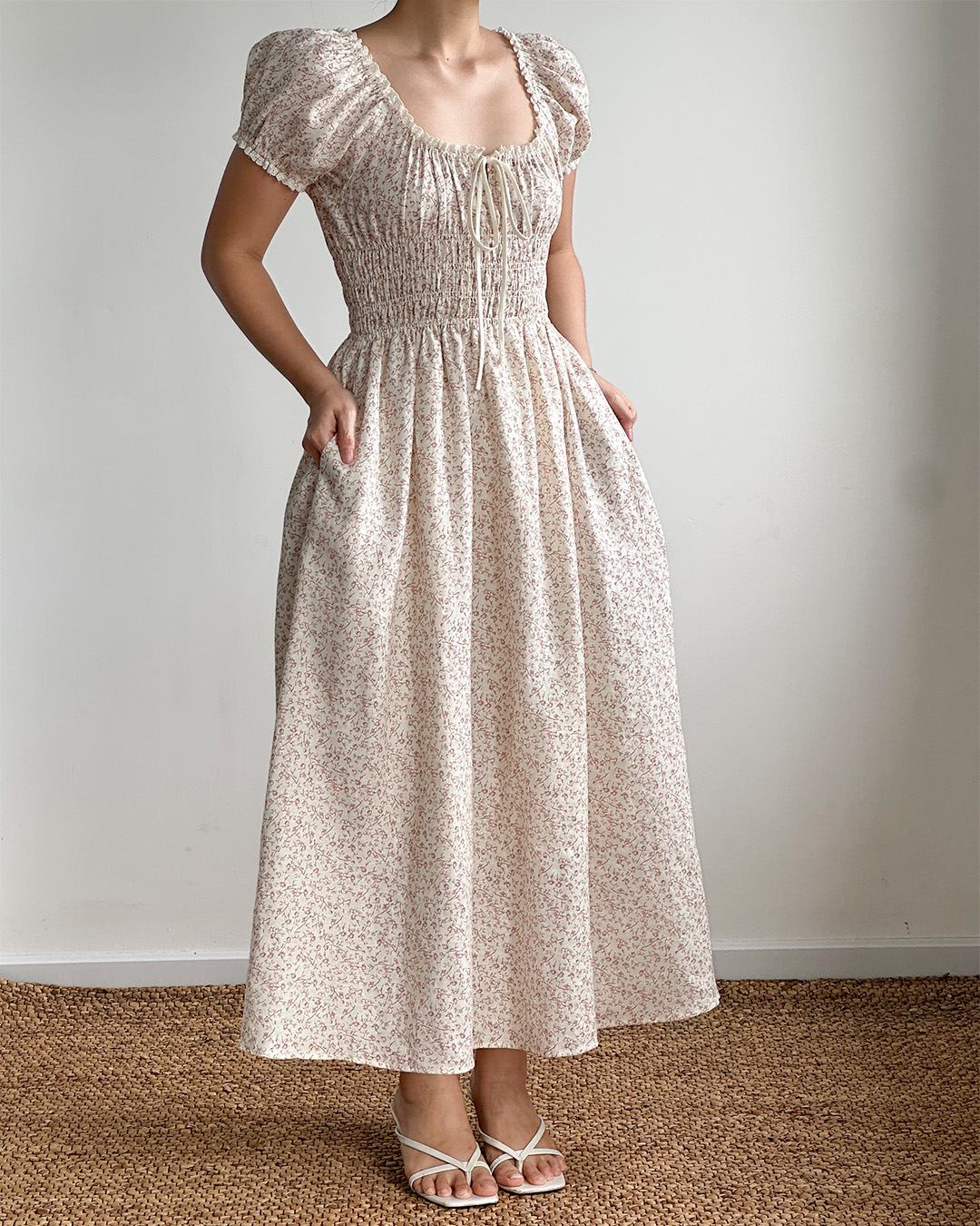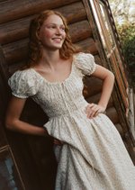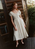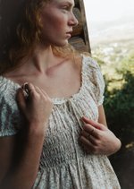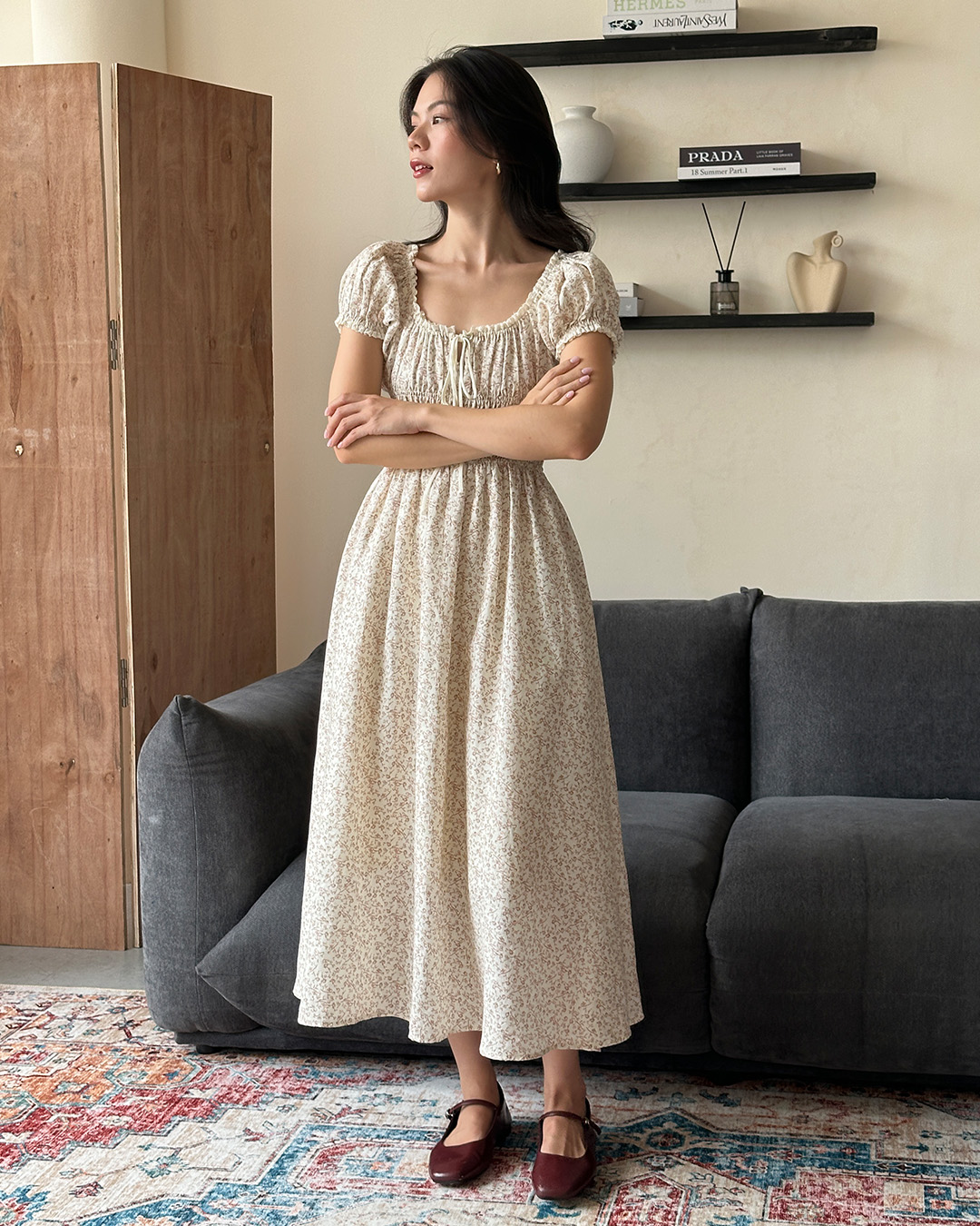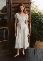 The milkmaid style Mia is a gorgeous midi dress featuring a simple scoop neckline on a ruched bodice with self tie-front and keyhole detailing around the bust. The perfect piece to spruce up your date night.