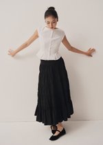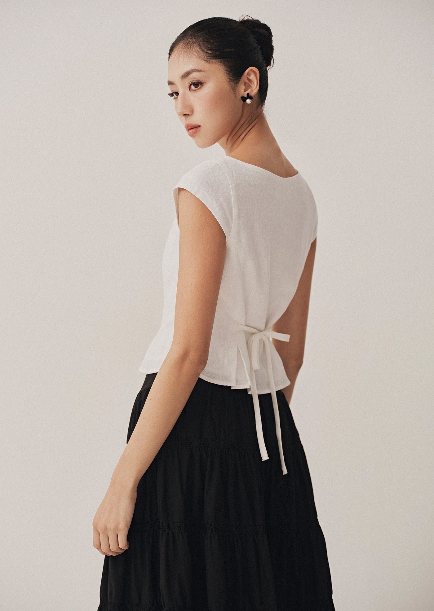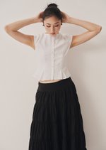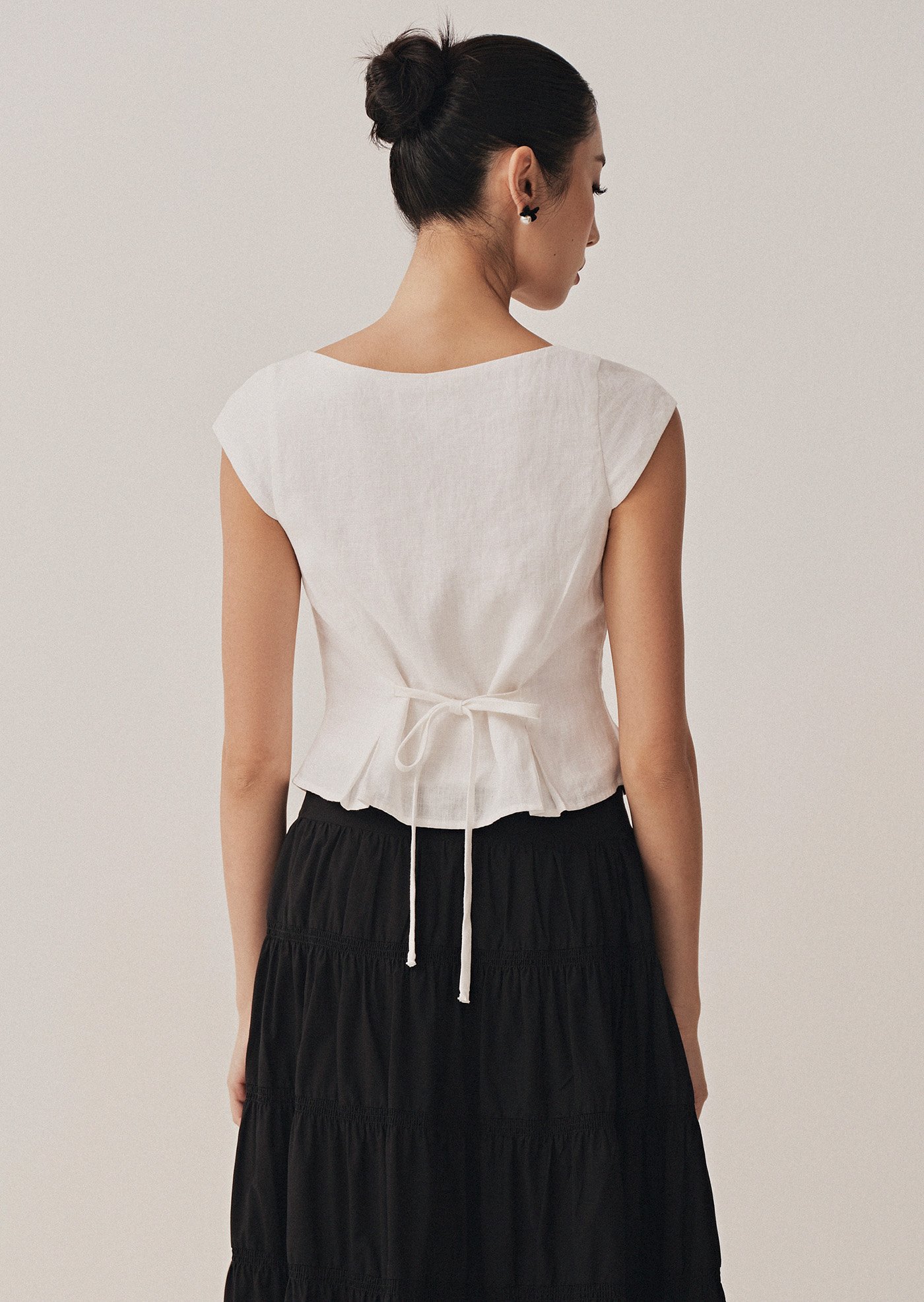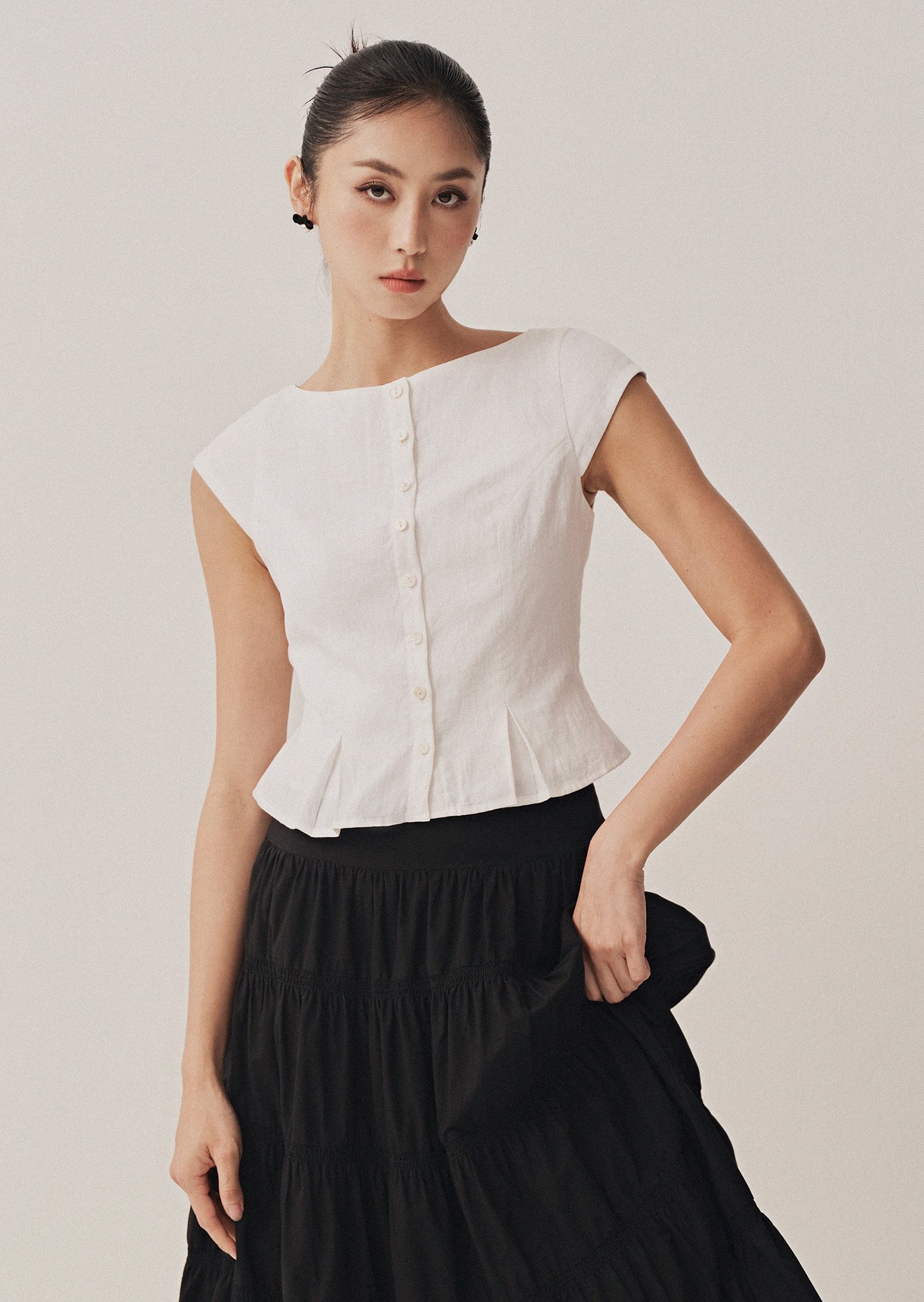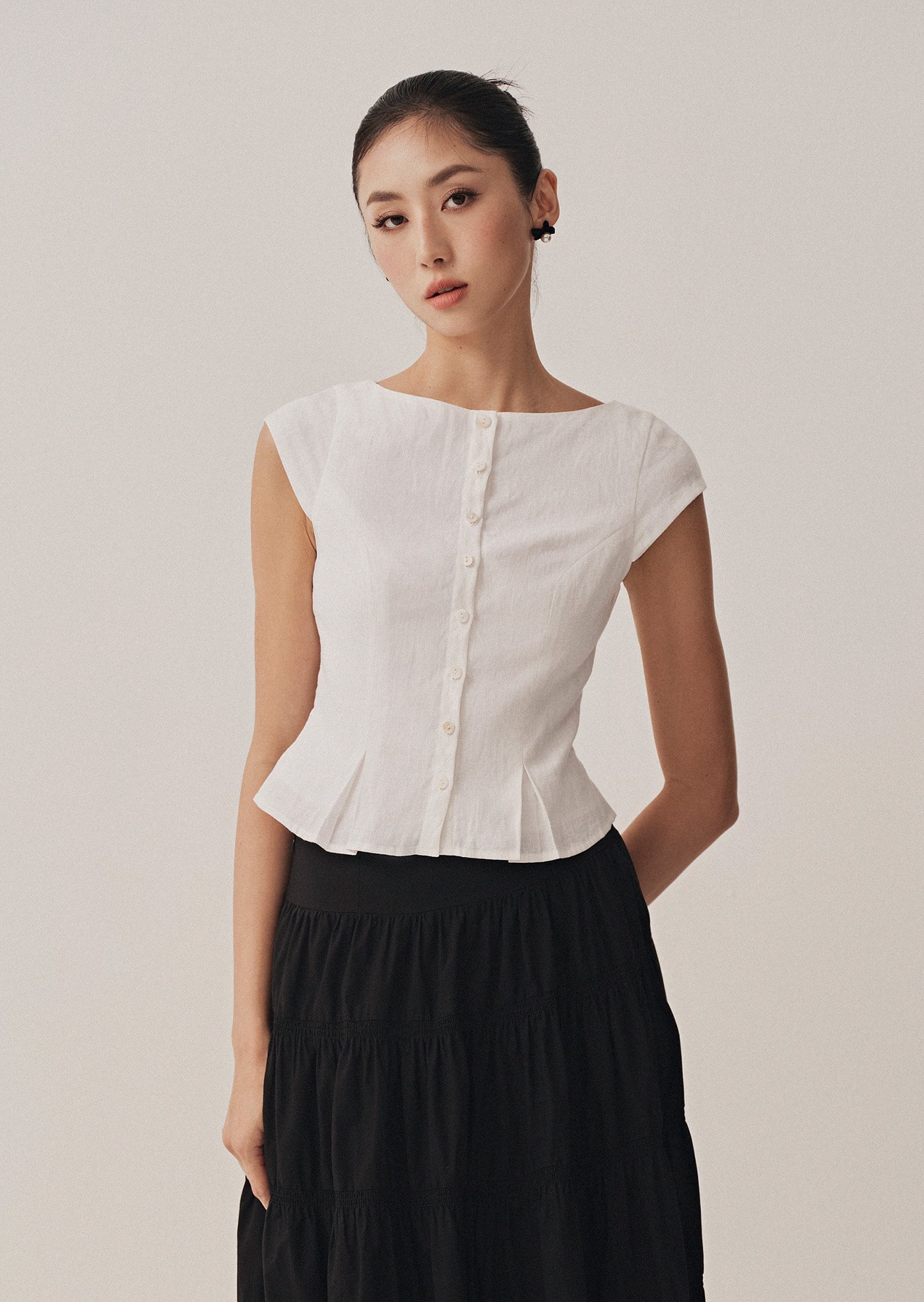 The Nolie Top is a clean, tailored silhouette with a soft round neckline, front button closure, and subtle pleats at the hem for a structured yet feminine finish. Crafted from breathable cotton-linen, it’s a versatile piece to pair effortlessly with skirts or trousers.