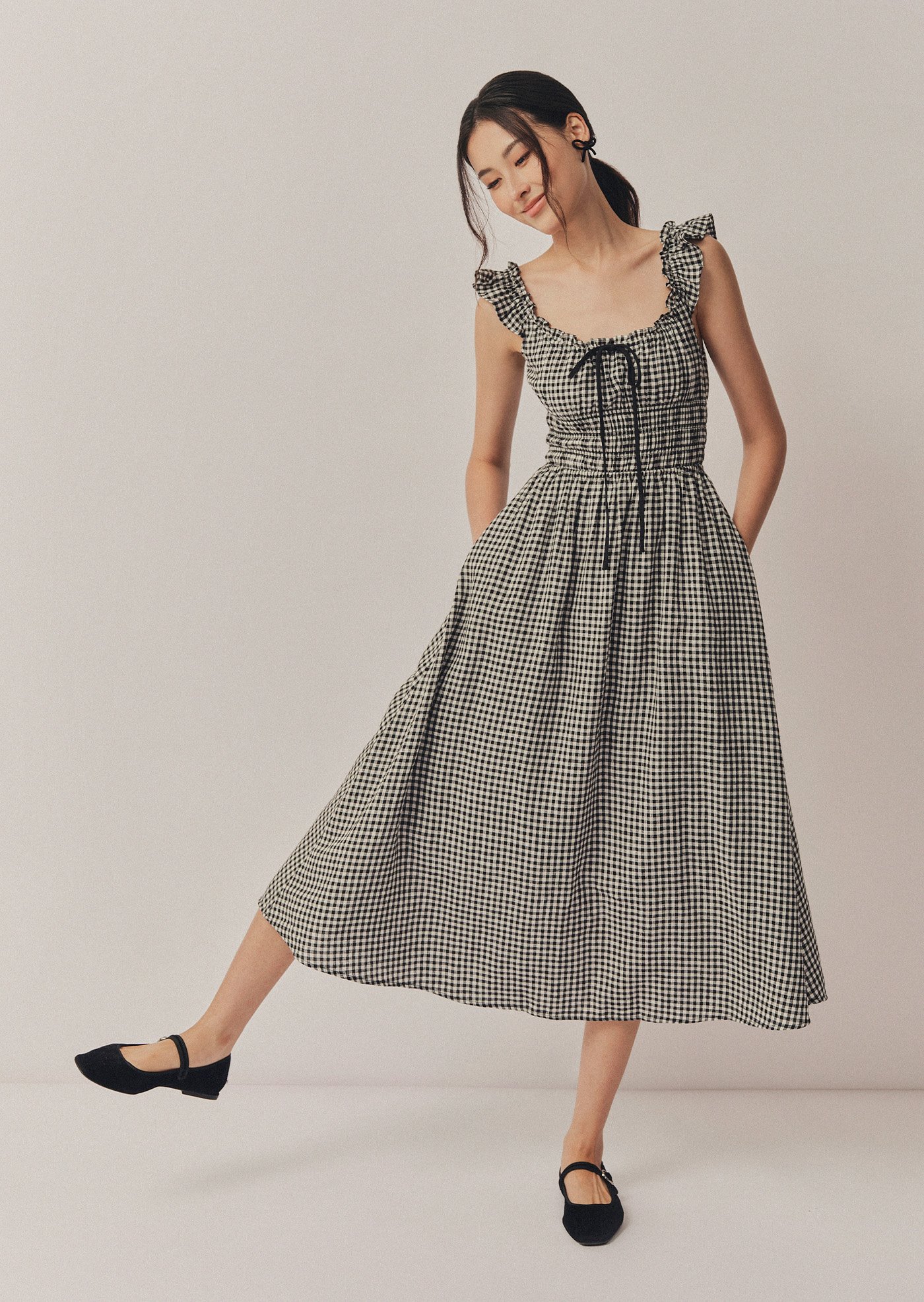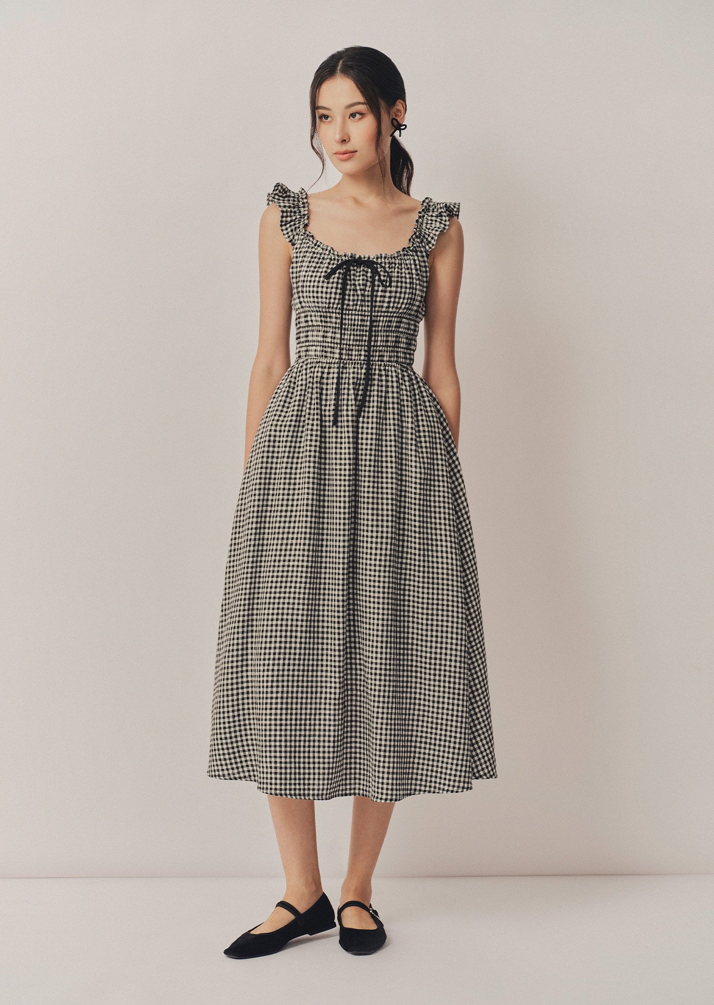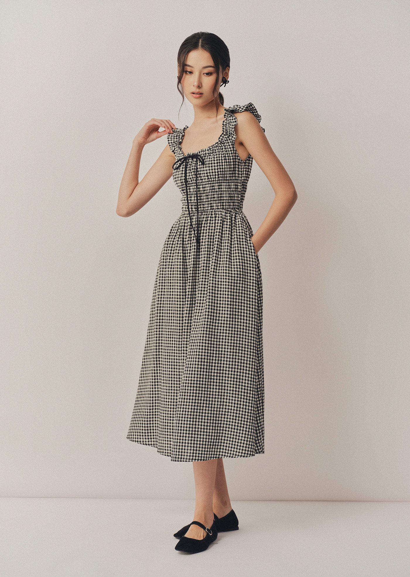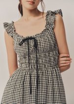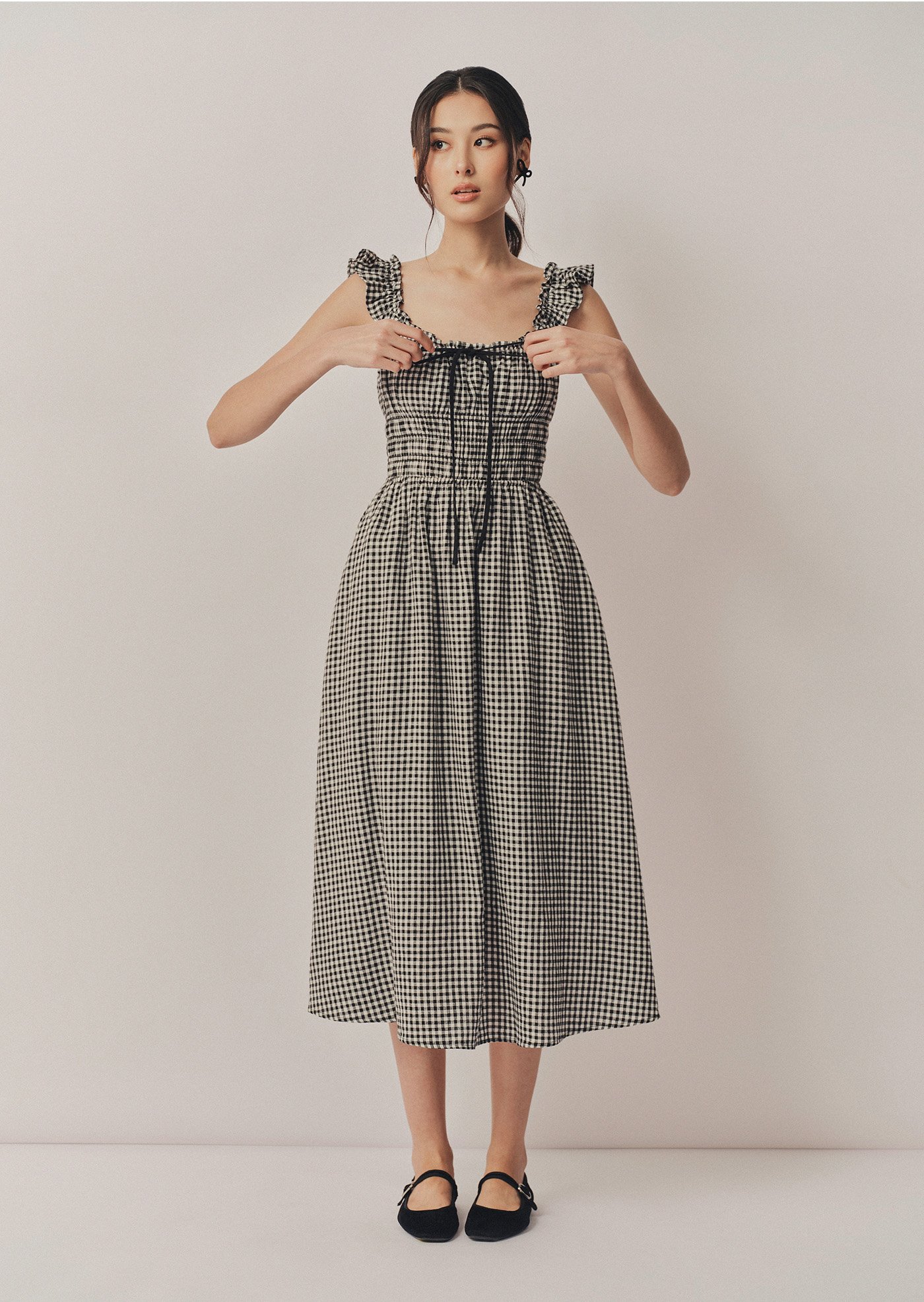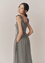 The Noore Midi Dress captures timeless charm in soft gingham. Designed with a smocked bodice and ruffled straps, it’s effortlessly feminine and comfortable — a piece made for slow mornings, afternoon strolls, and everything in between.