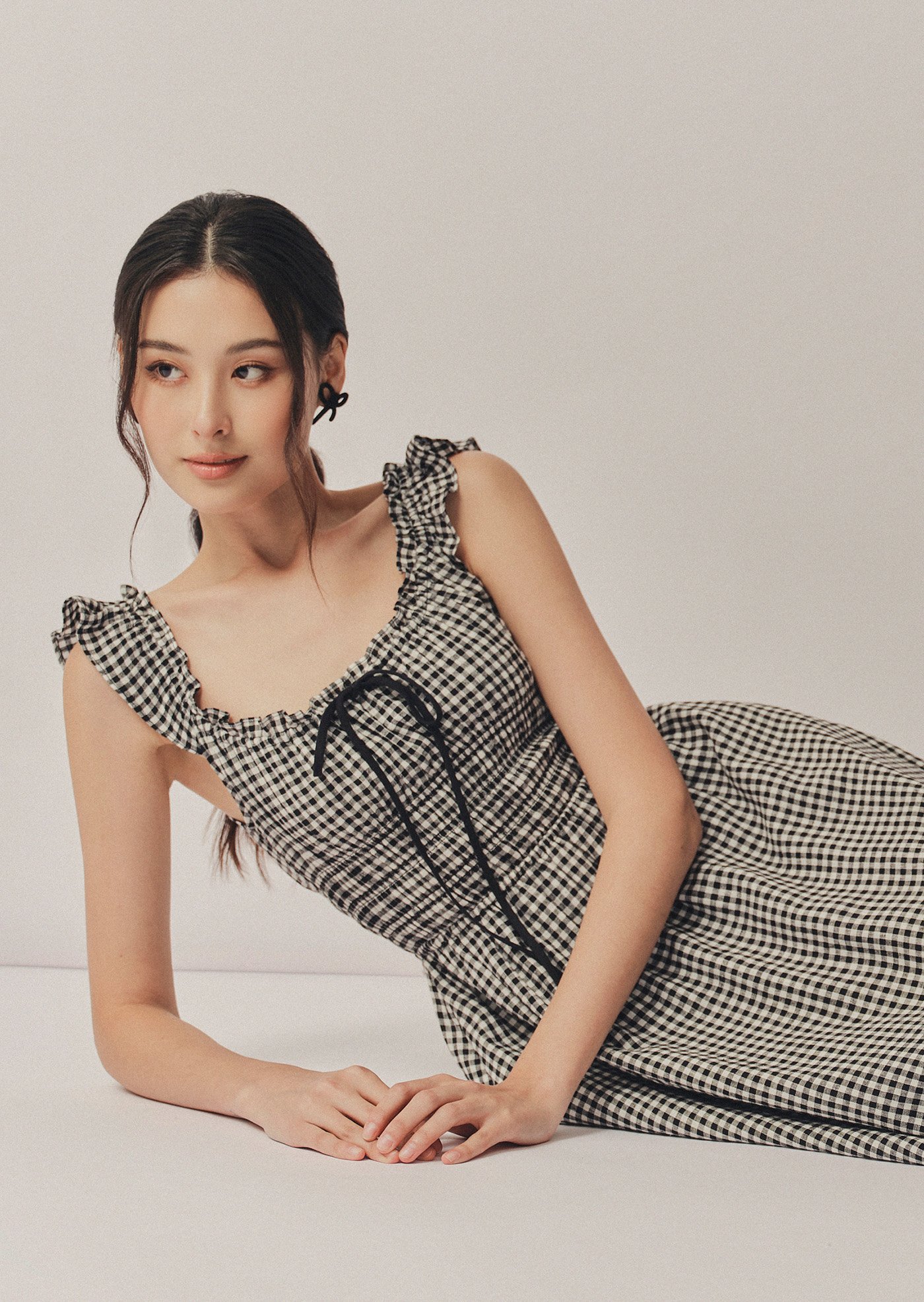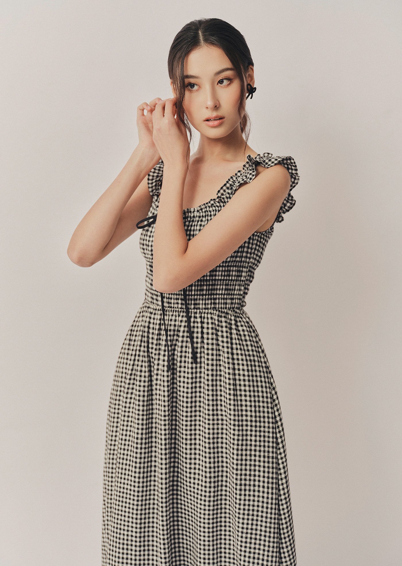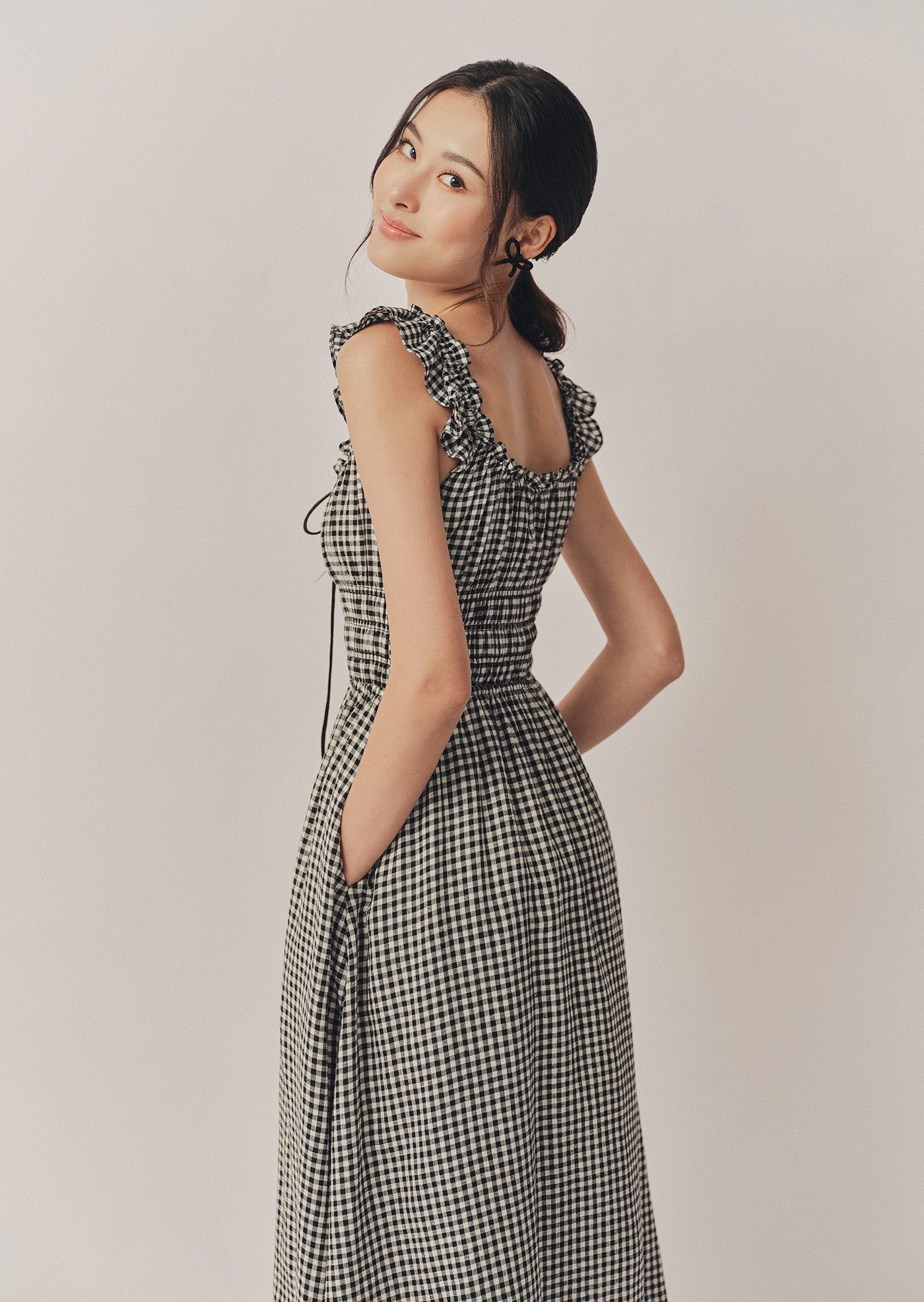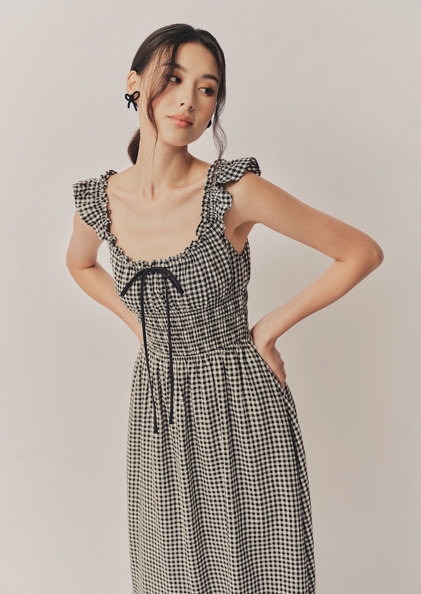 The Noore Midi Dress captures timeless charm in soft gingham. Designed with a smocked bodice and ruffled straps, it’s effortlessly feminine and comfortable — a piece made for slow mornings, afternoon strolls, and everything in between.