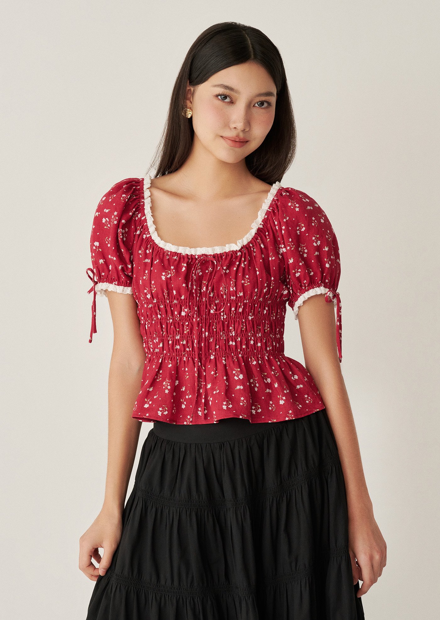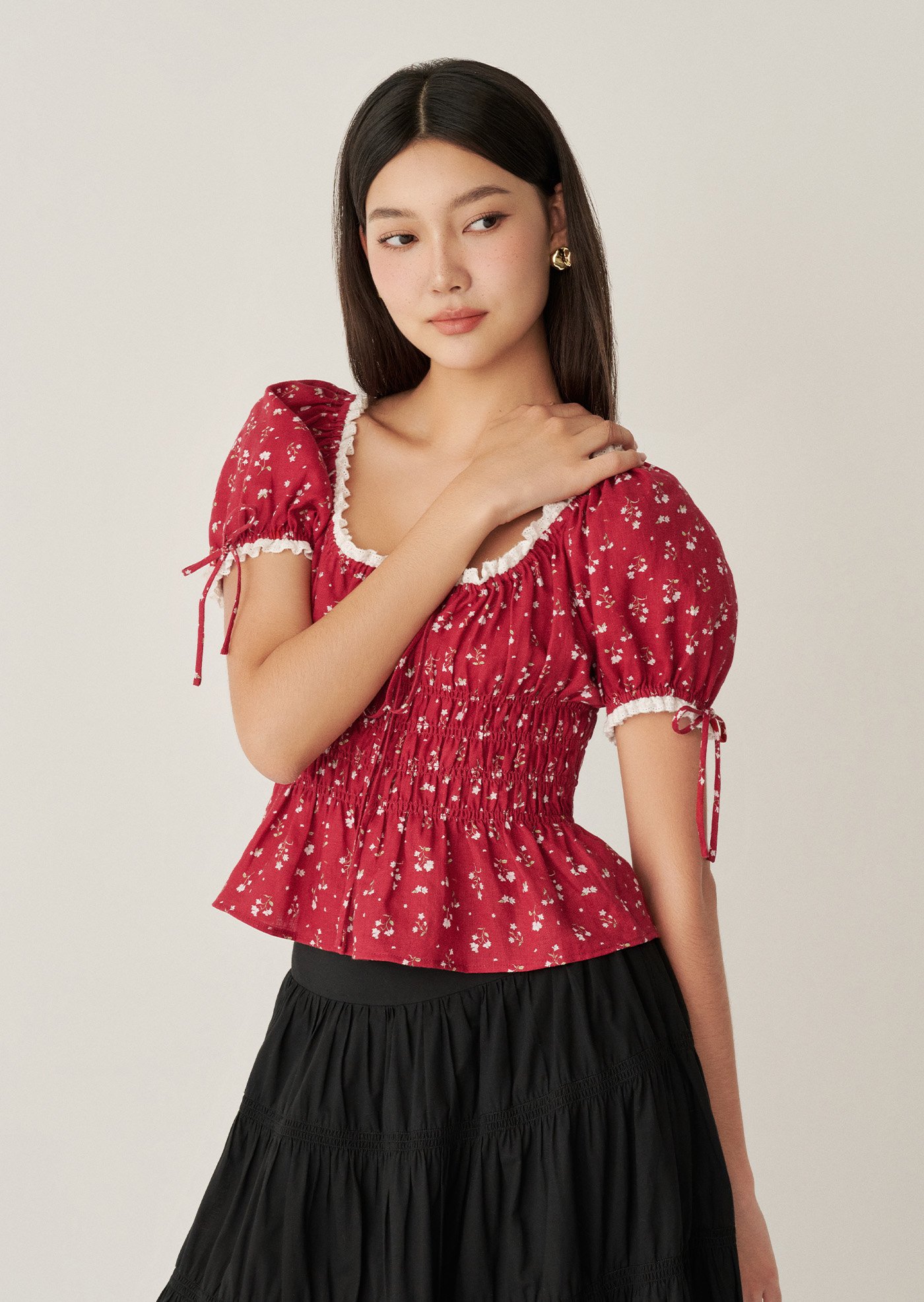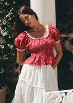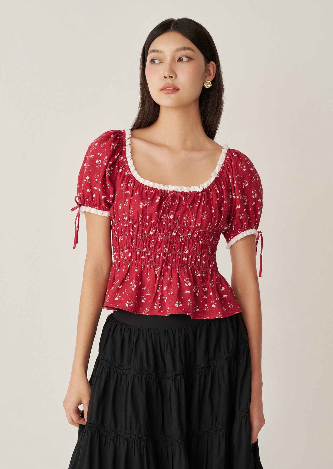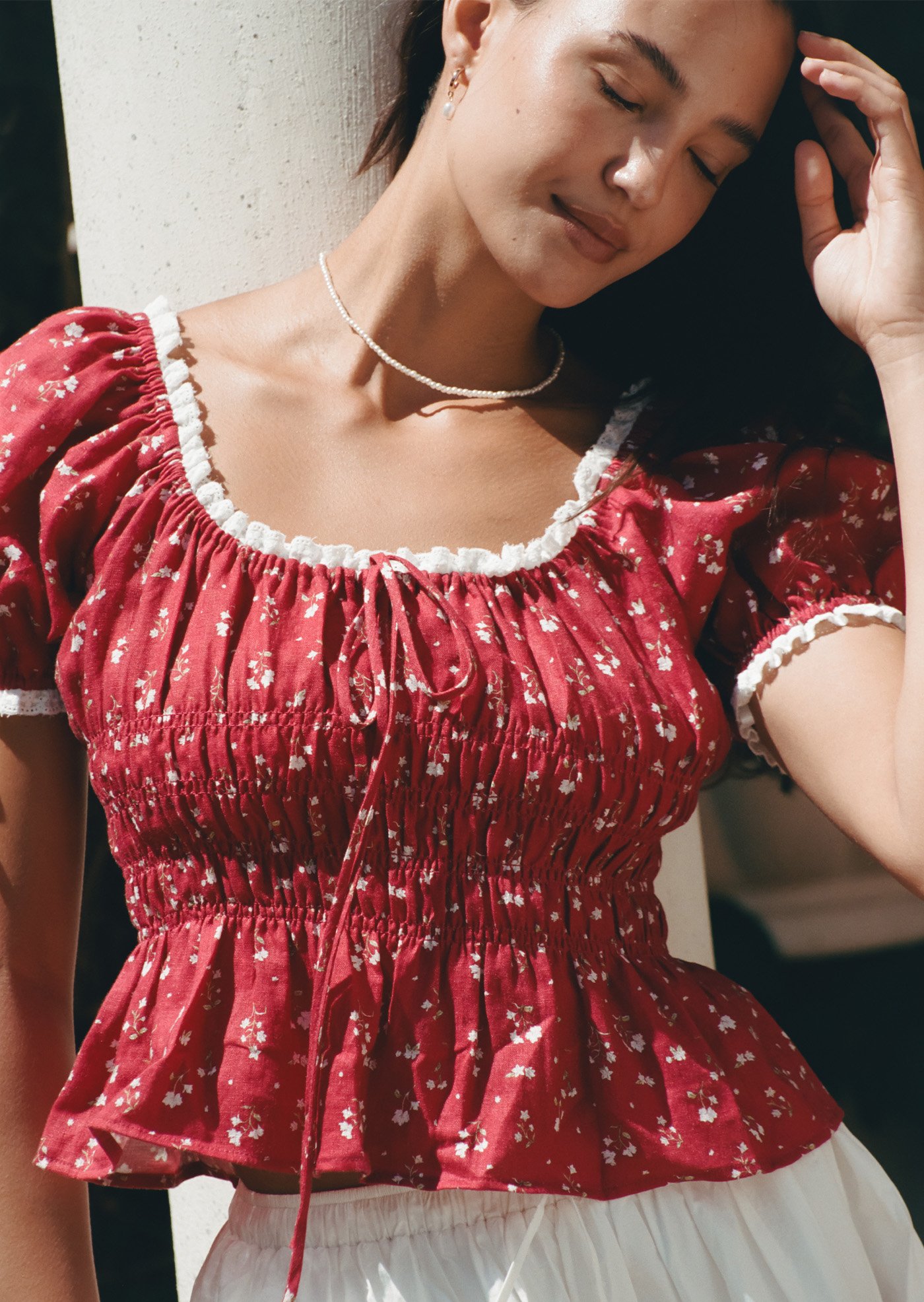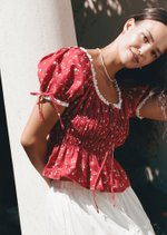 The Nova Top blends vintage romance with modern charm, featuring puffy sleeves, a smocked bodice, and a flattering scoop neckline. An adjustable ribbon tie adds a delicate touch, making it effortlessly stylish for any occasion.