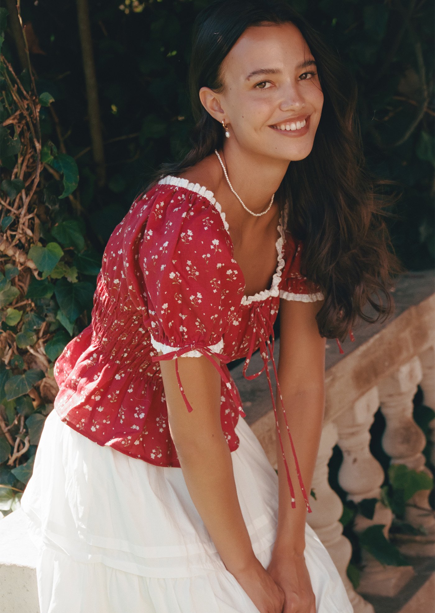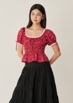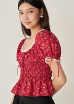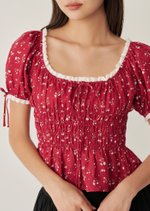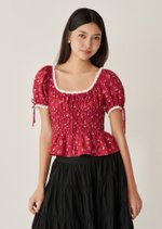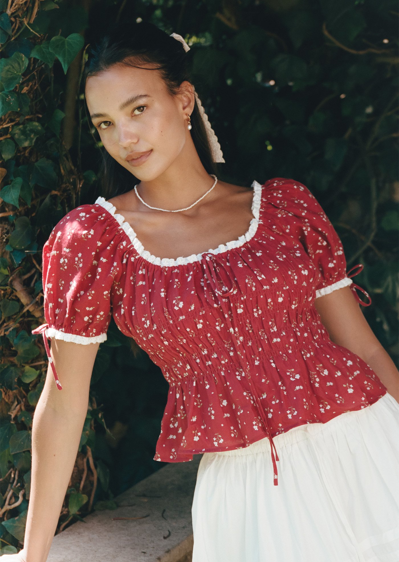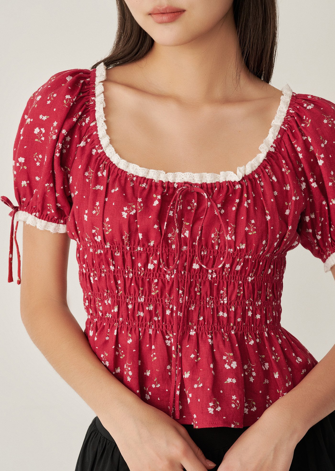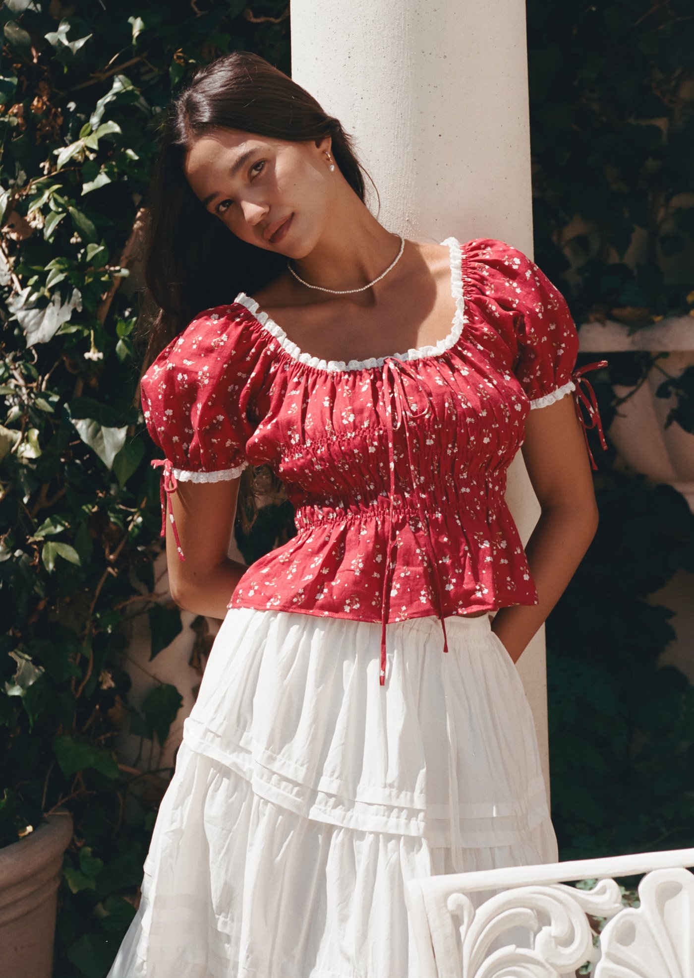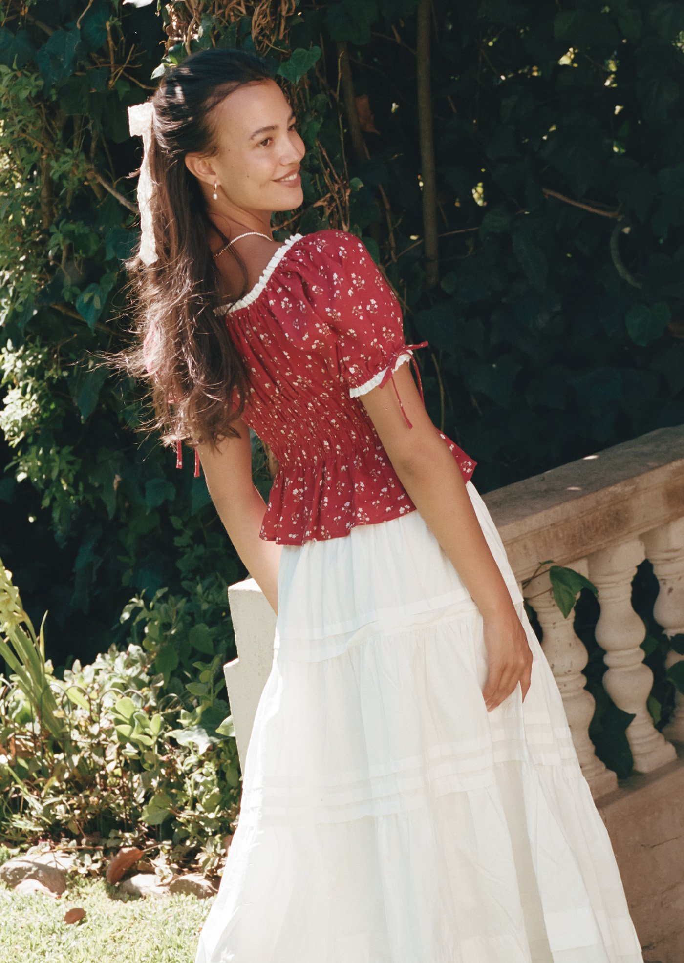 The Nova Top blends vintage romance with modern charm, featuring puffy sleeves, a smocked bodice, and a flattering scoop neckline. An adjustable ribbon tie adds a delicate touch, making it effortlessly stylish for any occasion.
