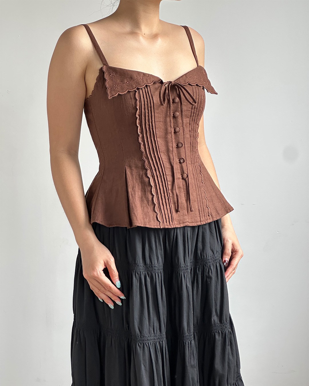 The Ozzy Peplum Top is a vintage-inspired piece crafted from breathable linen, featuring a scalloped neckline, pintuck details, and a soft peplum flare. Finished with fabric-covered buttons and adjustable straps, it’s an effortlessly romantic addition to warm-weather dressing.