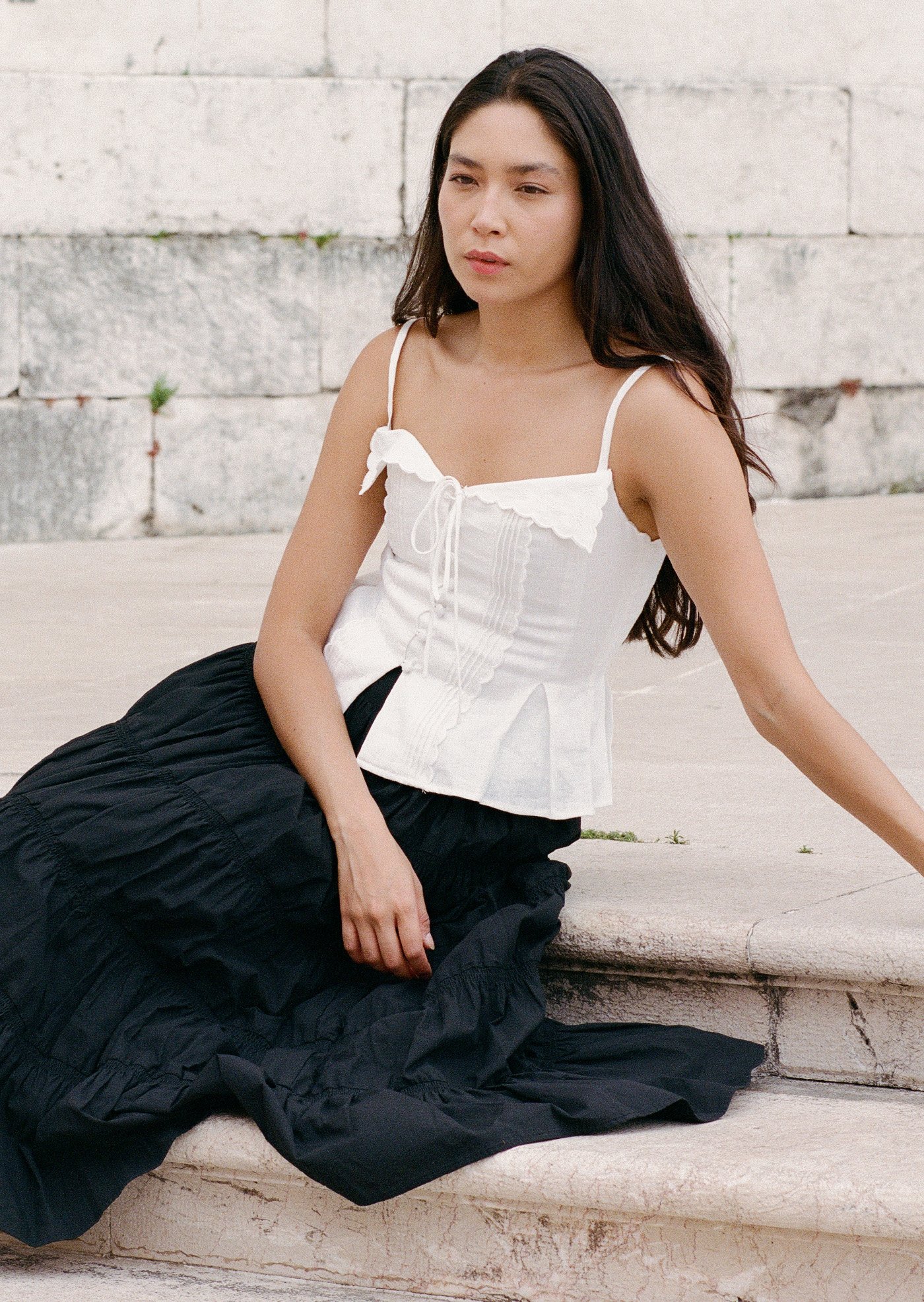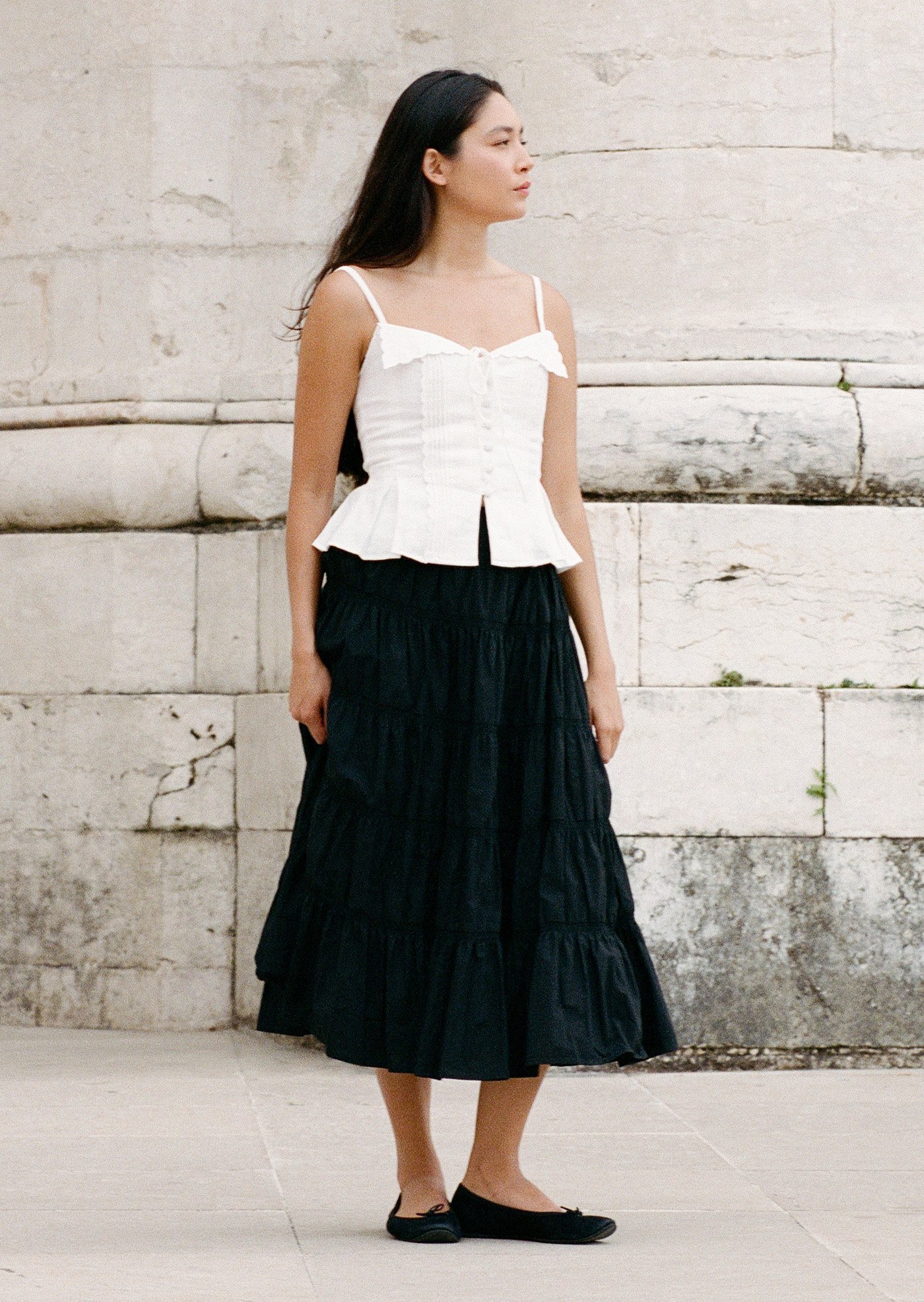 The Ozzy Peplum Top is a vintage-inspired piece crafted from breathable linen, featuring a scalloped neckline, pintuck details, and a soft peplum flare. Finished with fabric-covered buttons and adjustable straps, it’s an effortlessly romantic addition to warm-weather dressing.
