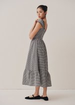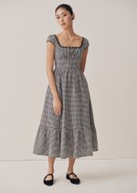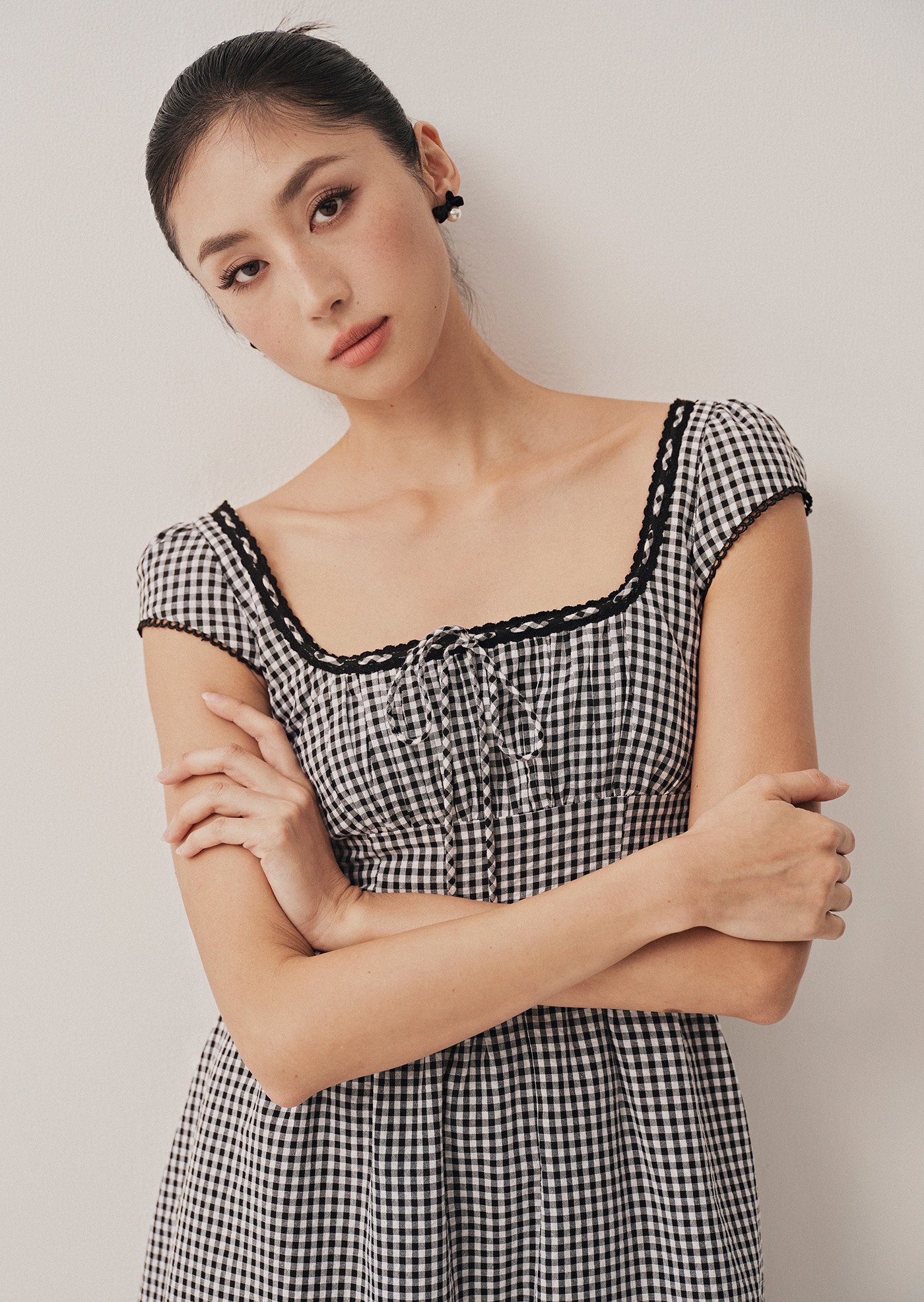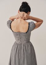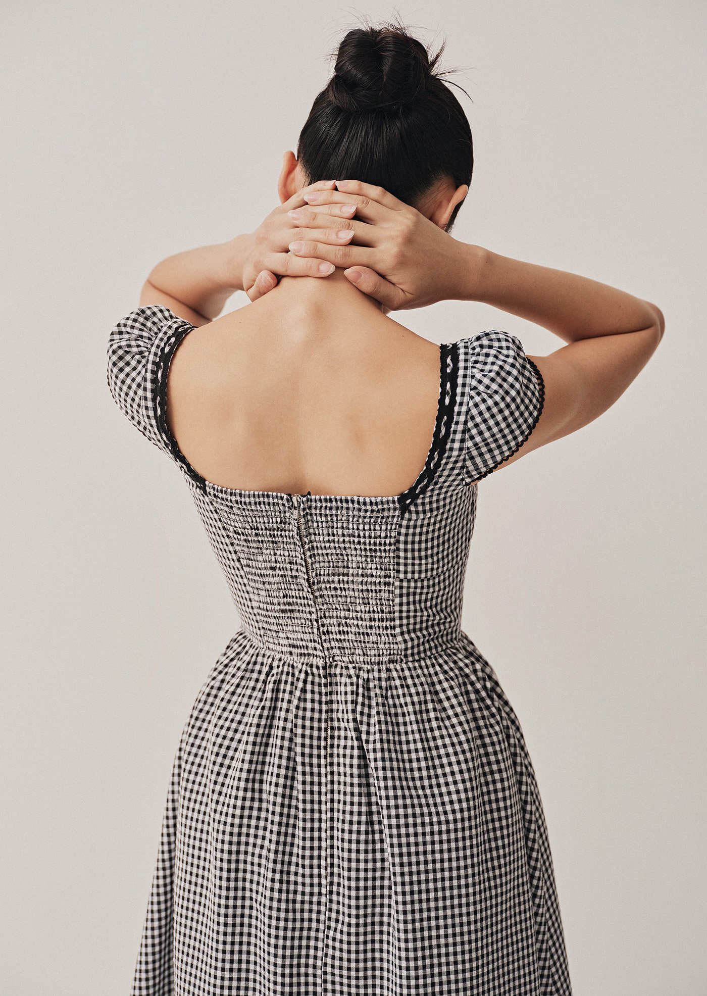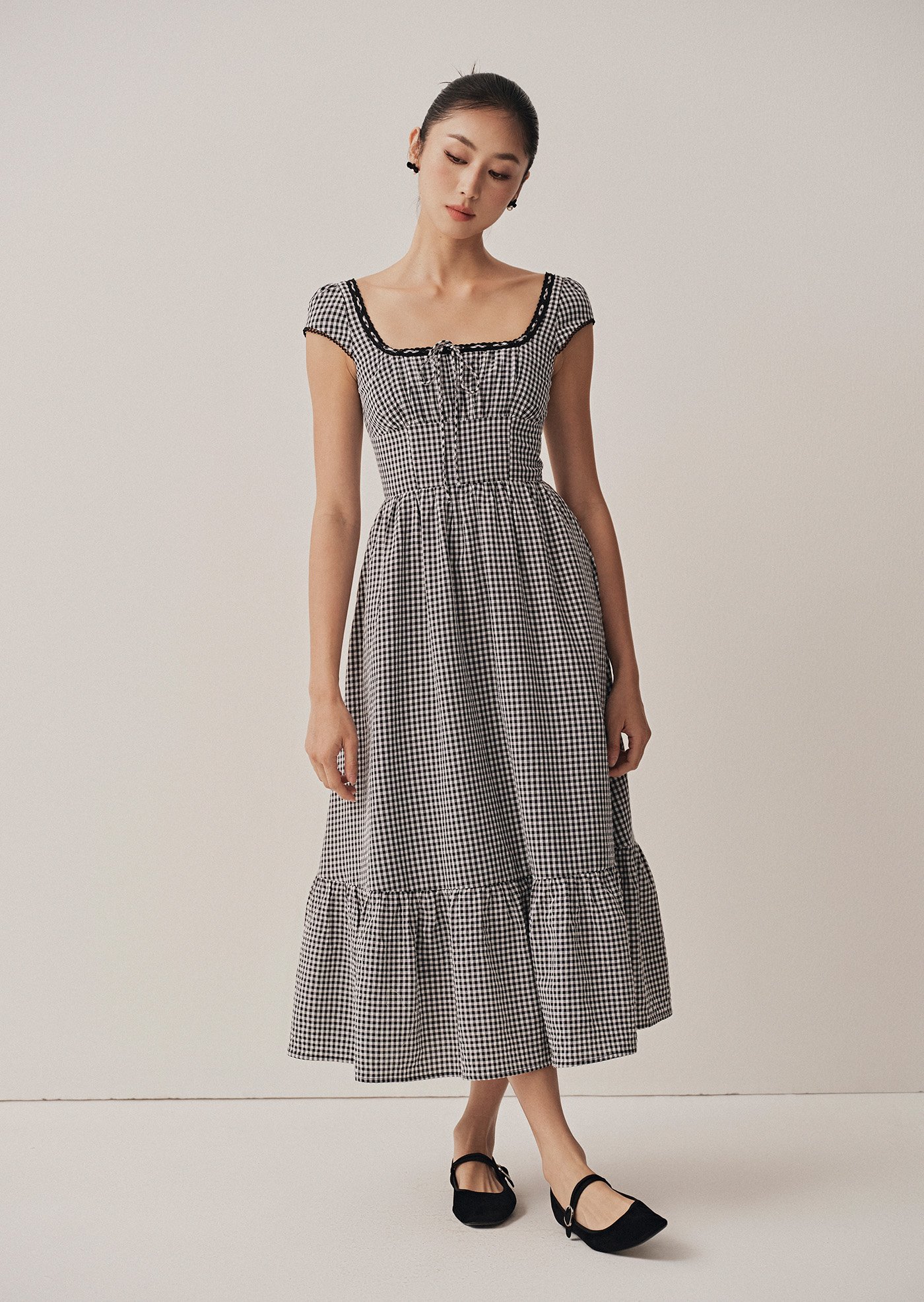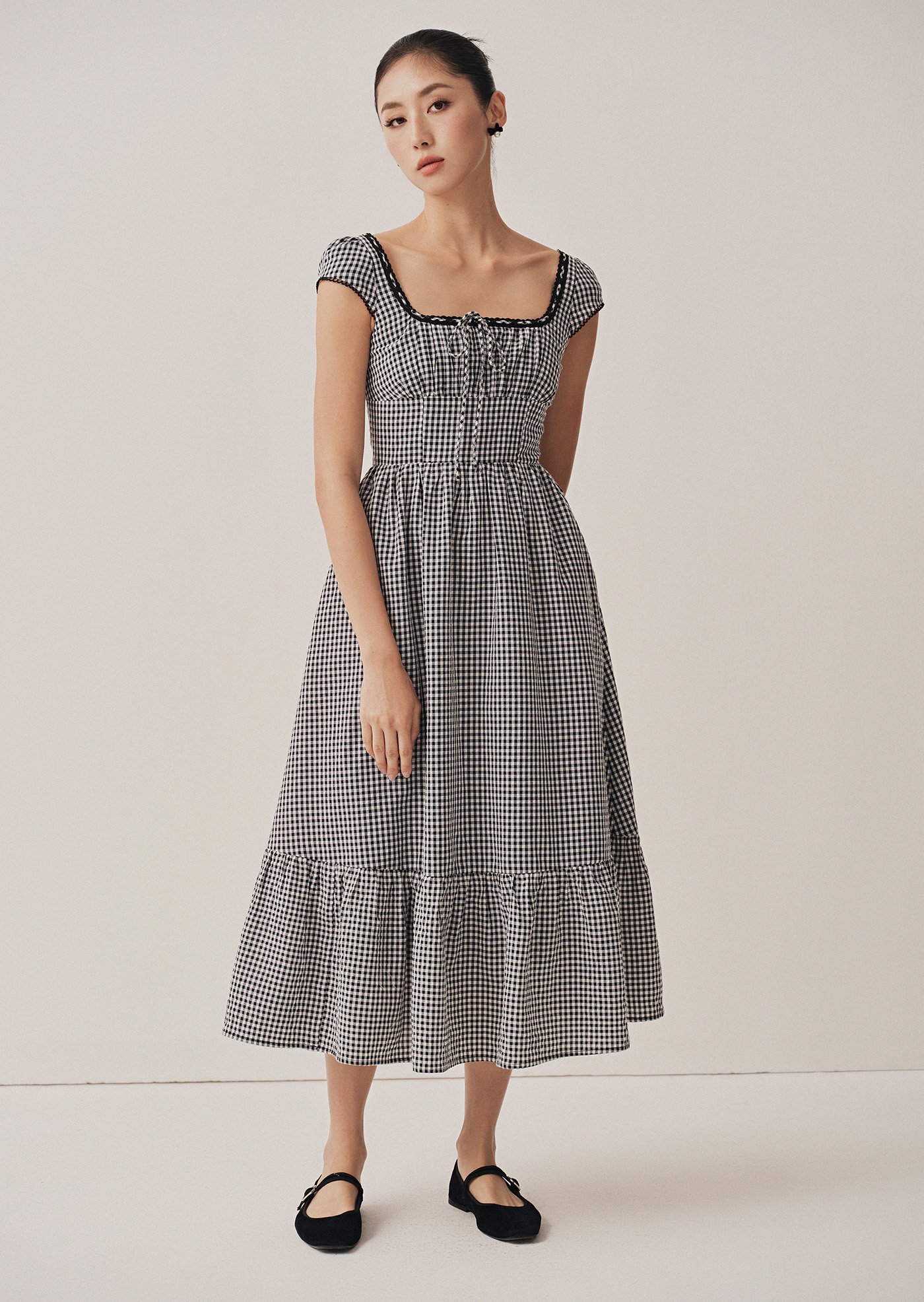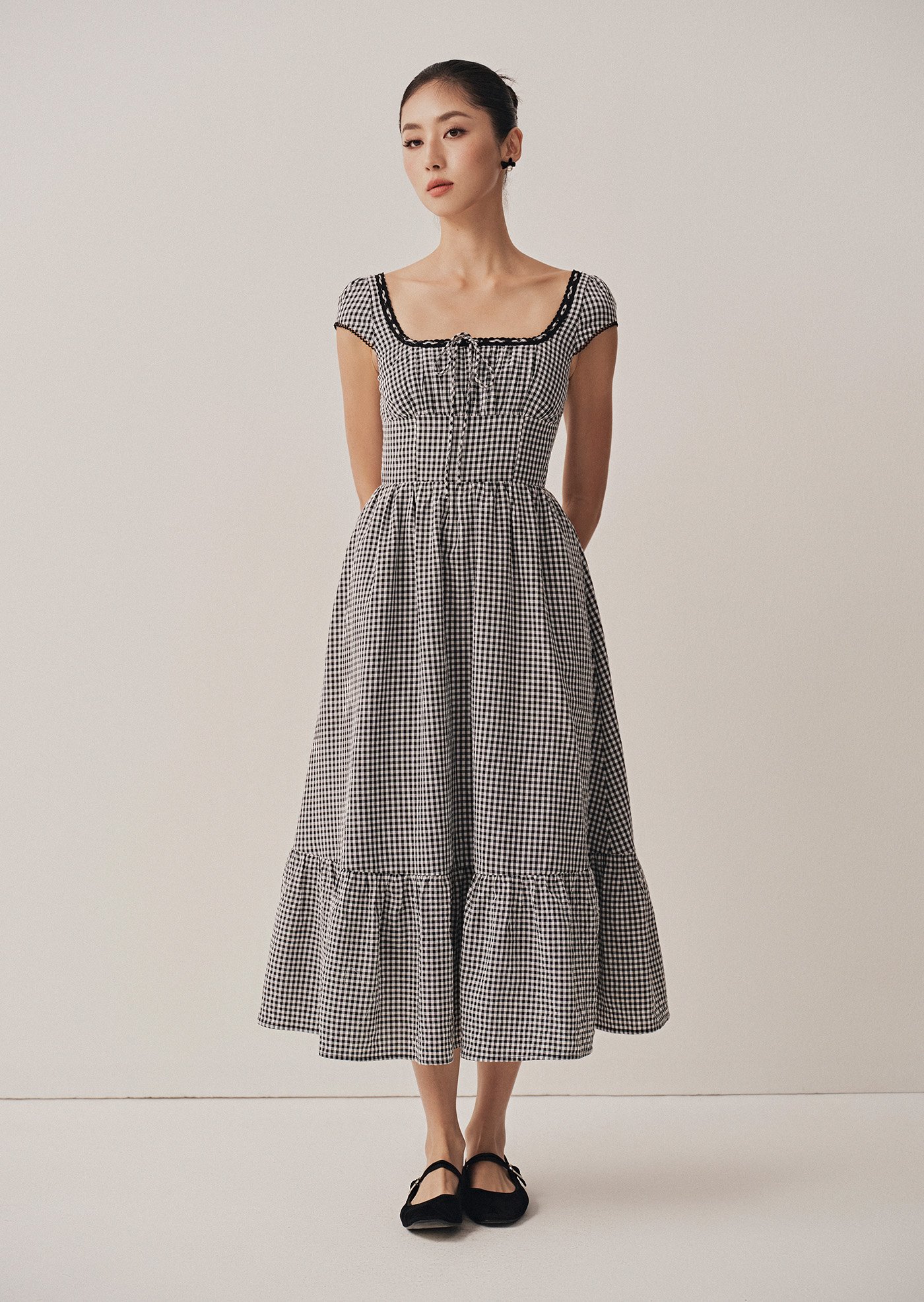 The Cottage Midi Dress features a square neckline with lace trim, bow detail, and a fitted bodice that flows into a tiered midi skirt. Rendered in classic gingham with hidden pockets, it’s a romantic yet easy piece for everyday wear.