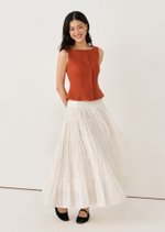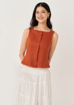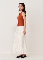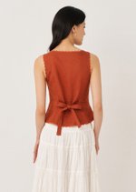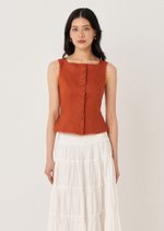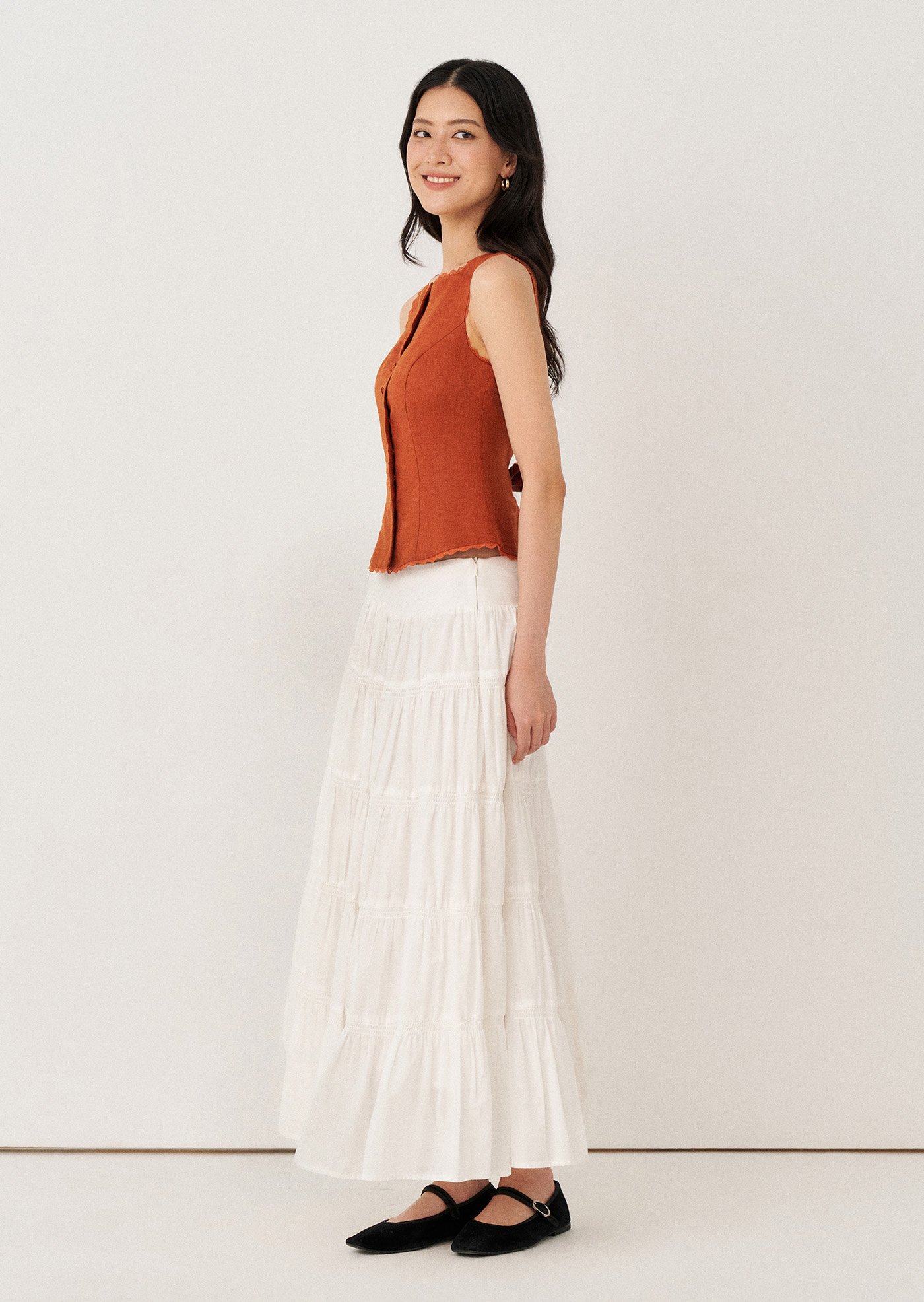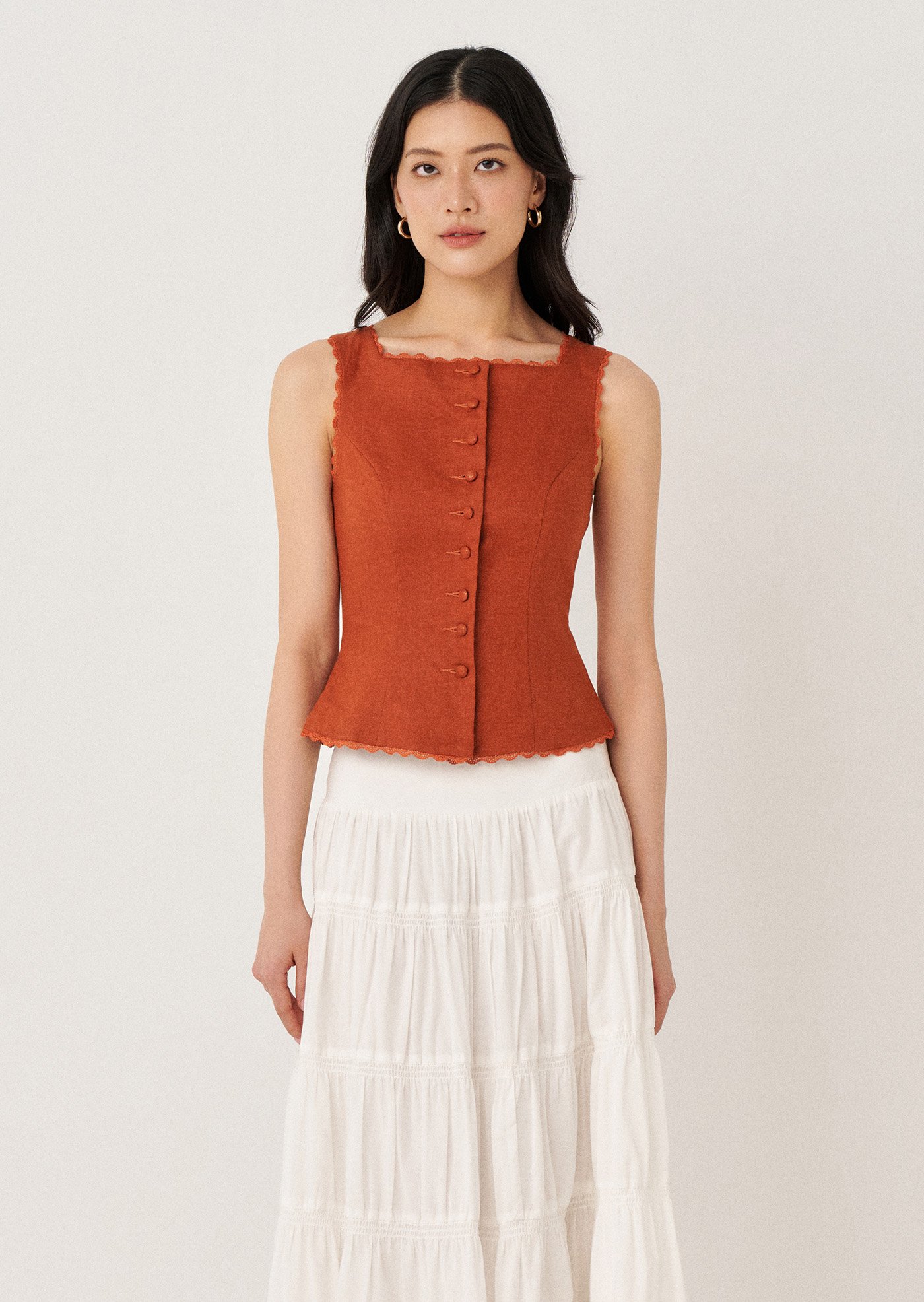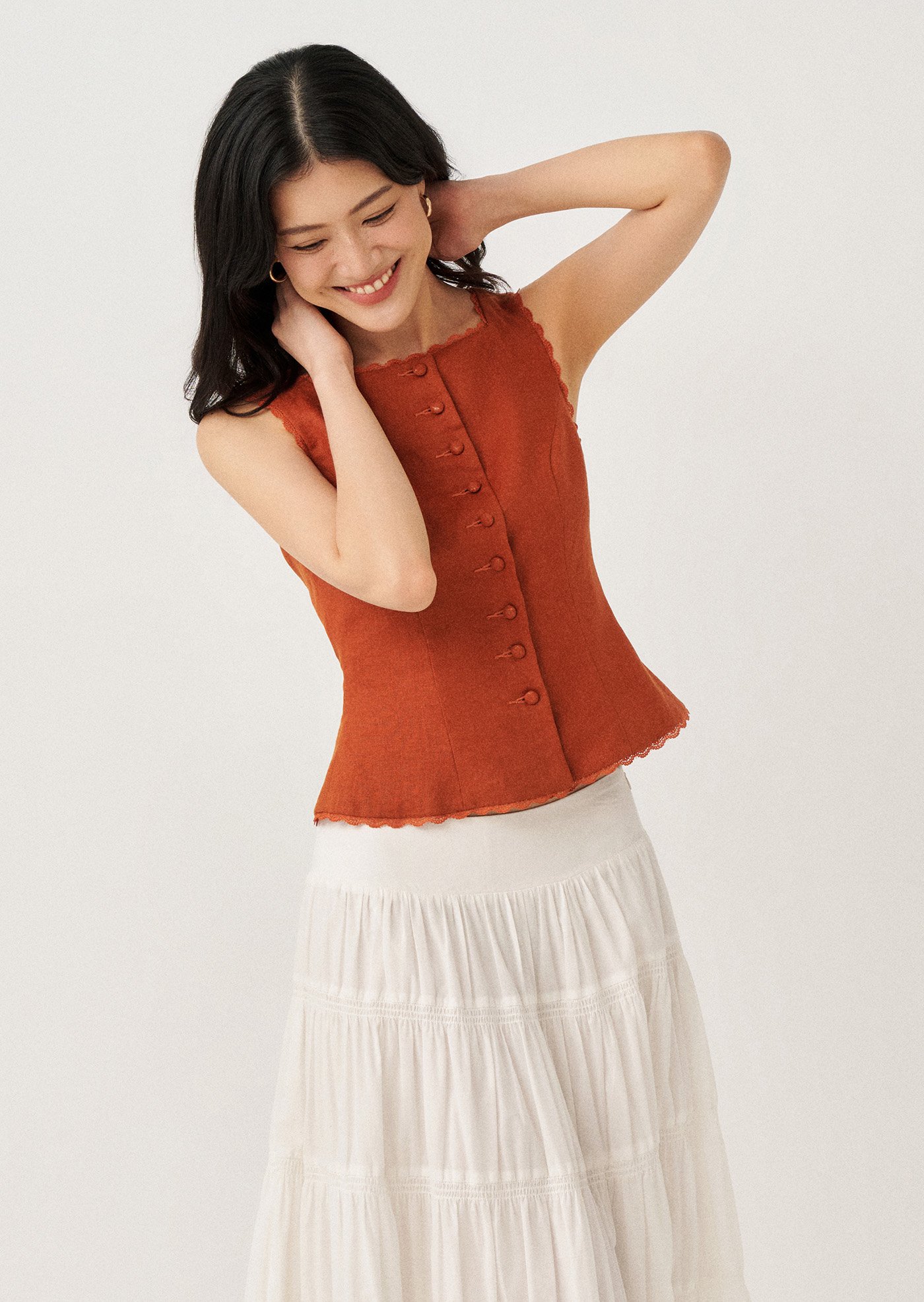 With its delicate scalloped edges and covered buttons, the Perri Top brings a quiet charm to warm-weather dressing. Pair it with a full skirt or high-rise trousers for a look that’s both timeless and effortless.