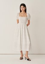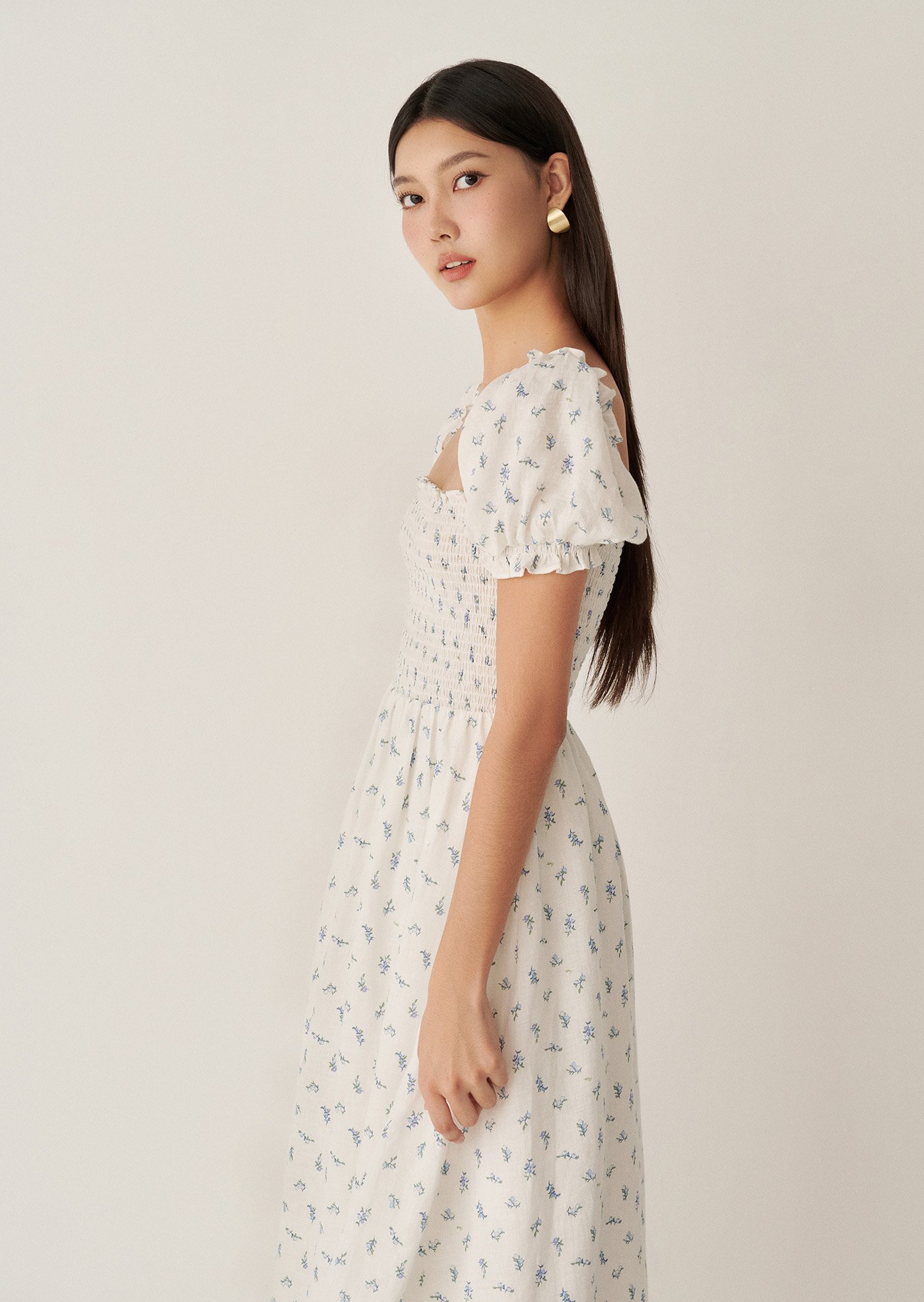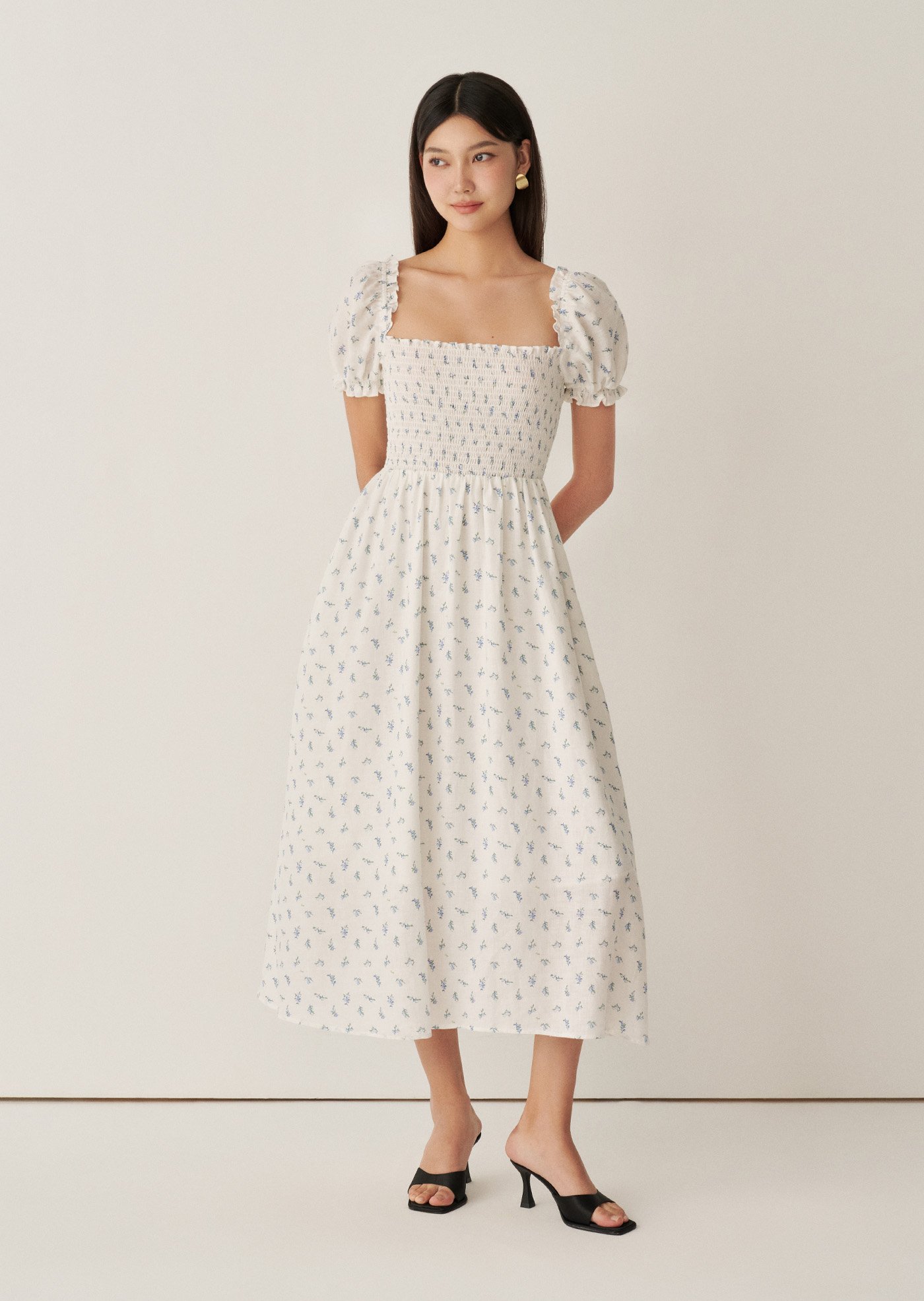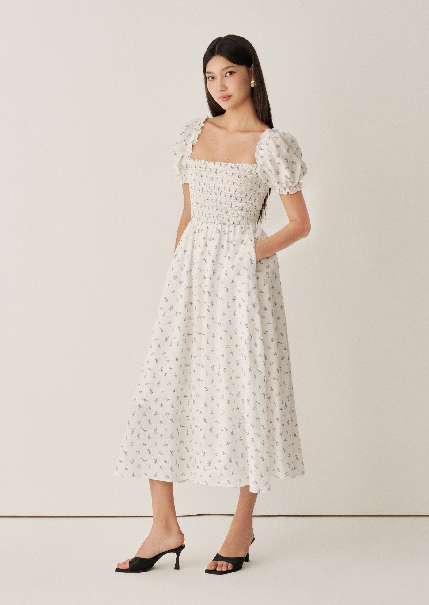 The Quincy Midi Dress is soft, flattering, and effortlessly timeless. Designed with a smocked bodice that hugs comfortably and puff sleeves that add gentle volume, it flows into a relaxed midi skirt that feels light and easy on the body. A piece made for everyday wear, from slow mornings to long afternoons.