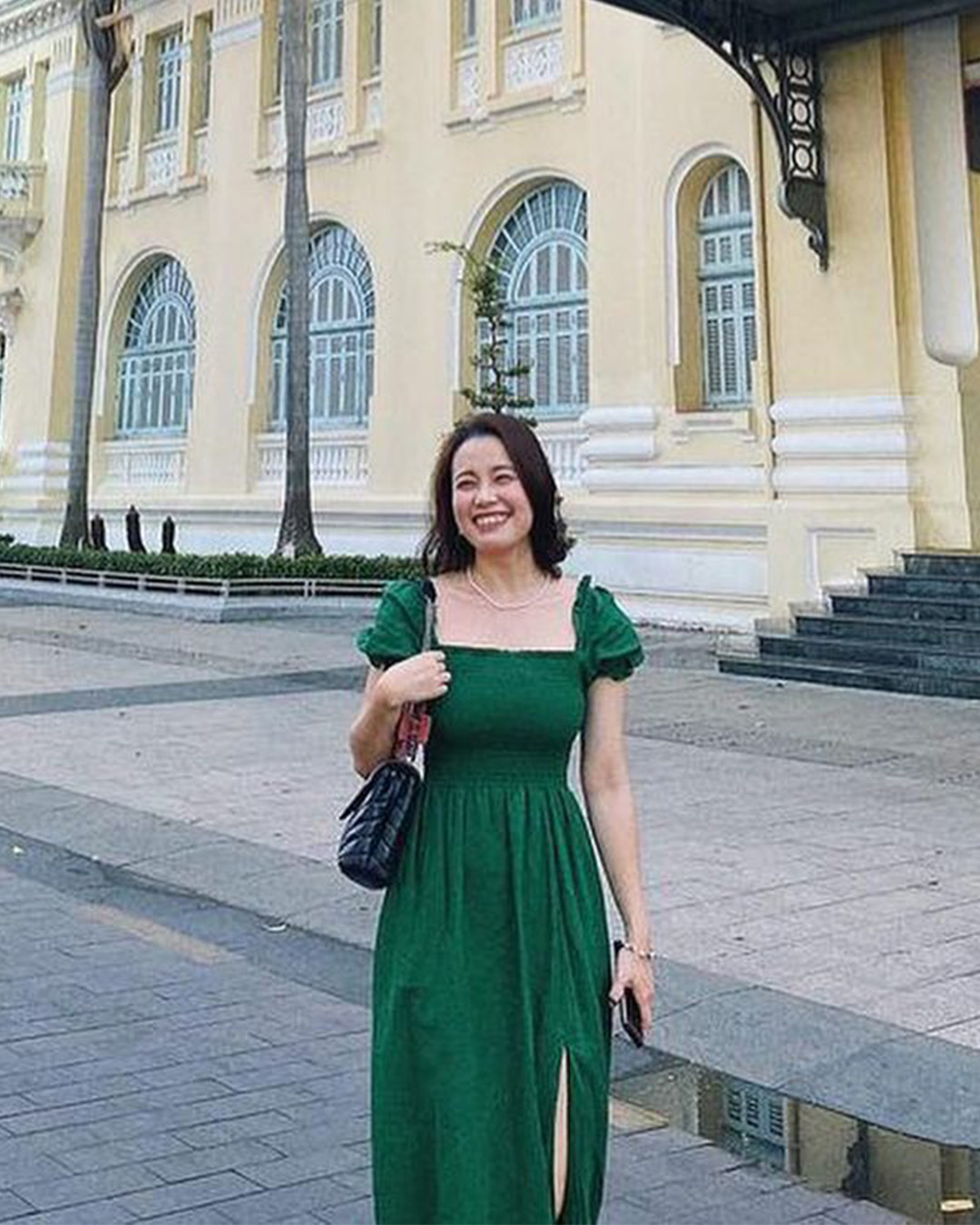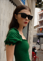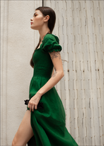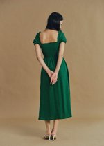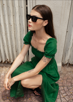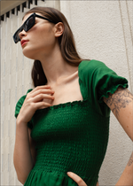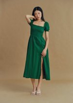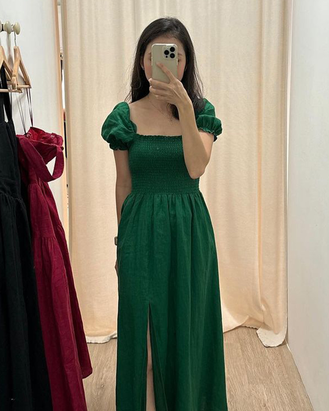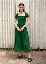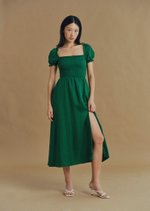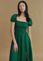 The Quinn Midi dress is a midi-length dress with a straight neckline, a fully smocked bodice and a side slit.