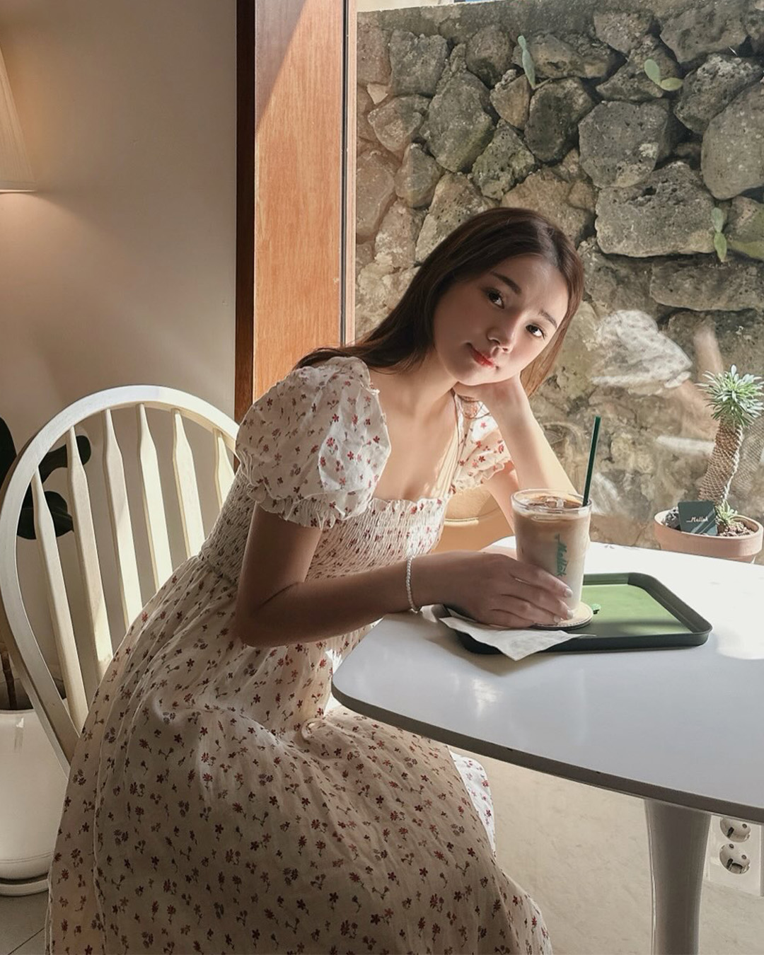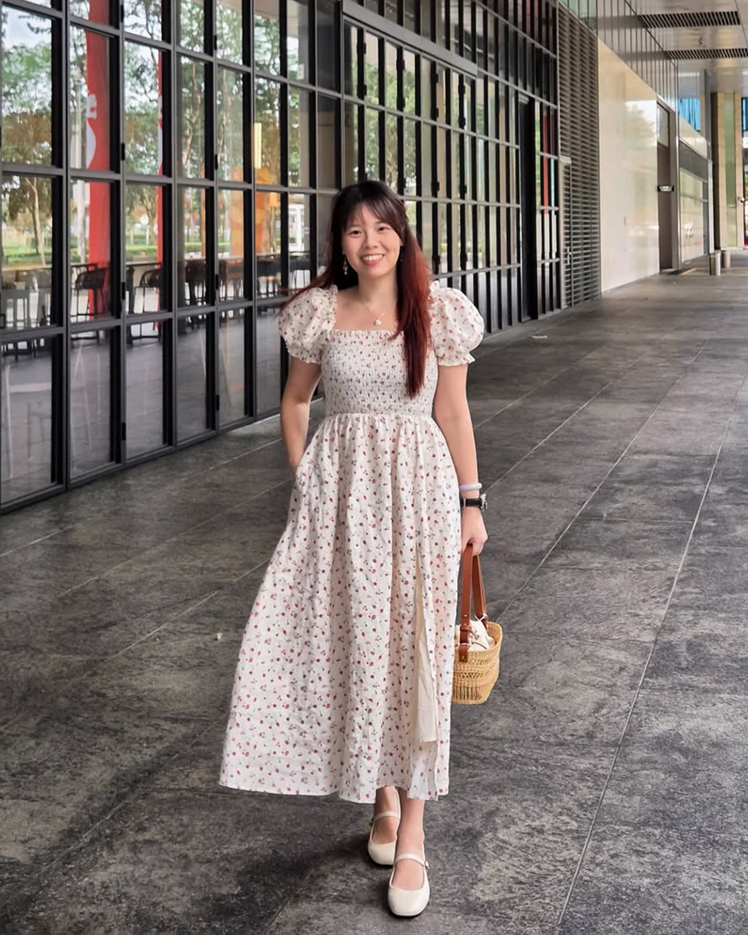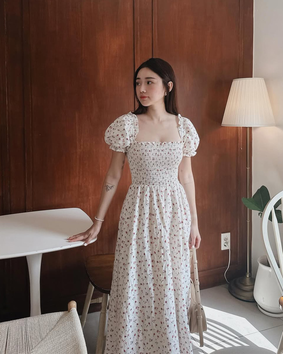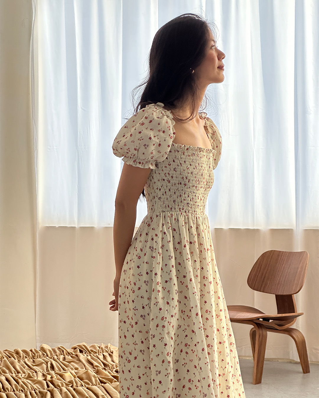 The Quinn Midi dress is a midi-length dress with a straight neckline, a fully smocked bodice and a side slit.