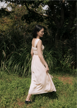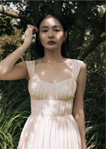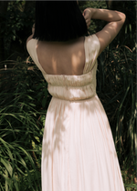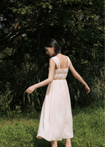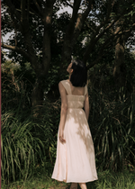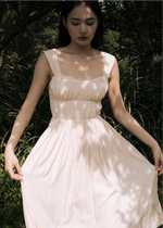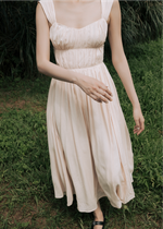 The Jeslin midi dress features a sweetheart neckline with gathered detailing down the dress. It has a ruched bodice with side smocked panels.